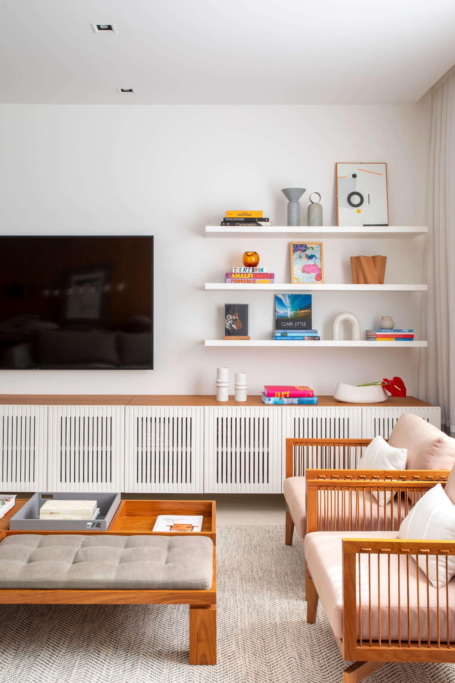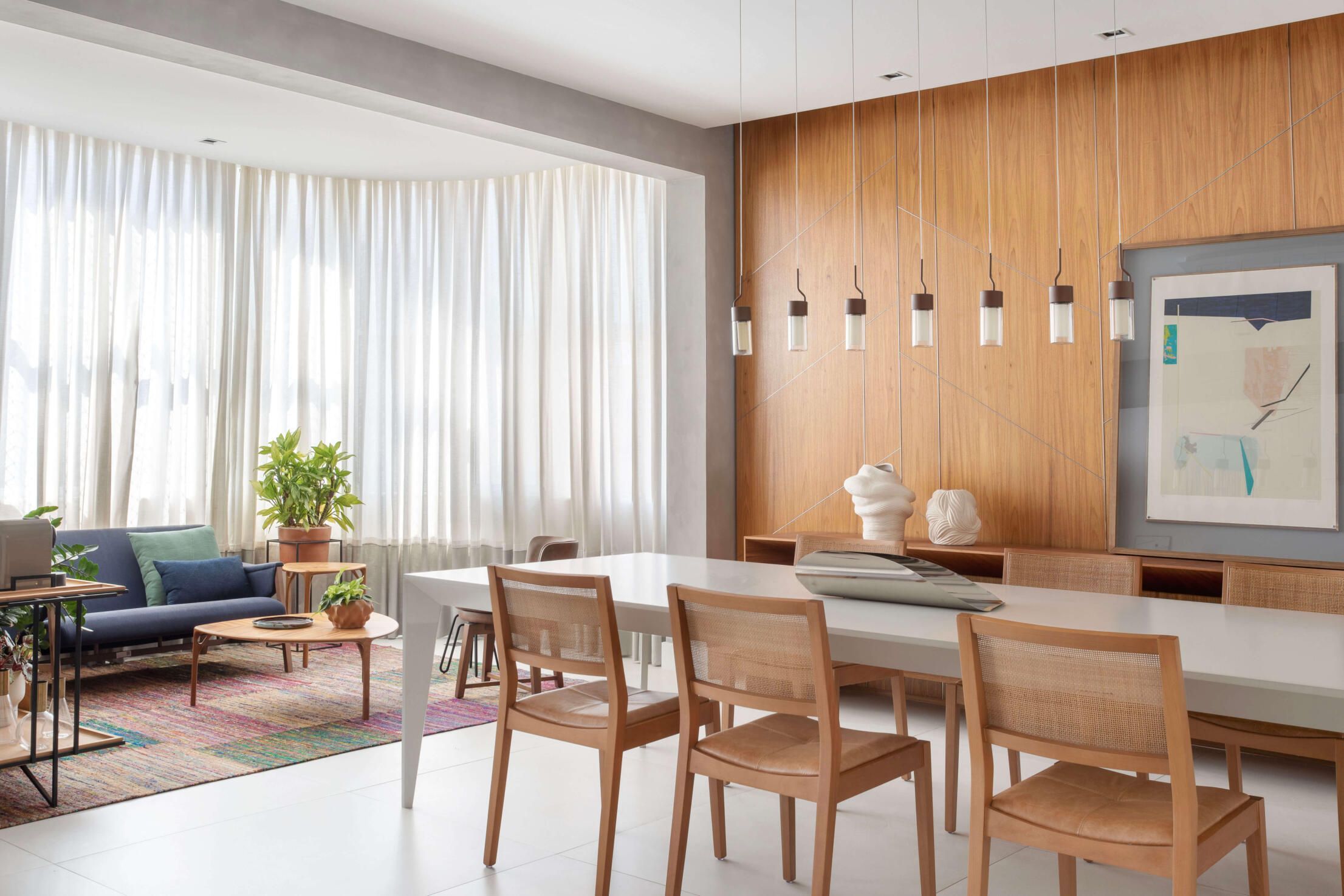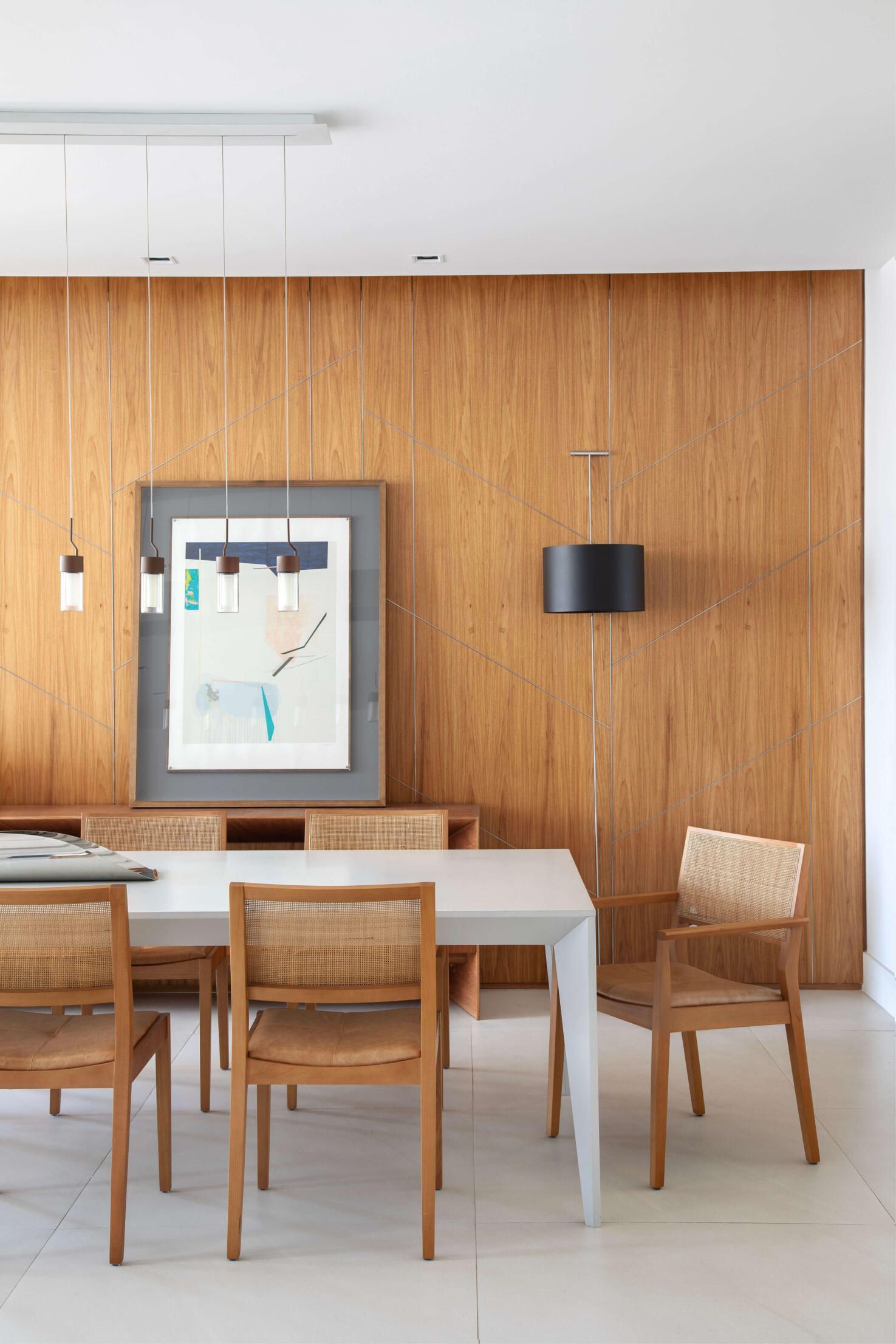 Na área de jantar, a arquiteta destaca o painel de madeira natural que reveste a parede ao fundo, com aplicação de frisos fininhos de aço que formam desenhos geométricos sutis, e, no living com tv, o tapete com trama chevron em relevo, em tom off white com detalhe em preto.