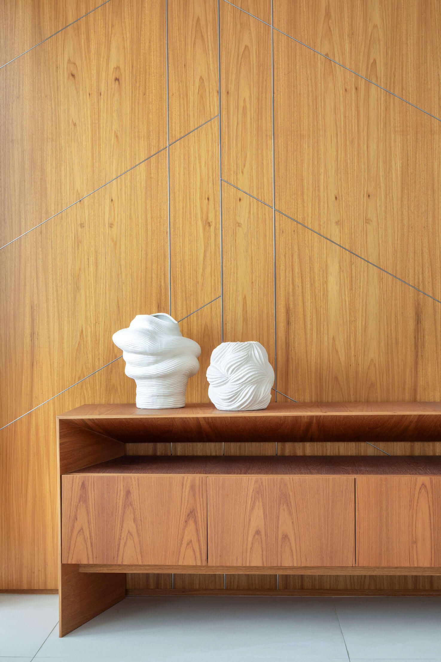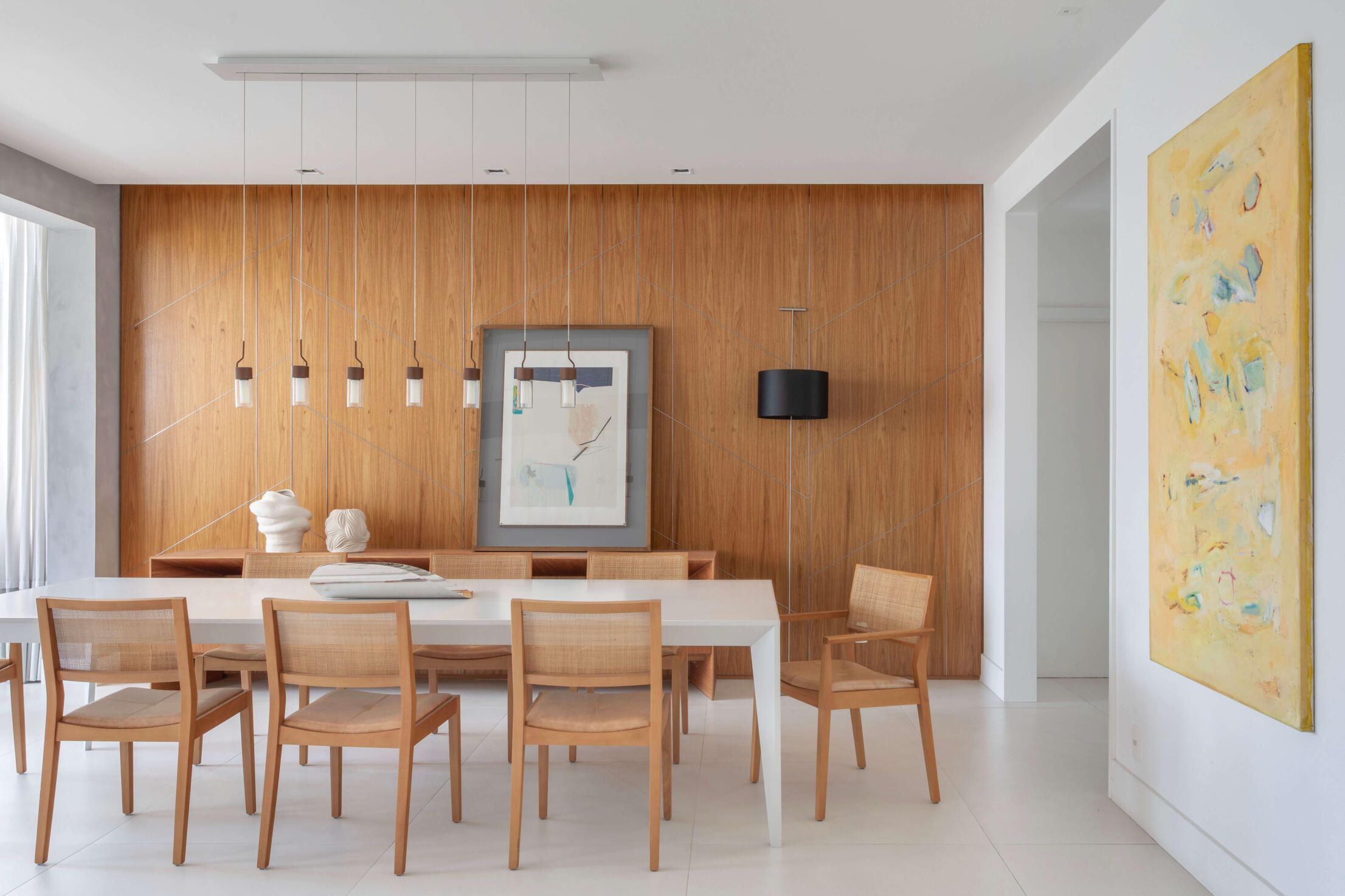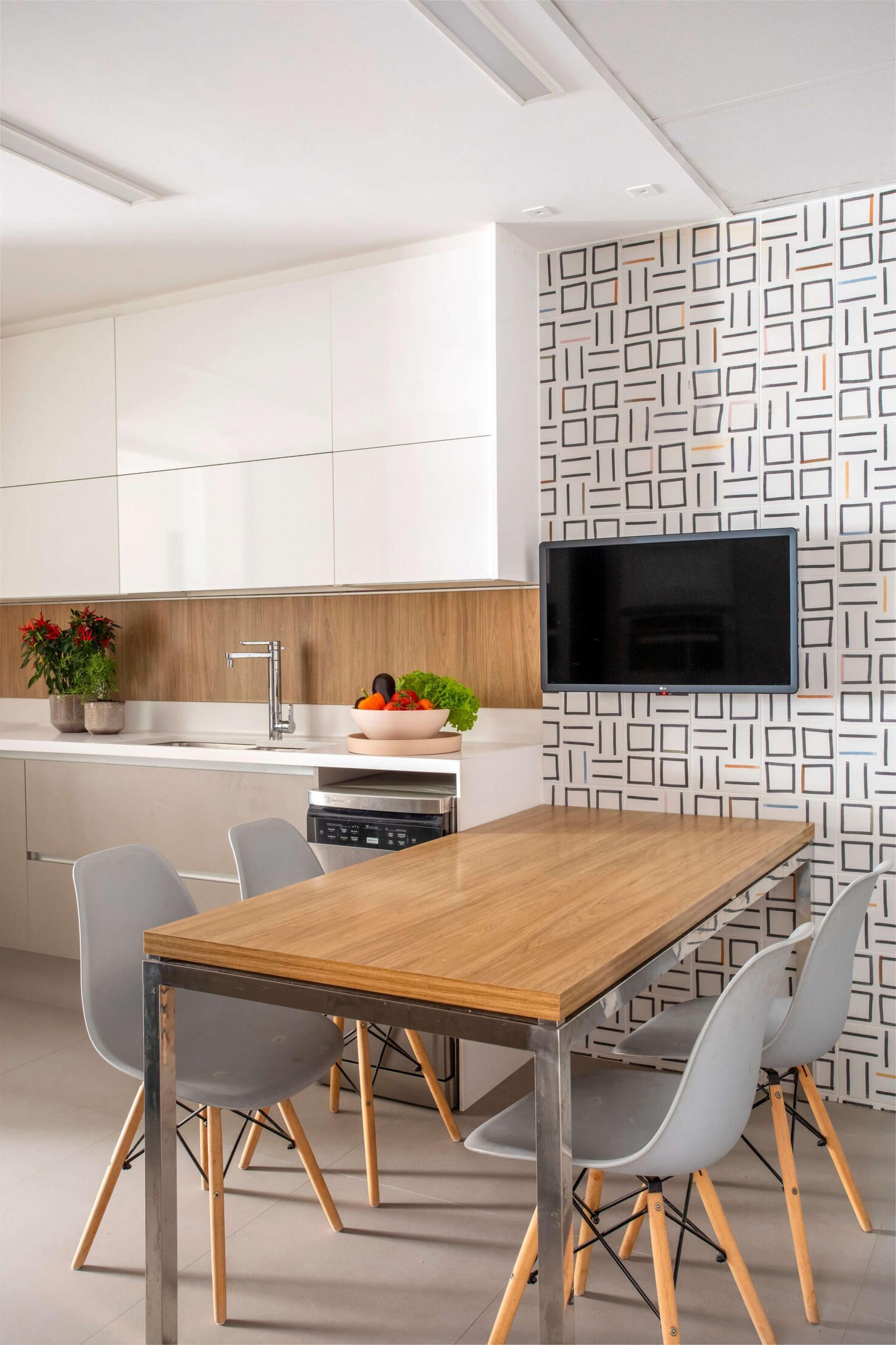 Na área de jantar, a arquiteta destaca o painel de madeira natural que reveste a parede ao fundo, com aplicação de frisos fininhos de aço que formam desenhos geométricos sutis, e, no living com tv, o tapete com trama chevron em relevo, em tom off white com detalhe em preto.