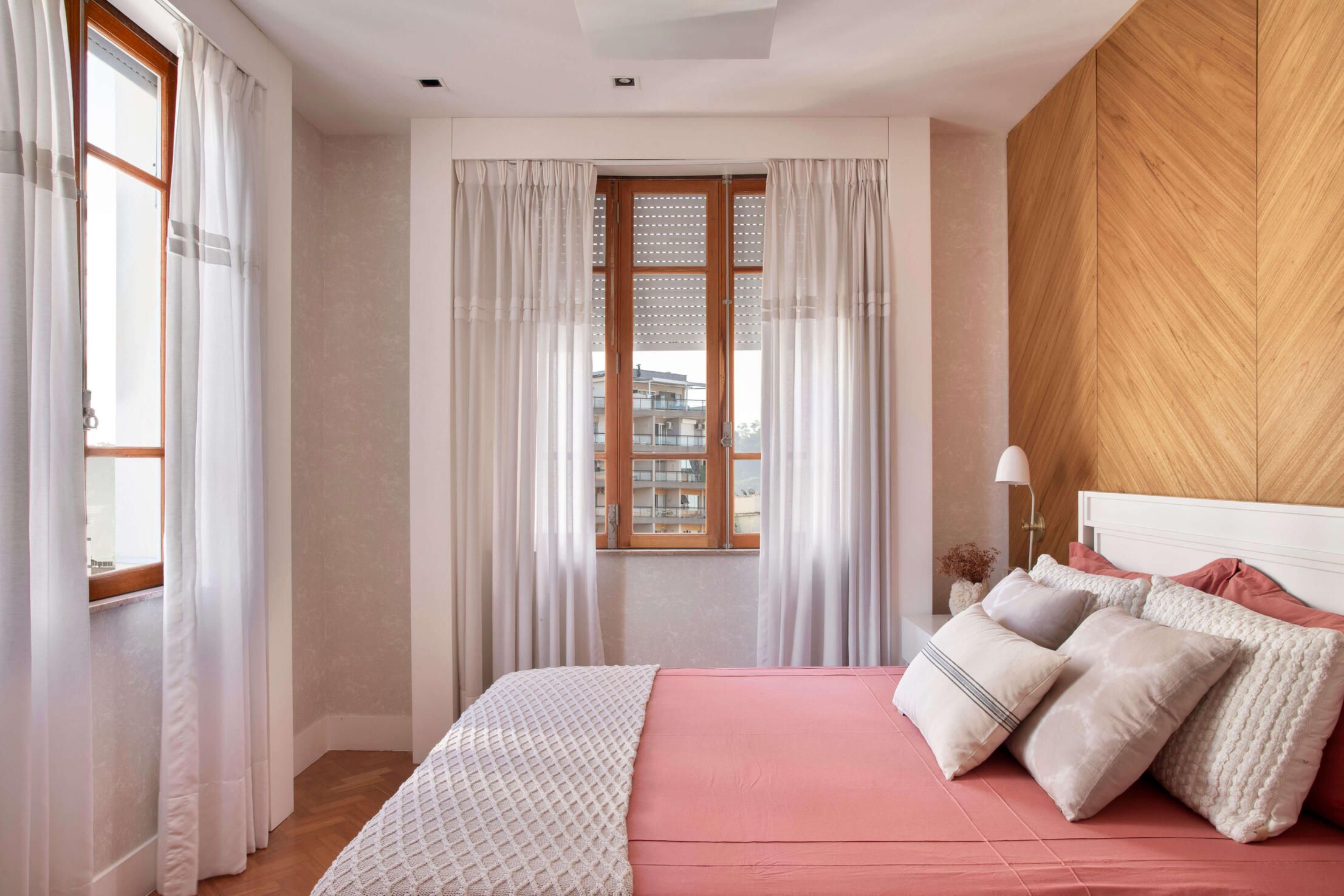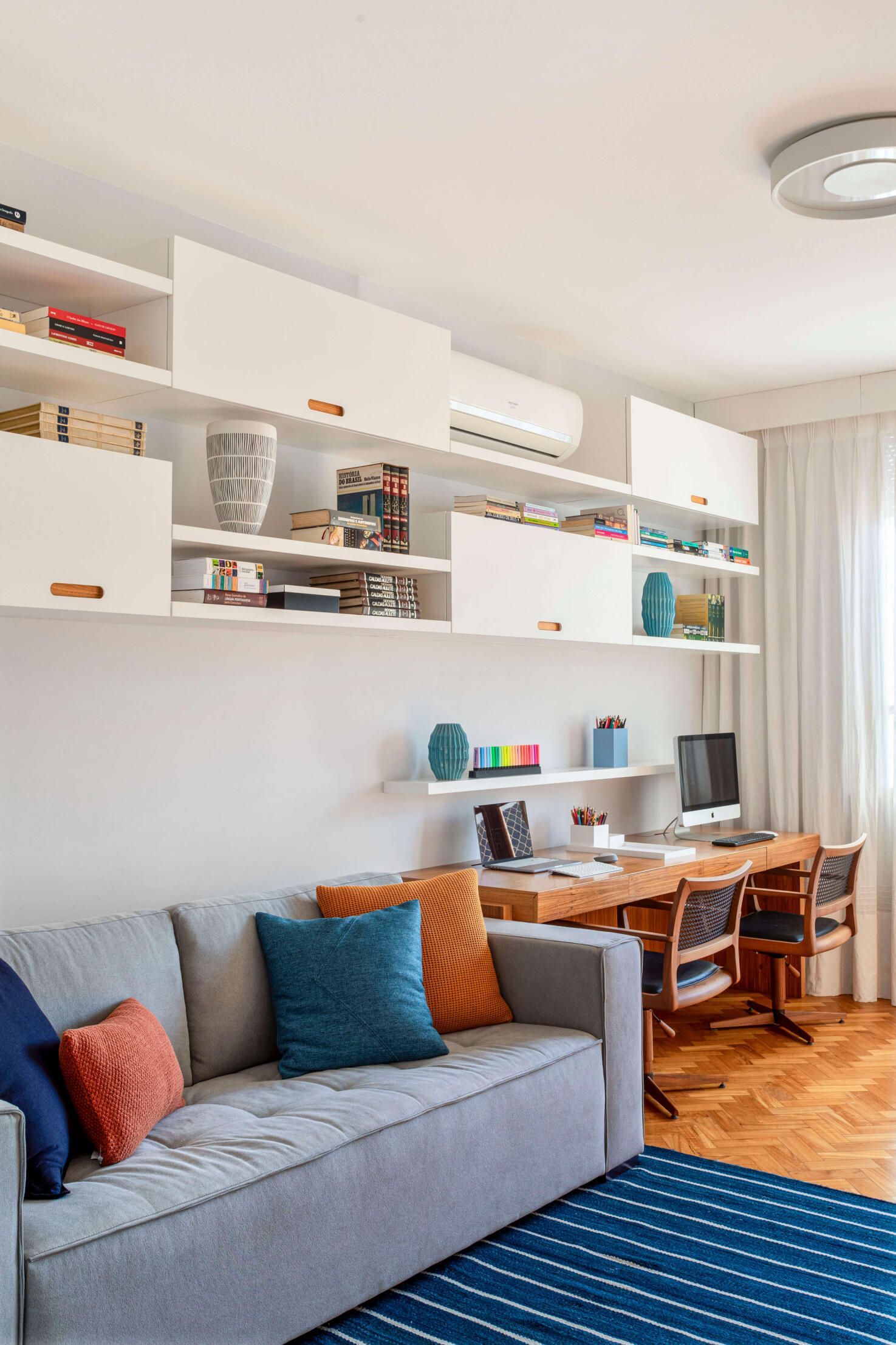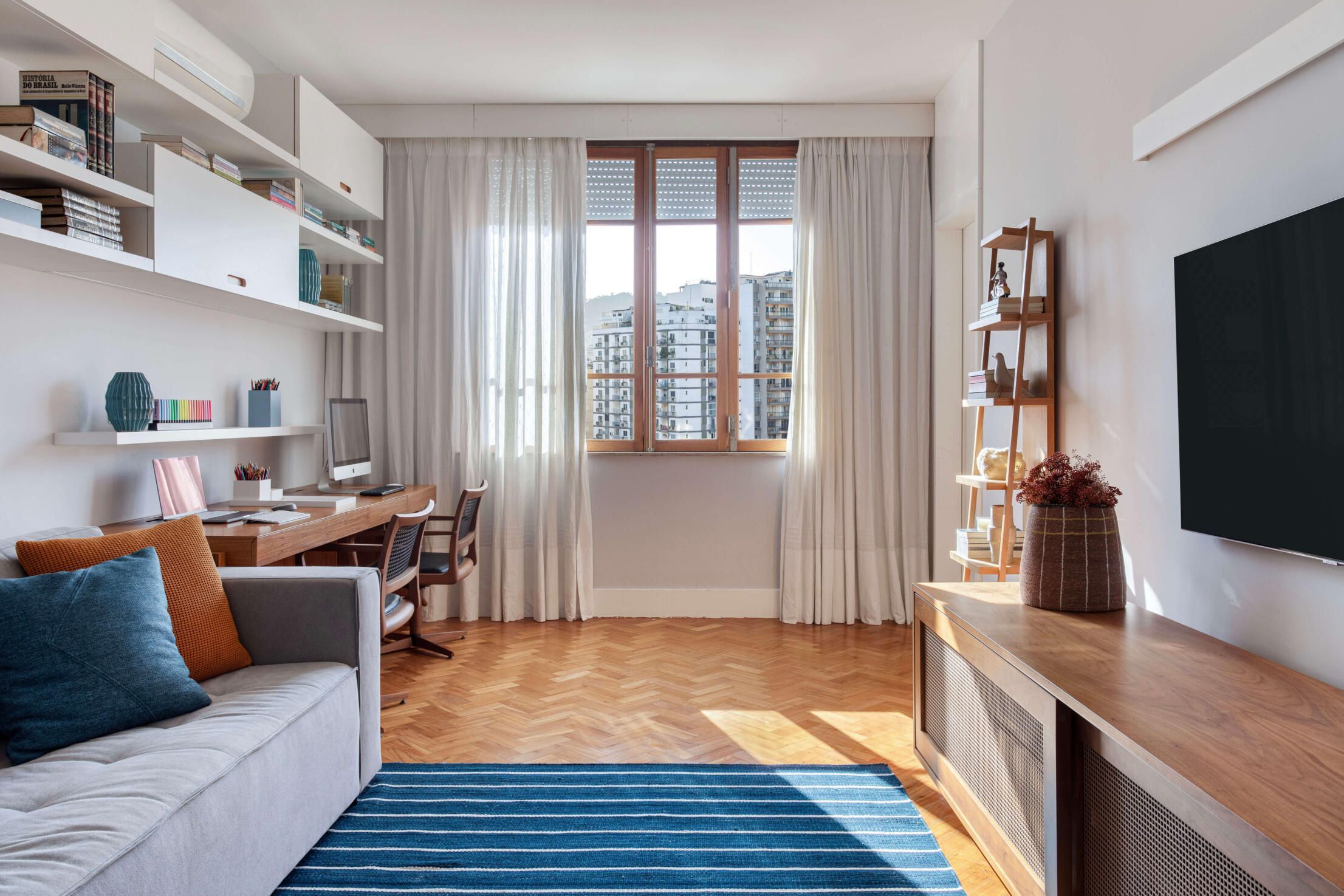 Já no quarto do casal, o grande destaque é o painel de freijó natural atrás da cama, com lâminas aplicadas em diagonal para criar um efeito de espinha-de-peixe. Outros detalhes que se destacam nesse cômodo são as esquadrias em peroba-do-campo, originais do prédio, que a arquiteta conseguiu restaurar e manter. No escritório, que também funciona como quarto de hóspedes, além da esquadria, o piso original em taco de peroba-do-campo também foi recuperado.