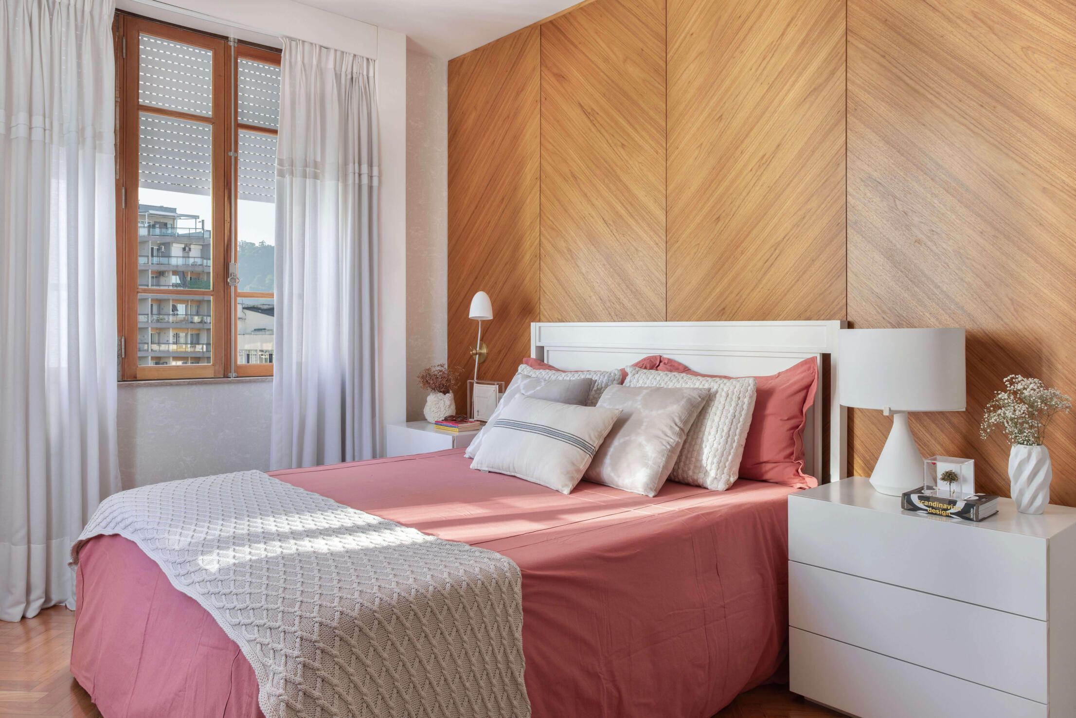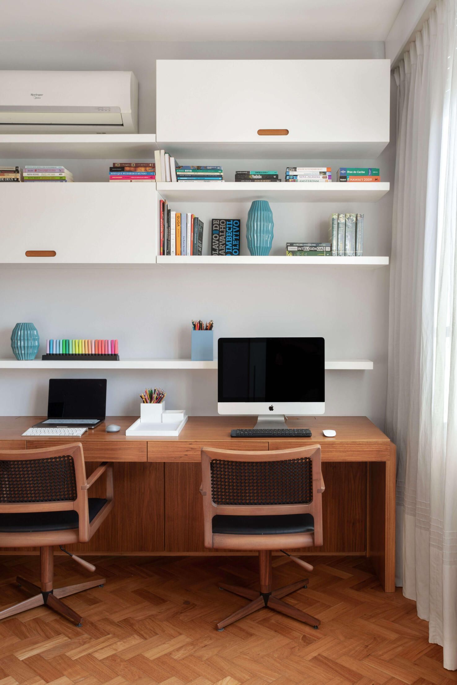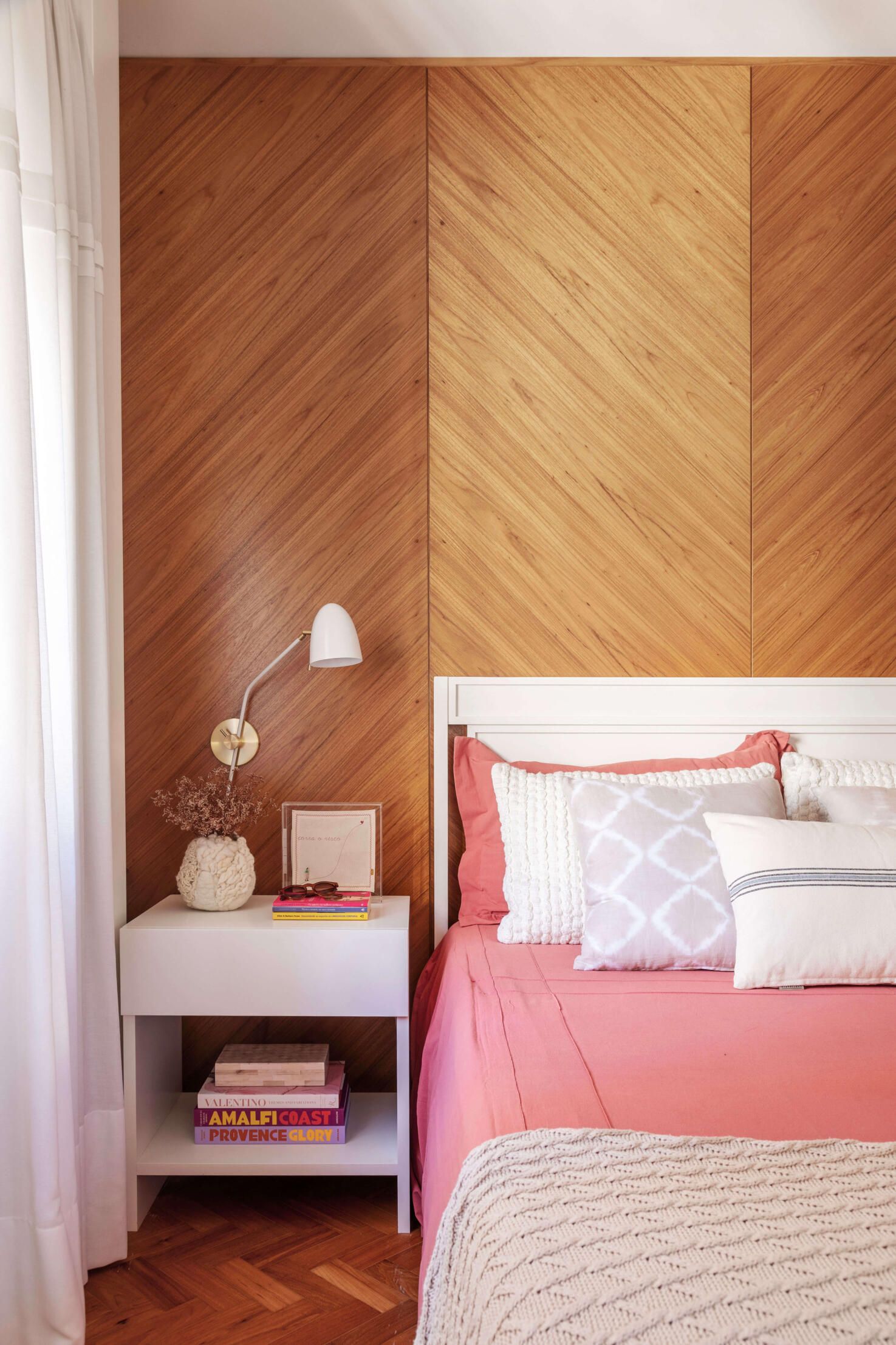 Já no quarto do casal, o grande destaque é o painel de freijó natural atrás da cama, com lâminas aplicadas em diagonal para criar um efeito de espinha-de-peixe. Outros detalhes que se destacam nesse cômodo são as esquadrias em peroba-do-campo, originais do prédio, que a arquiteta conseguiu restaurar e manter. No escritório, que também funciona como quarto de hóspedes, além da esquadria, o piso original em taco de peroba-do-campo também foi recuperado.