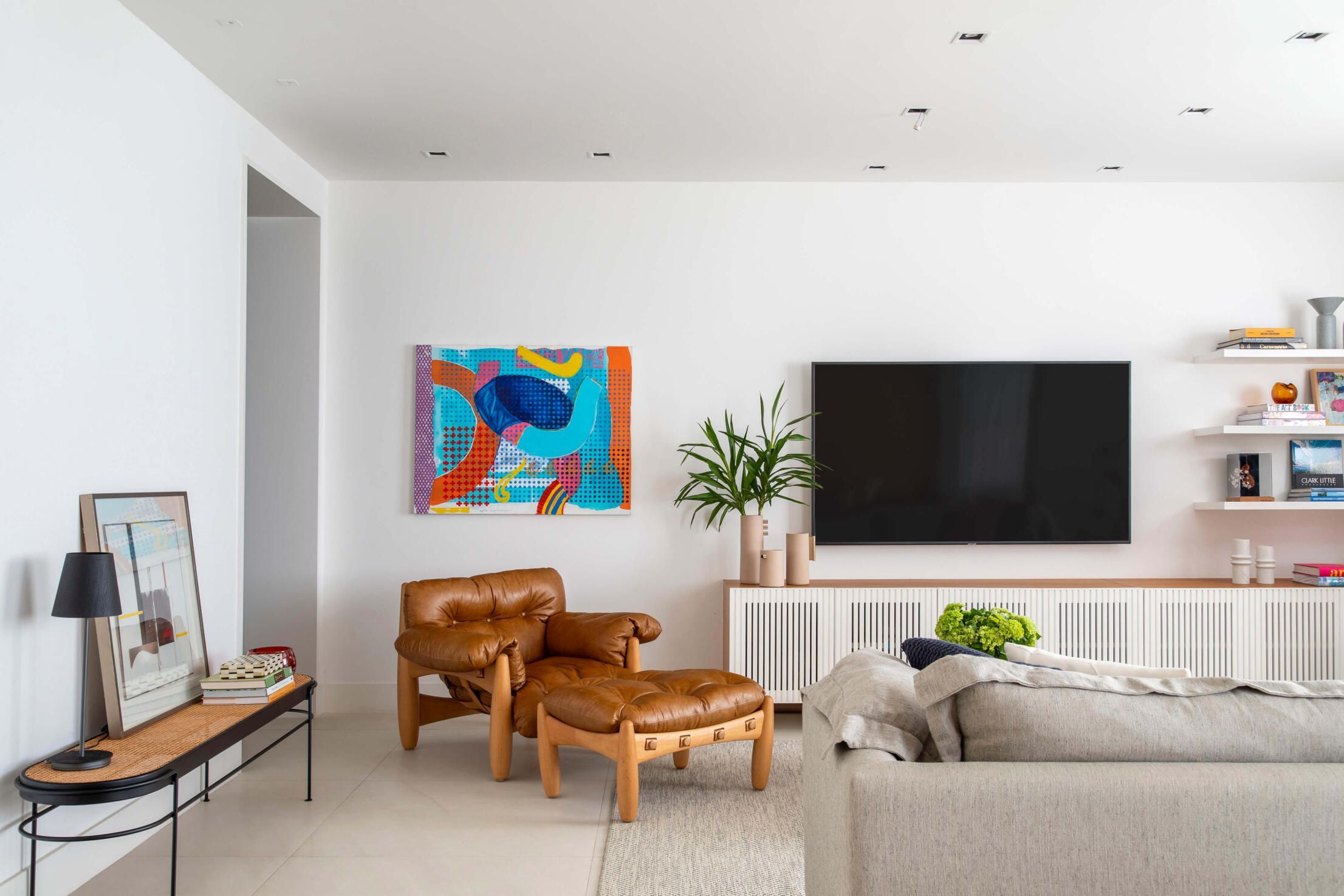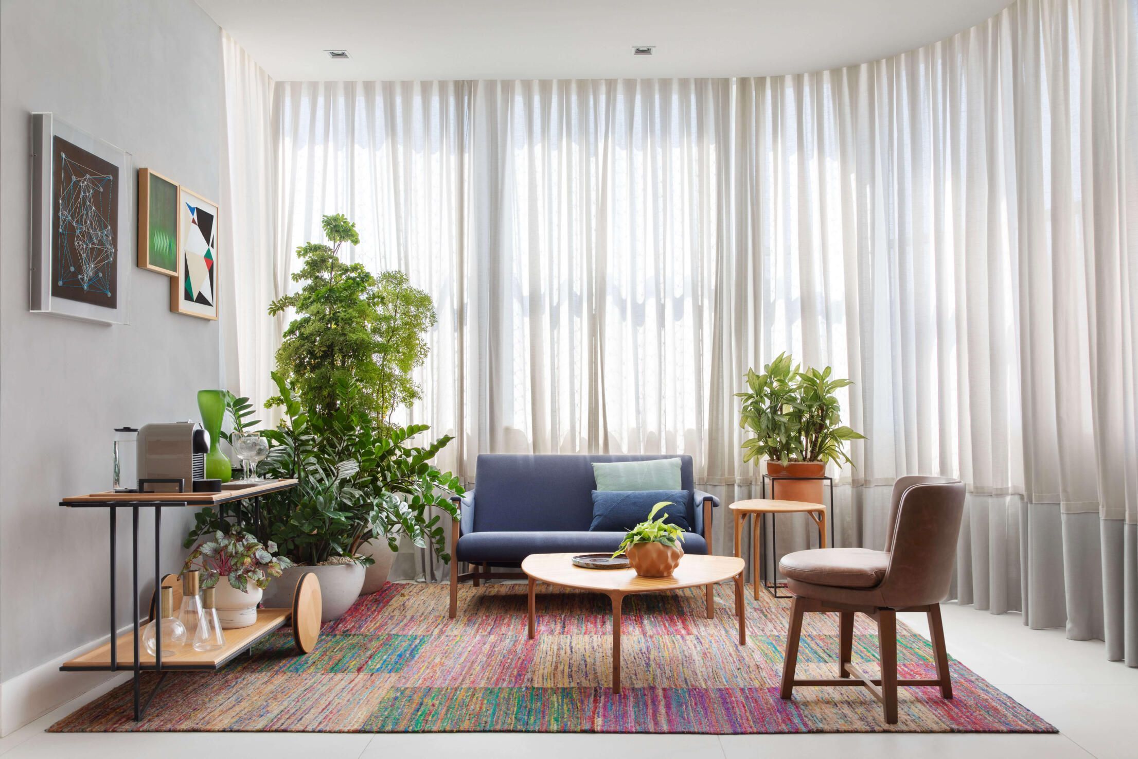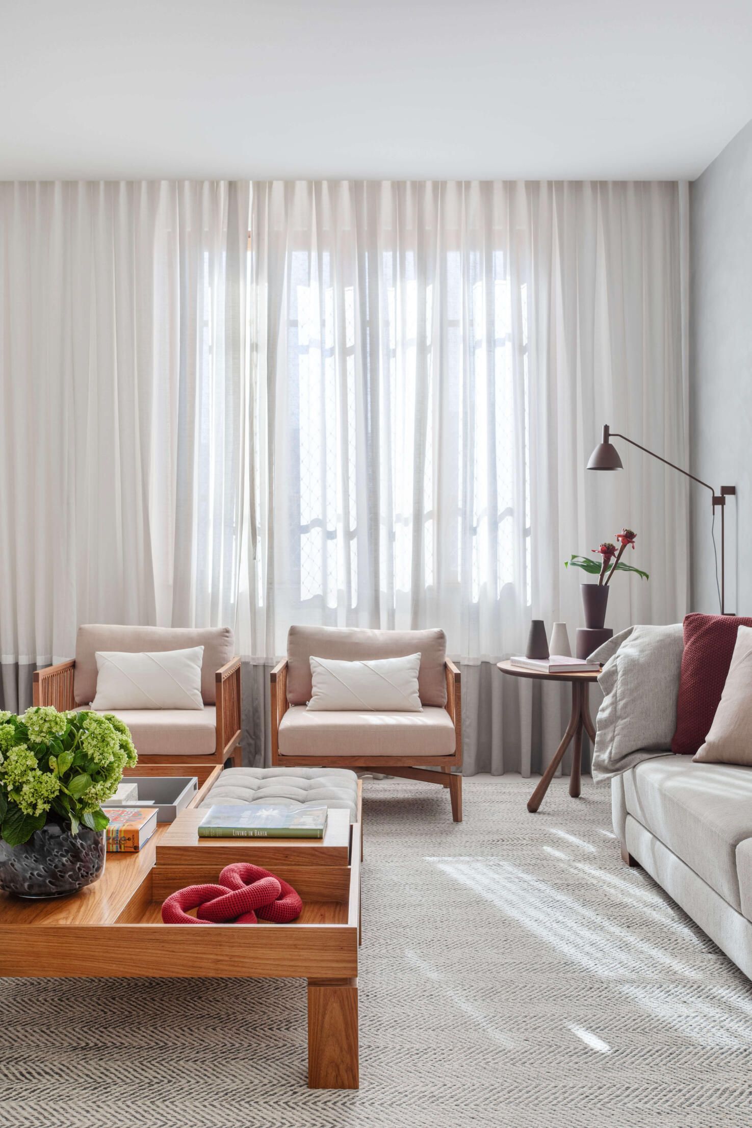 Também se destacam na sala as poltronas Isabel e a mesa de centro Rosá da designer Maria Cândida Machado, o banquinho Philips, o buffet Chan e a namoradeira Isa do Jader Almeida, o banco Iaiá do Gustavo Bittencourt, as mesas de centro e de apoio Zaha de Aristeu Pires, e as luminárias pendentes Lanterna e de piso Lift de Fernando Prado.