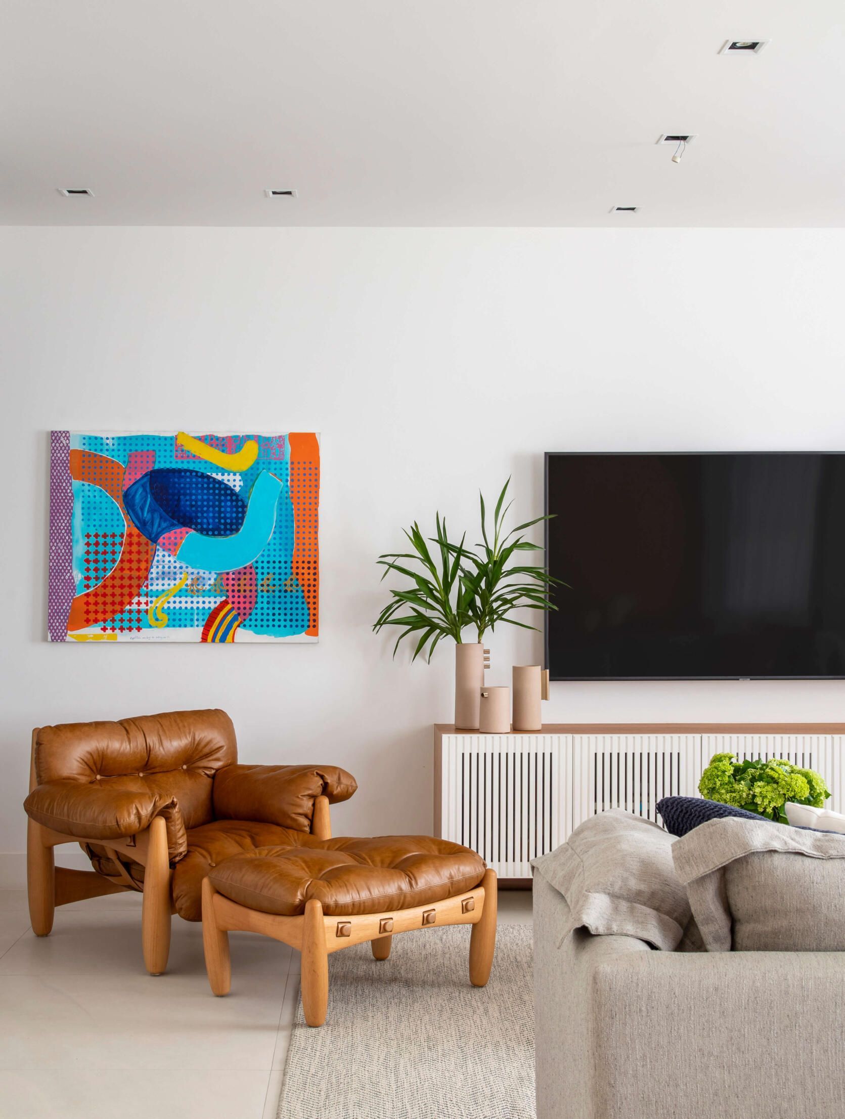 Indicamos para a sala, por exemplo, a poltrona Tetê, do Sergio Rodrigues, mas o cliente preferiu a Mole, do mesmo designer.