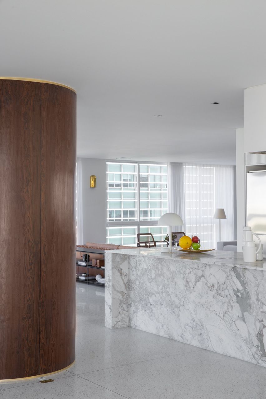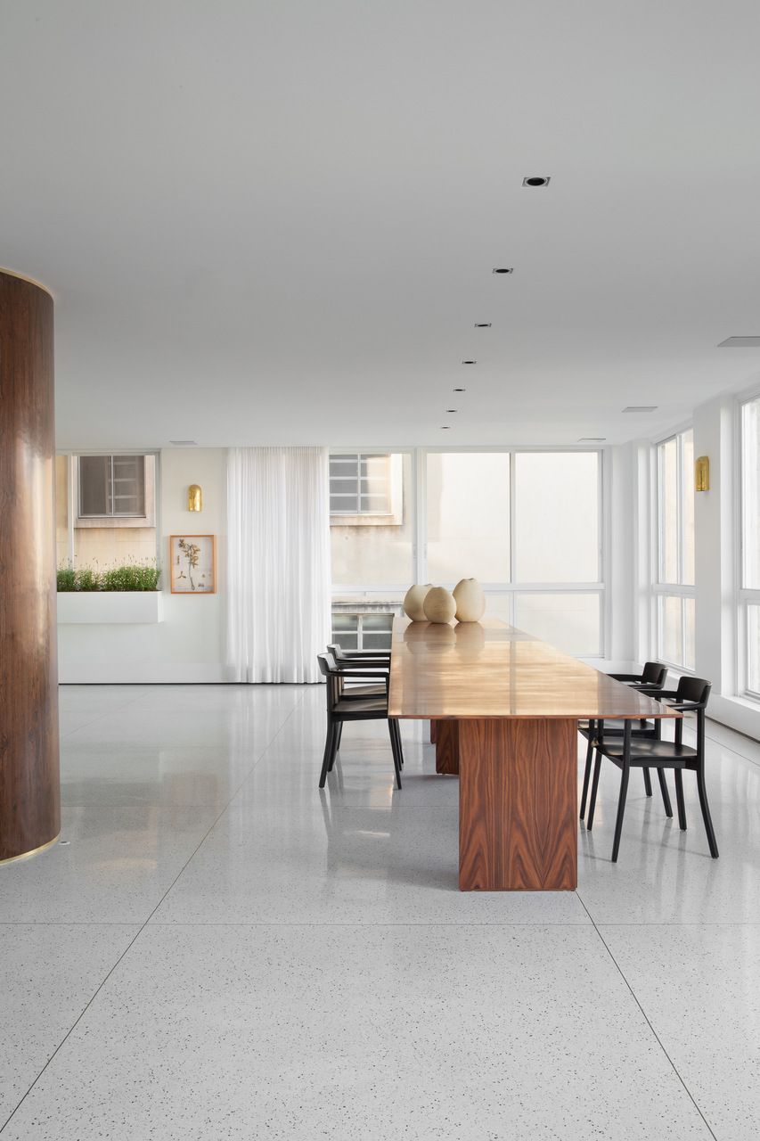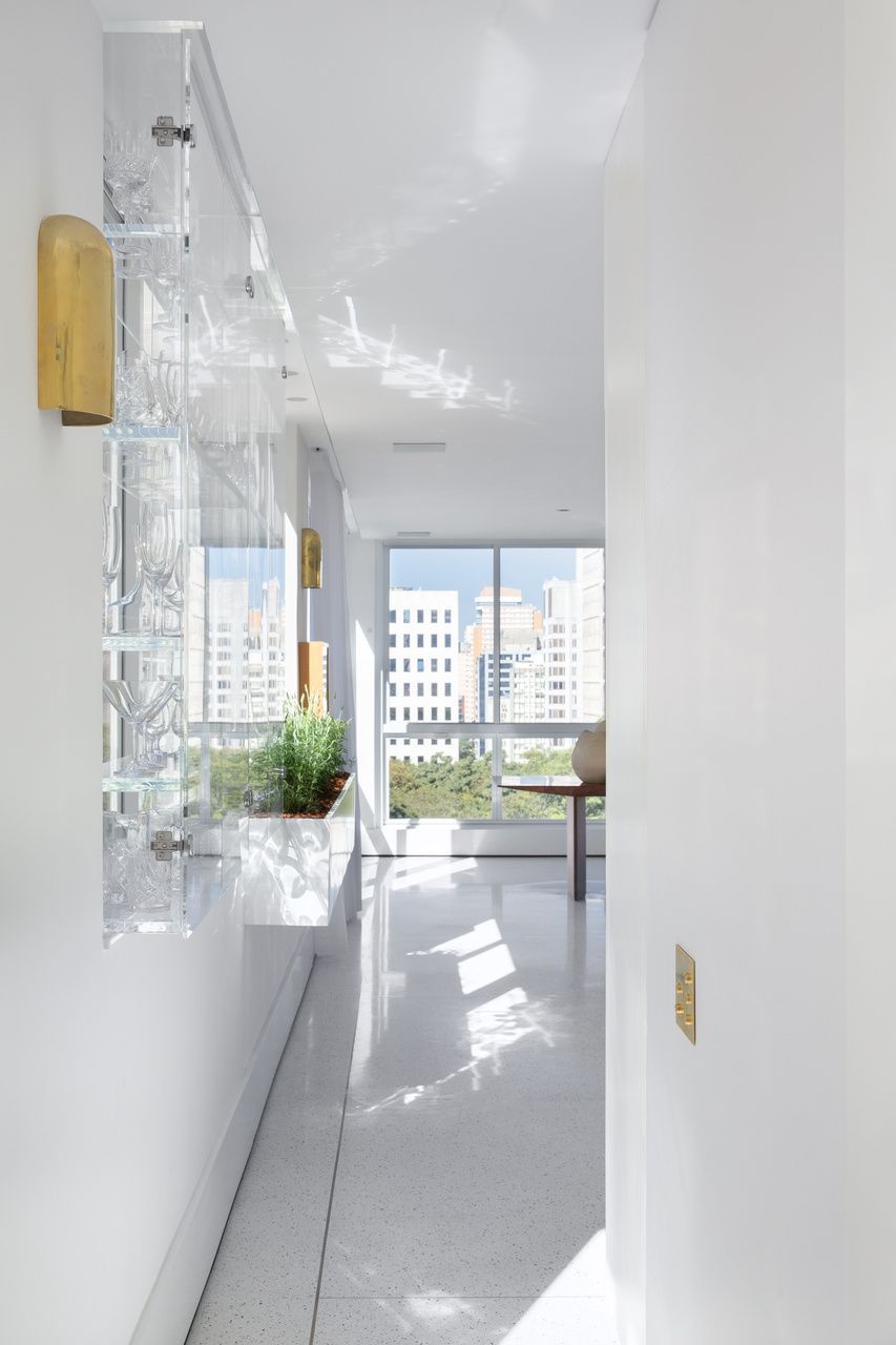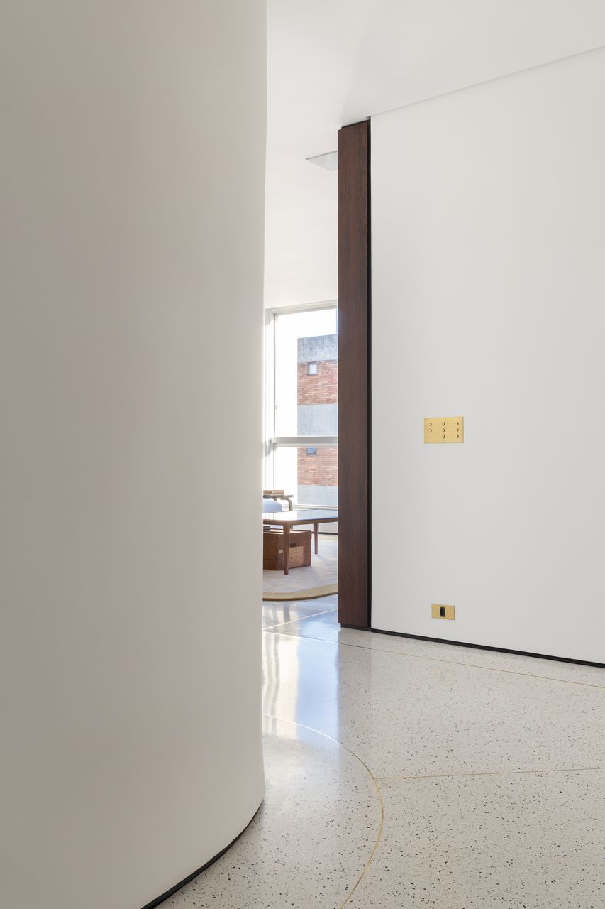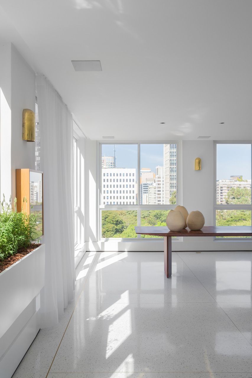 “No conceito estético, o equilíbrio entre uma arquitetura com linhas limpas, formas puras e materiais mais clássicos, transporta-nos a uma época de ouro. Sem querer copiar coisas do passado, mas usando ele como degrau para se fazer algo novo. Mesclando brancos que mudam o tom de acordo com a luz do sol, uma marcenaria contrastante com o piso de granilite, unidos por detalhes em latão e texturas da decoração. Uma homenagem a avenida Paulista como um todo. Dos casarões de elite à democracia do MASP.”
