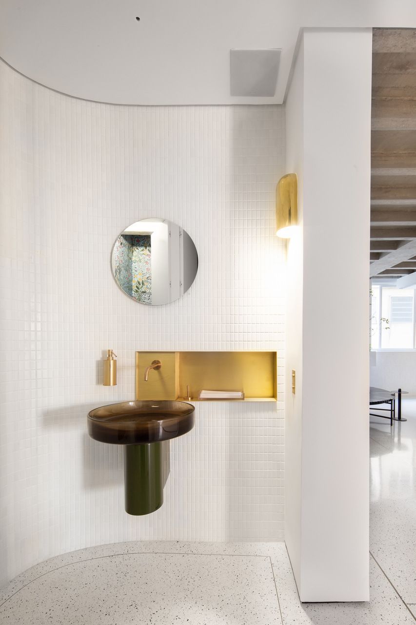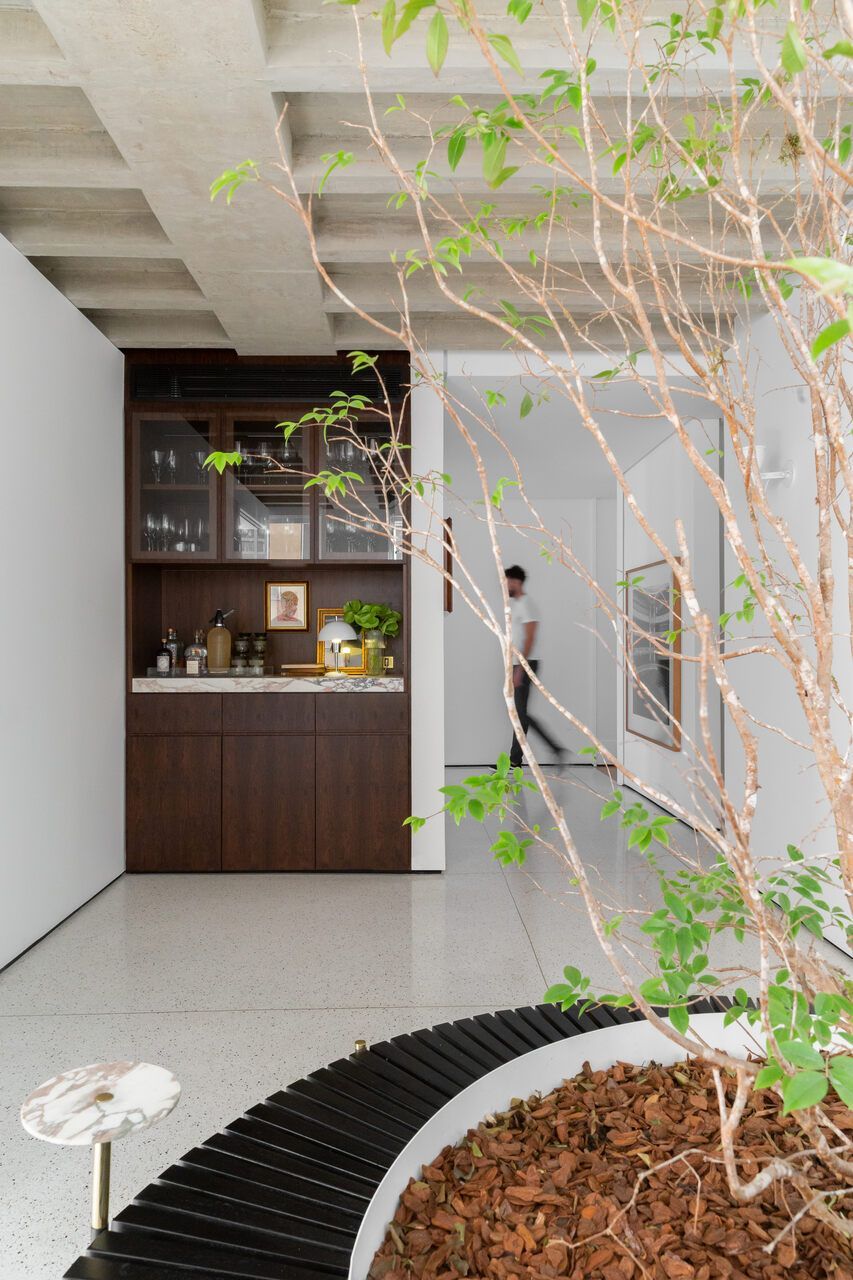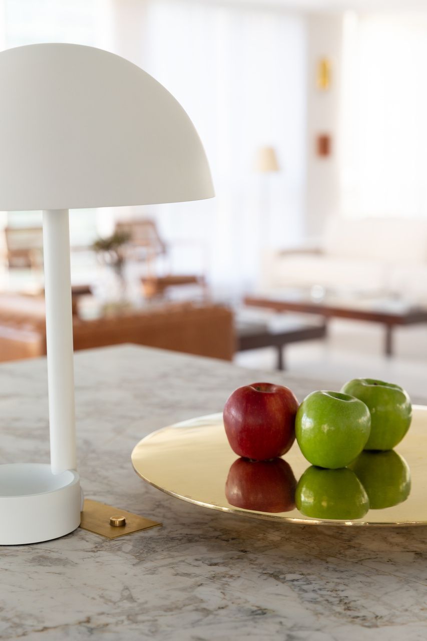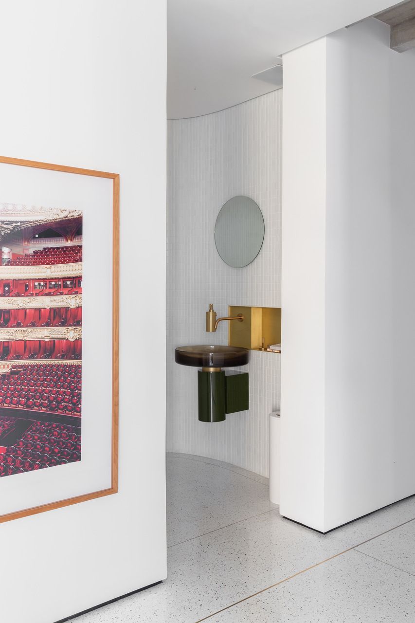 “No conceito estético, o equilíbrio entre uma arquitetura com linhas limpas, formas puras e materiais mais clássicos, transporta-nos a uma época de ouro. Sem querer copiar coisas do passado, mas usando ele como degrau para se fazer algo novo. Mesclando brancos que mudam o tom de acordo com a luz do sol, uma marcenaria contrastante com o piso de granilite, unidos por detalhes em latão e texturas da decoração. Uma homenagem a avenida Paulista como um todo. Dos casarões de elite à democracia do MASP.”