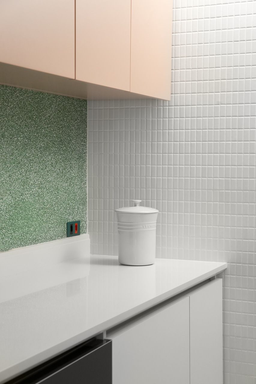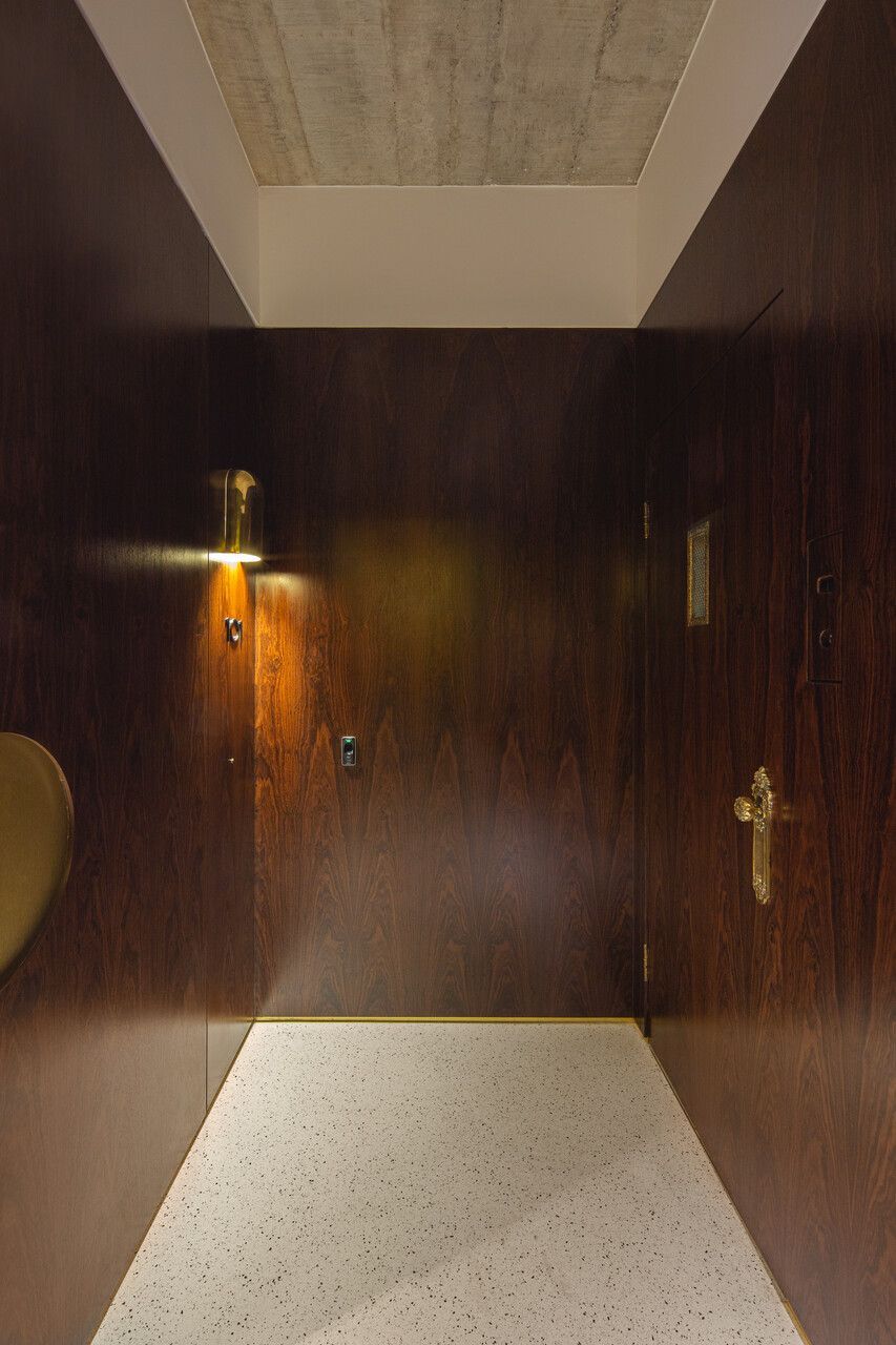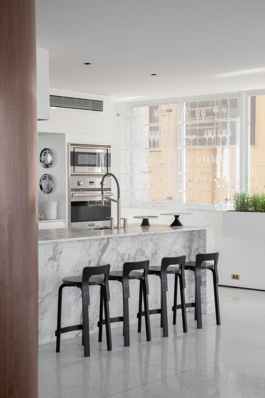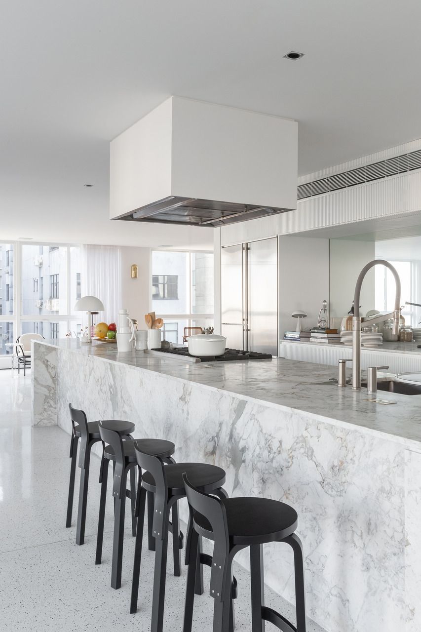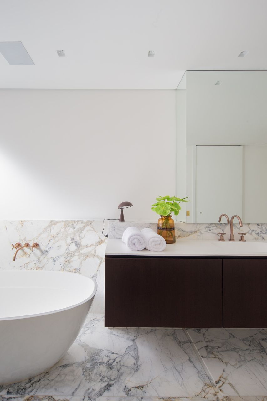 “No conceito estético, o equilíbrio entre uma arquitetura com linhas limpas, formas puras e materiais mais clássicos, transporta-nos a uma época de ouro. Sem querer copiar coisas do passado, mas usando ele como degrau para se fazer algo novo. Mesclando brancos que mudam o tom de acordo com a luz do sol, uma marcenaria contrastante com o piso de granilite, unidos por detalhes em latão e texturas da decoração. Uma homenagem a avenida Paulista como um todo. Dos casarões de elite à democracia do MASP.”