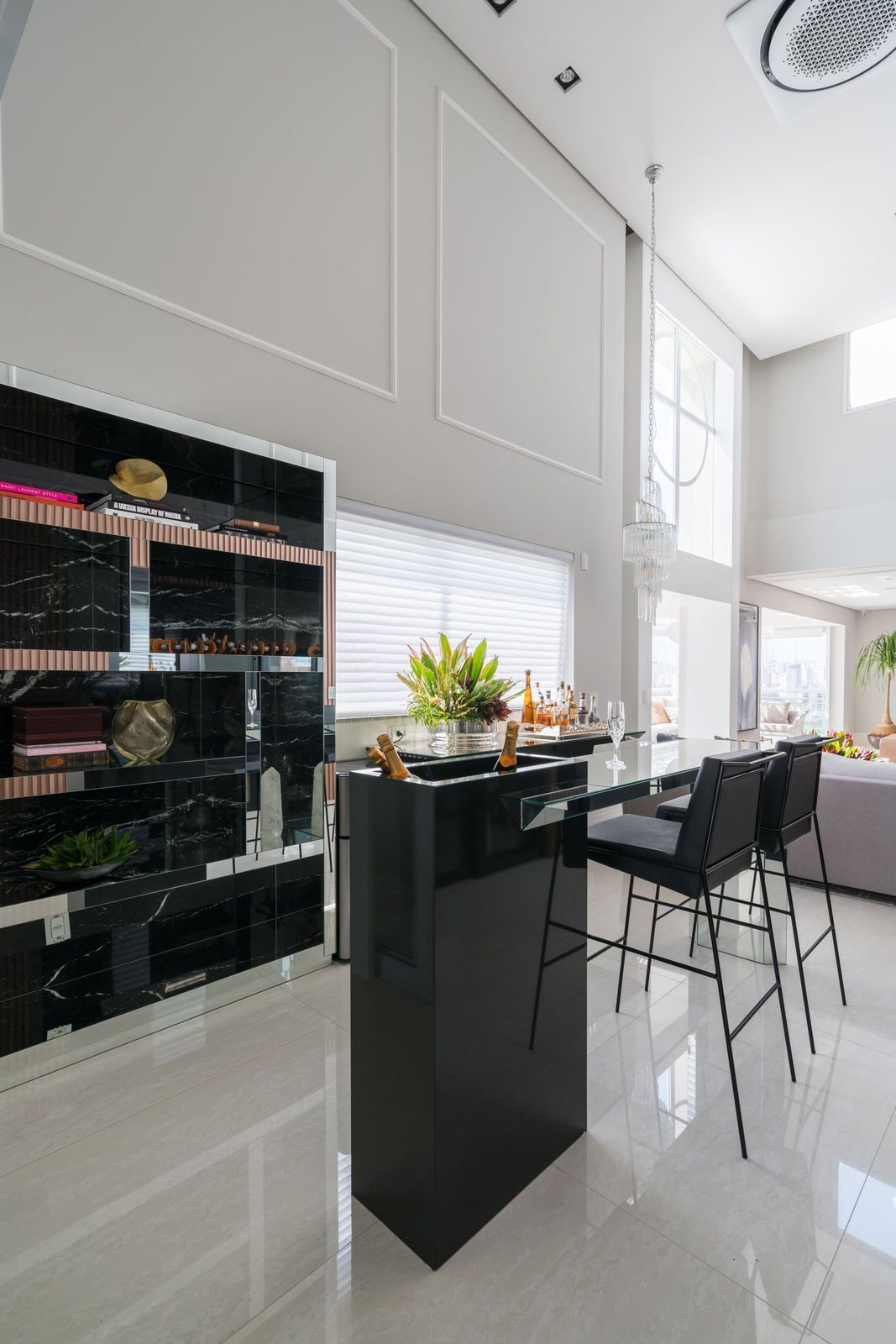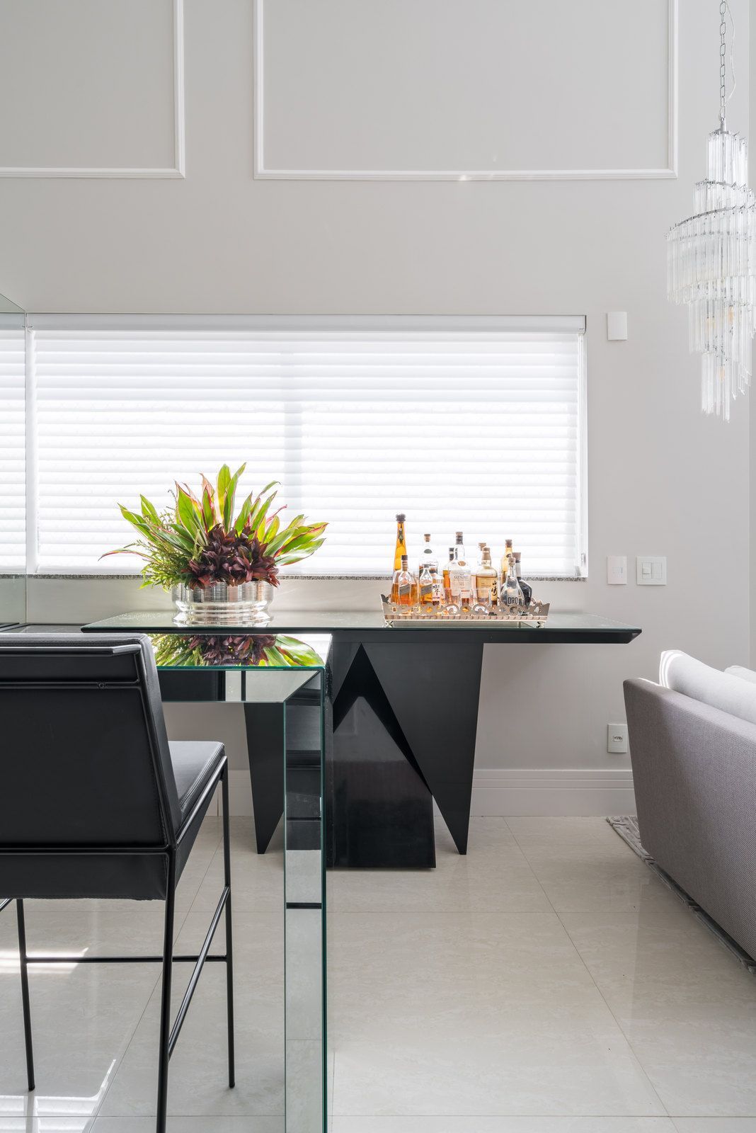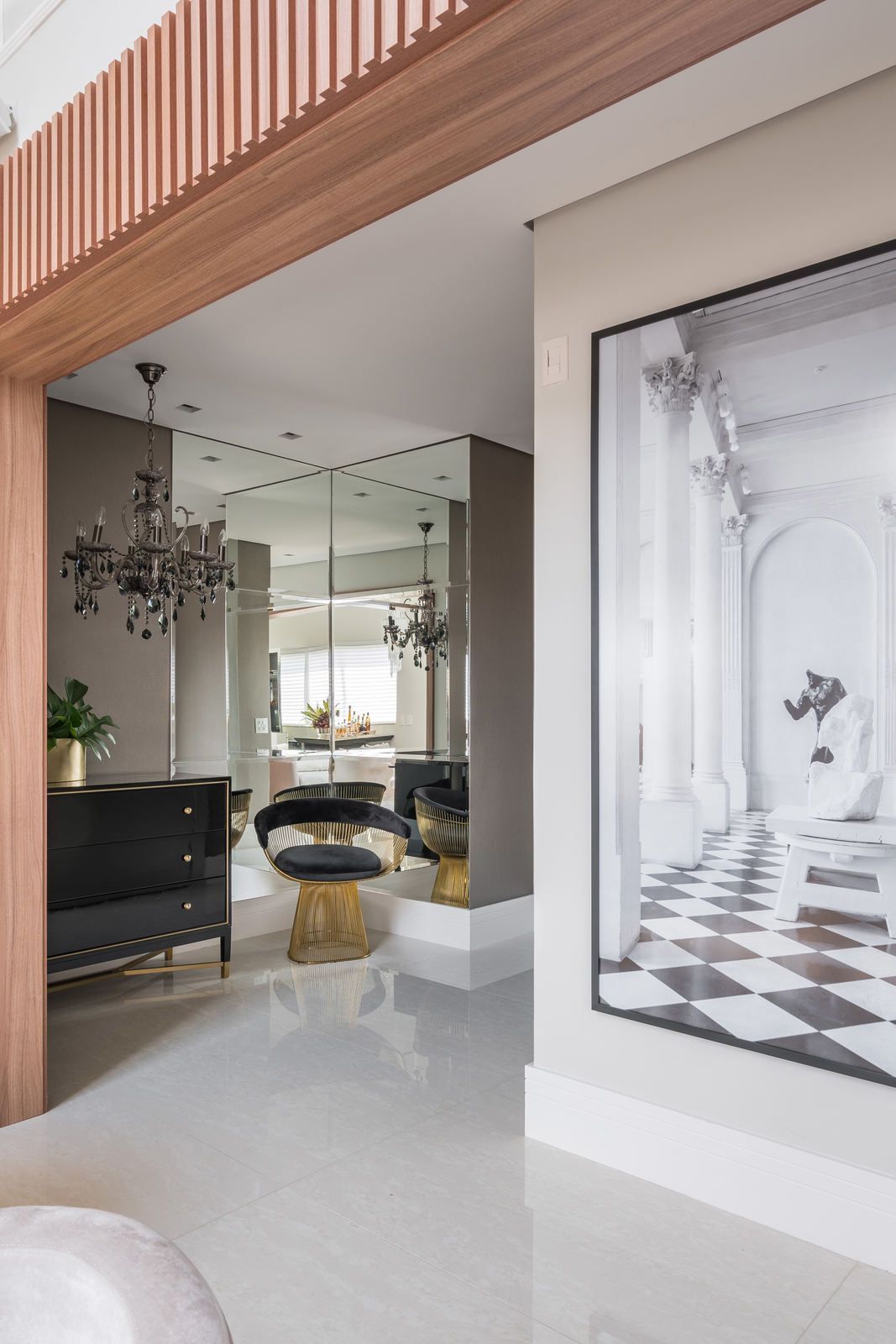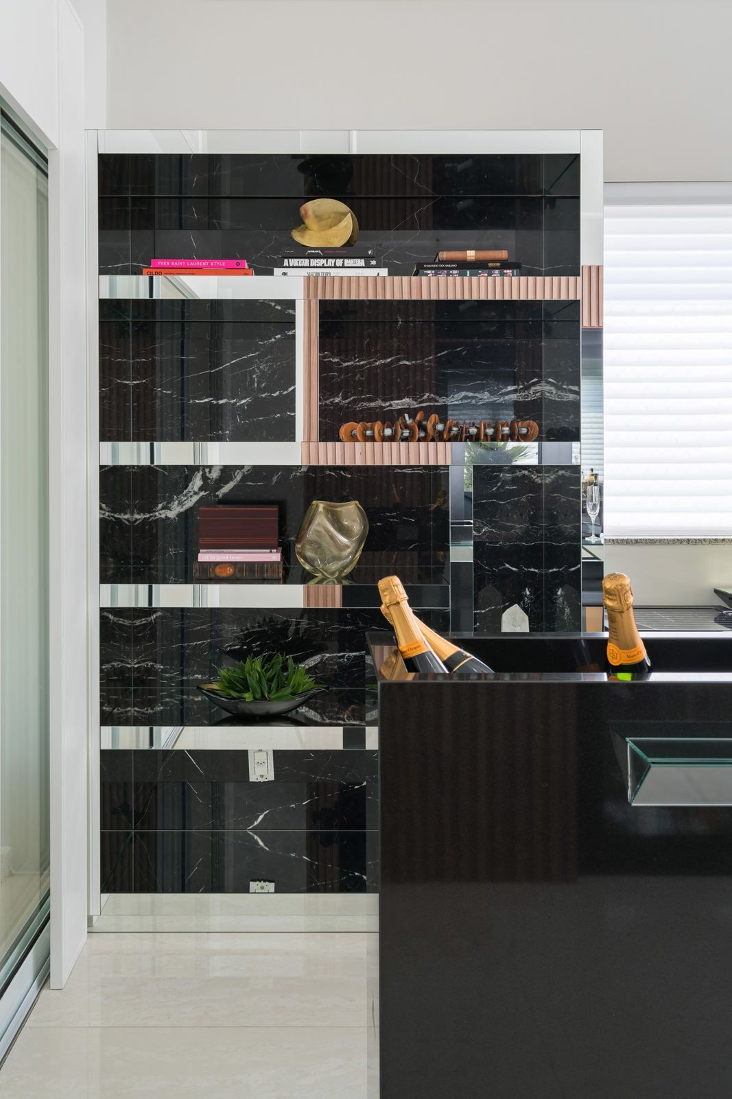 “Focada no retrofit, a decoração misturou peças existentes com outras novas, repensando o layout dos ambientes e resultando numa mescla de itens cheia de personalidade e charme que transformou área social, quarto e varandas. Também precisei realizar uma cuidadosa curadoria das peças já existentes no apartamento para criar composições mais harmônicas. No hall de entrada, por exemplo, antes só havia um imponente lustre. Mas apostei no uso do espelho numa das paredes para dar um ar de chapelaria. Destaque também para a cômoda de laca preta e para a linda poltrona da Dunelli. No ambiente anexo à sala, criei uma convidativa área de bar, toda executada em mármore pela Cappellazzo, com direito a champanheira. No alto, as boiseries criadas com peças de polietileno. A viga existente no quarto ficou oculta com a chegada do pórtico de laca (Mada Marcenaria), que envolve inclusive a mesa de cabeceira. O escritório também desenhou a estante, ao lado da cama, fazendo com que esse cantinho desse um clima de hotel ao ambiente. Com tanto carinho e amor envolvidos, o resultado é uma morada sofisticada e ao mesmo tempo acolhedora, customizada sob medida para atender os gostos e preferências da família.”