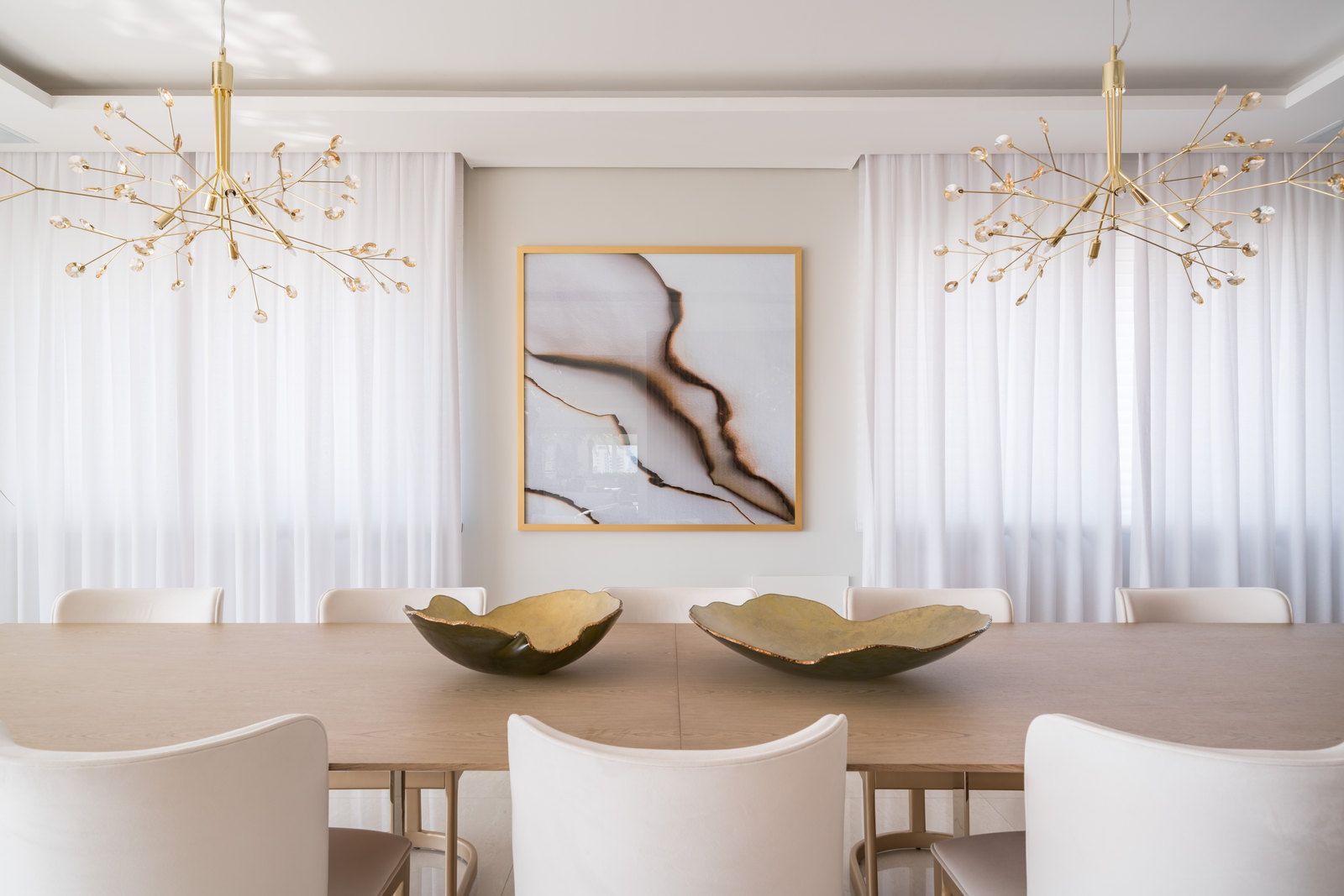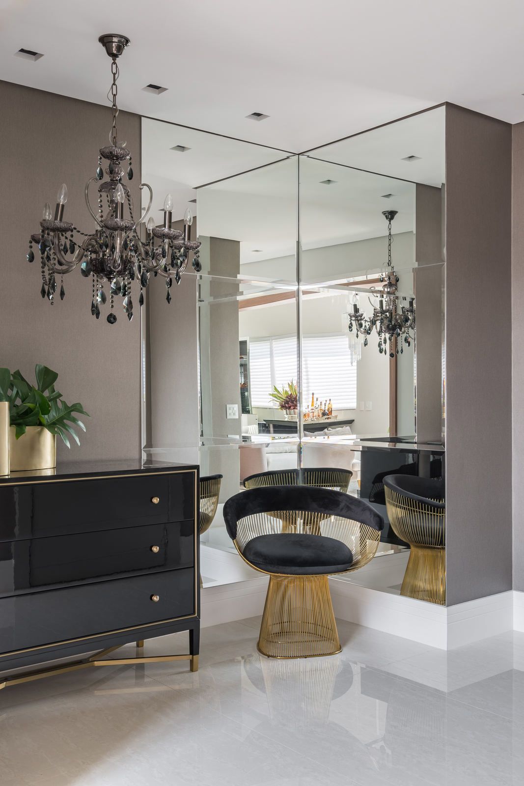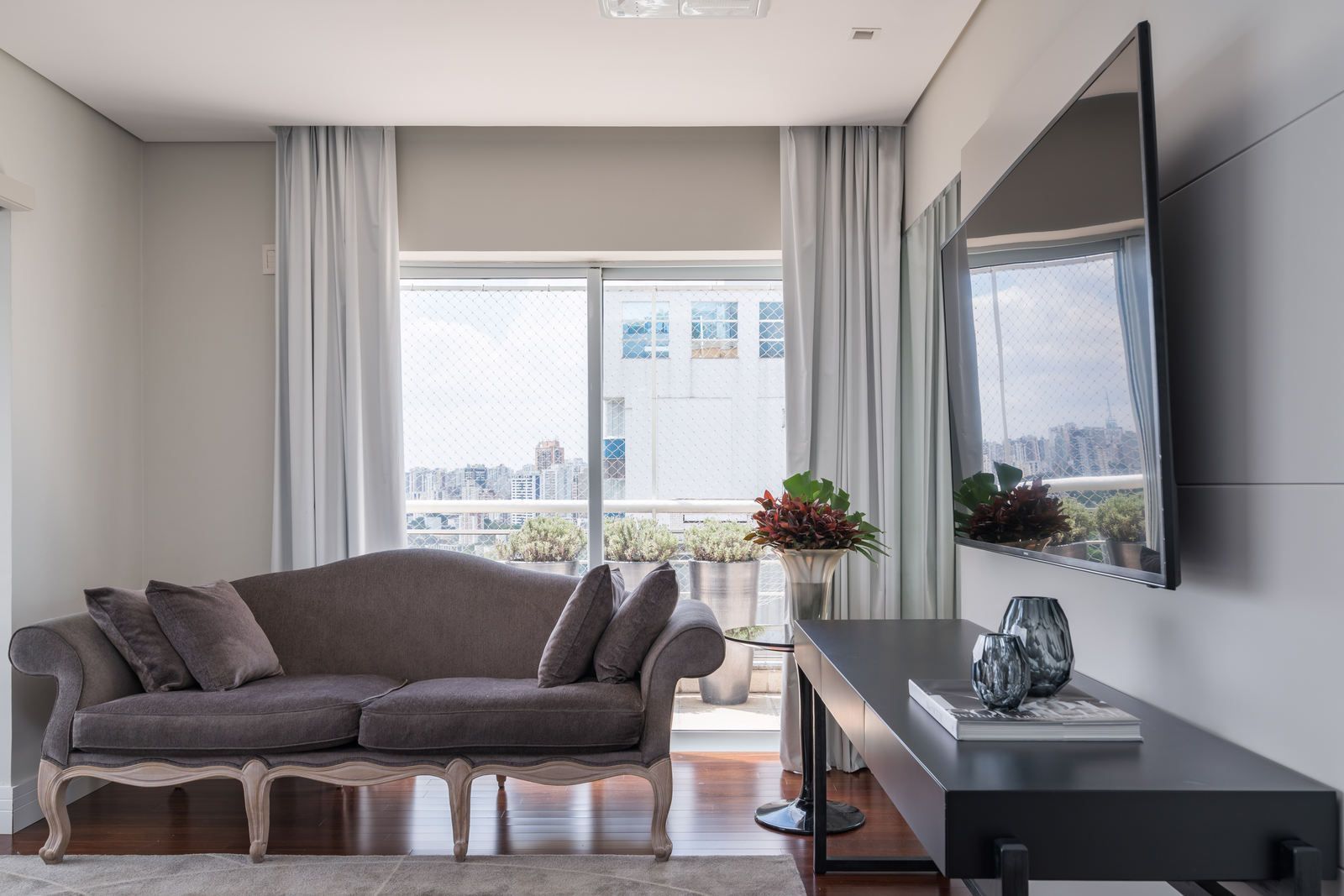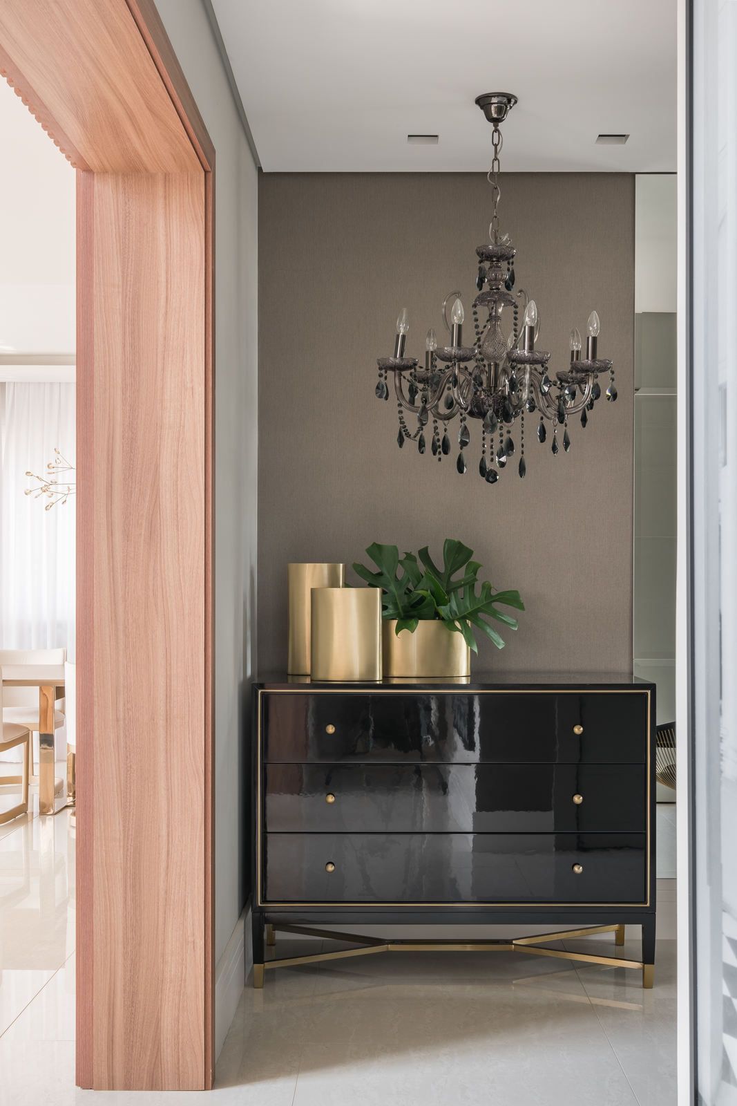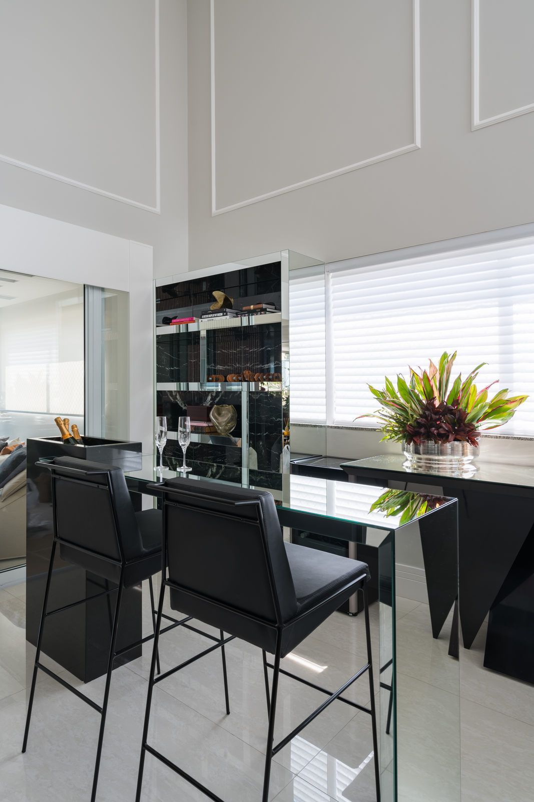 “Focada no retrofit, a decoração misturou peças existentes com outras novas, repensando o layout dos ambientes e resultando numa mescla de itens cheia de personalidade e charme que transformou área social, quarto e varandas. Também precisei realizar uma cuidadosa curadoria das peças já existentes no apartamento para criar composições mais harmônicas. No hall de entrada, por exemplo, antes só havia um imponente lustre. Mas apostei no uso do espelho numa das paredes para dar um ar de chapelaria. Destaque também para a cômoda de laca preta e para a linda poltrona da Dunelli. No ambiente anexo à sala, criei uma convidativa área de bar, toda executada em mármore pela Cappellazzo, com direito a champanheira. No alto, as boiseries criadas com peças de polietileno. A viga existente no quarto ficou oculta com a chegada do pórtico de laca (Mada Marcenaria), que envolve inclusive a mesa de cabeceira. O escritório também desenhou a estante, ao lado da cama, fazendo com que esse cantinho desse um clima de hotel ao ambiente. Com tanto carinho e amor envolvidos, o resultado é uma morada sofisticada e ao mesmo tempo acolhedora, customizada sob medida para atender os gostos e preferências da família.”