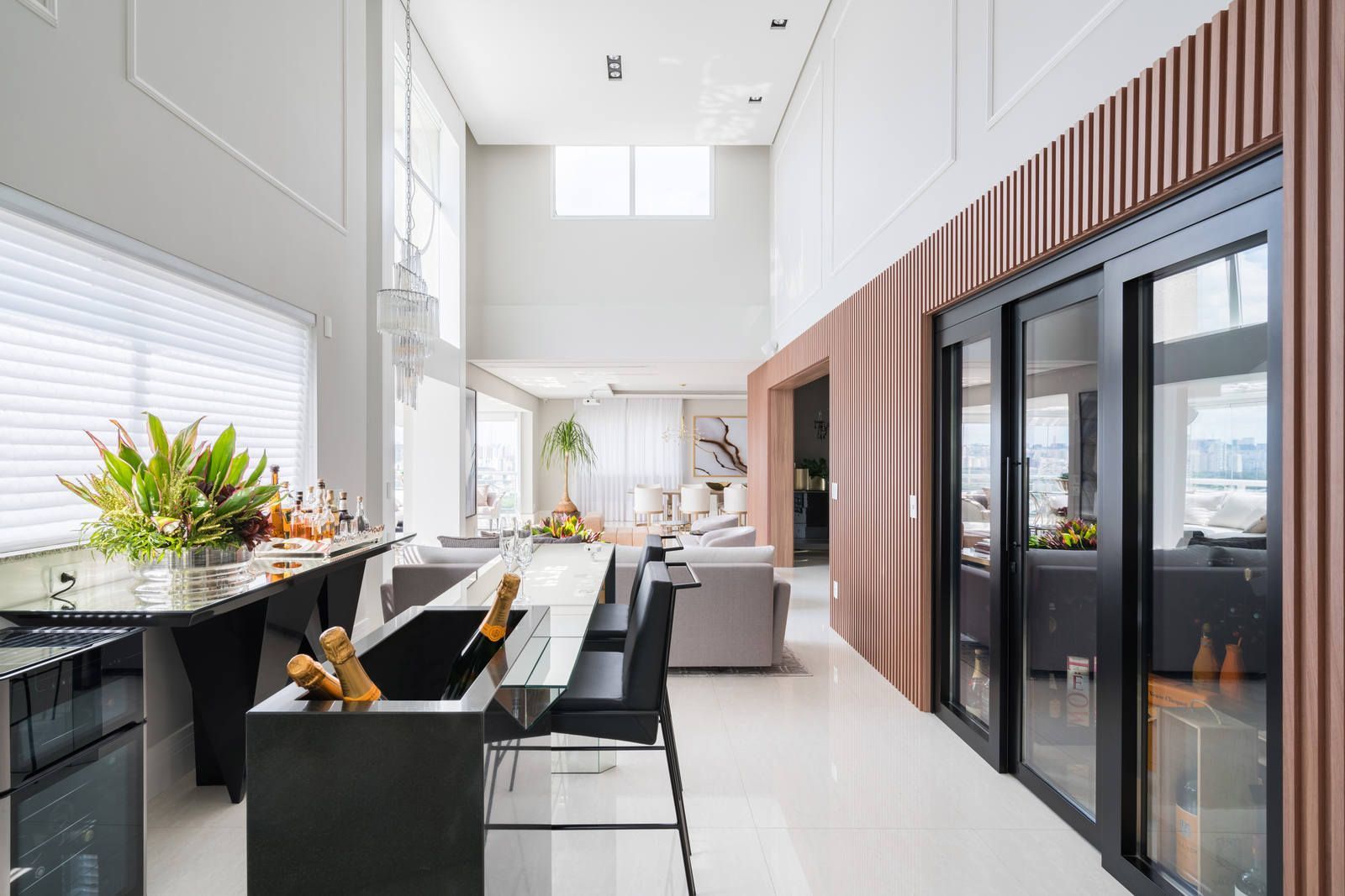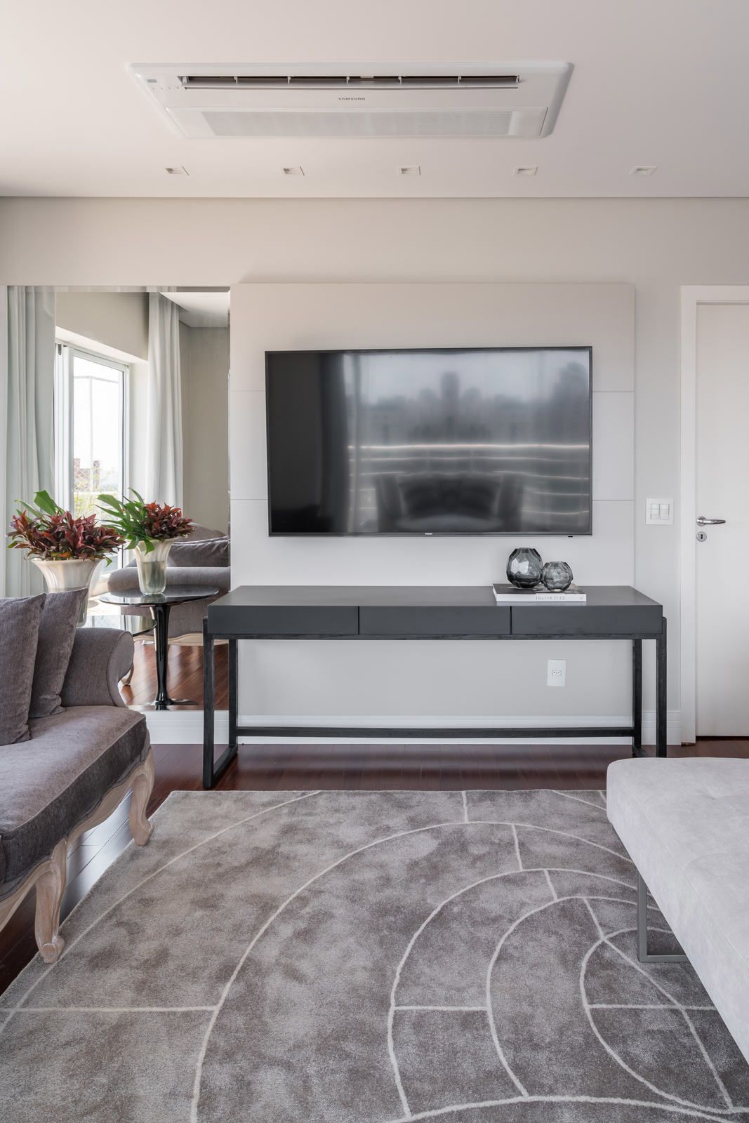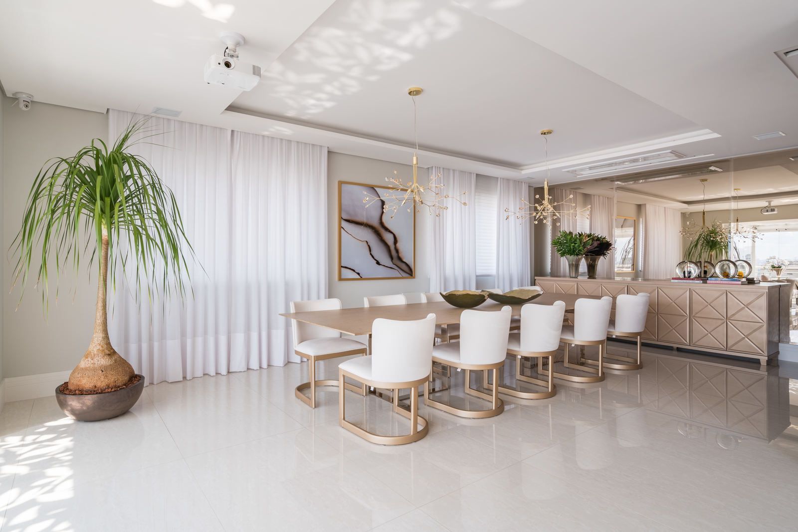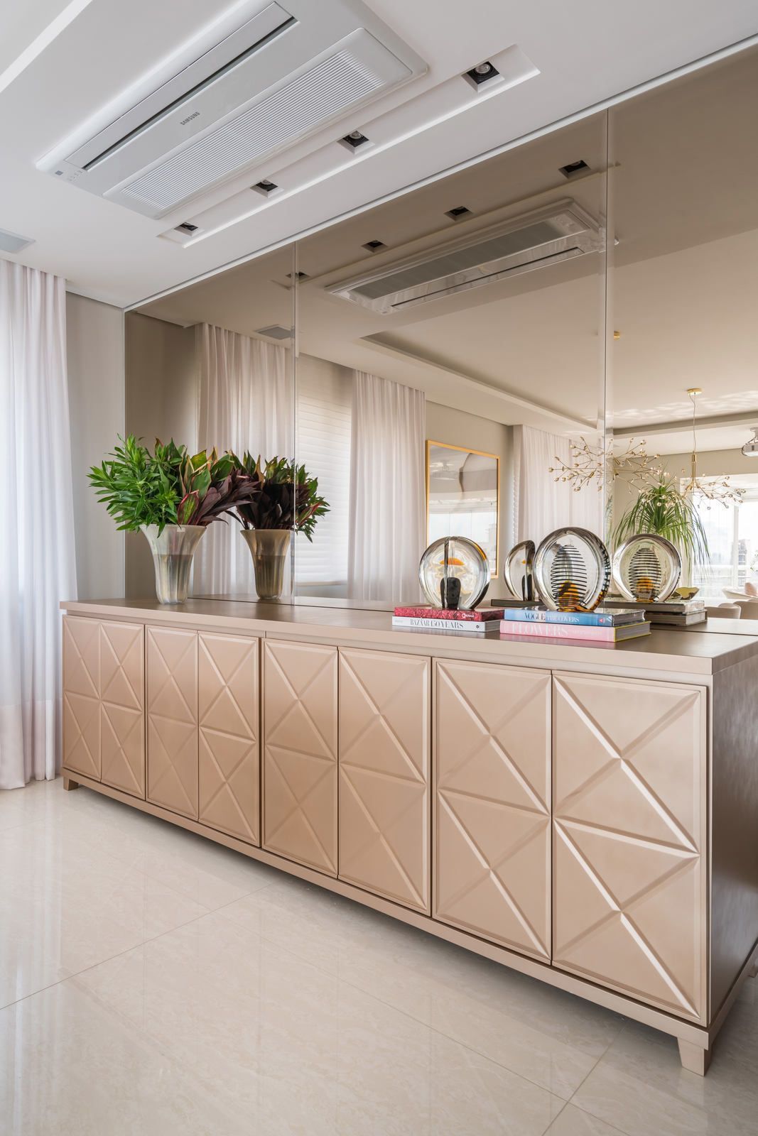 “Focada no retrofit, a decoração misturou peças existentes com outras novas, repensando o layout dos ambientes e resultando numa mescla de itens cheia de personalidade e charme que transformou área social, quarto e varandas. Também precisei realizar uma cuidadosa curadoria das peças já existentes no apartamento para criar composições mais harmônicas. No hall de entrada, por exemplo, antes só havia um imponente lustre. Mas apostei no uso do espelho numa das paredes para dar um ar de chapelaria. Destaque também para a cômoda de laca preta e para a linda poltrona da Dunelli. No ambiente anexo à sala, criei uma convidativa área de bar, toda executada em mármore pela Cappellazzo, com direito a champanheira. No alto, as boiseries criadas com peças de polietileno. A viga existente no quarto ficou oculta com a chegada do pórtico de laca (Mada Marcenaria), que envolve inclusive a mesa de cabeceira. O escritório também desenhou a estante, ao lado da cama, fazendo com que esse cantinho desse um clima de hotel ao ambiente. Com tanto carinho e amor envolvidos, o resultado é uma morada sofisticada e ao mesmo tempo acolhedora, customizada sob medida para atender os gostos e preferências da família.”