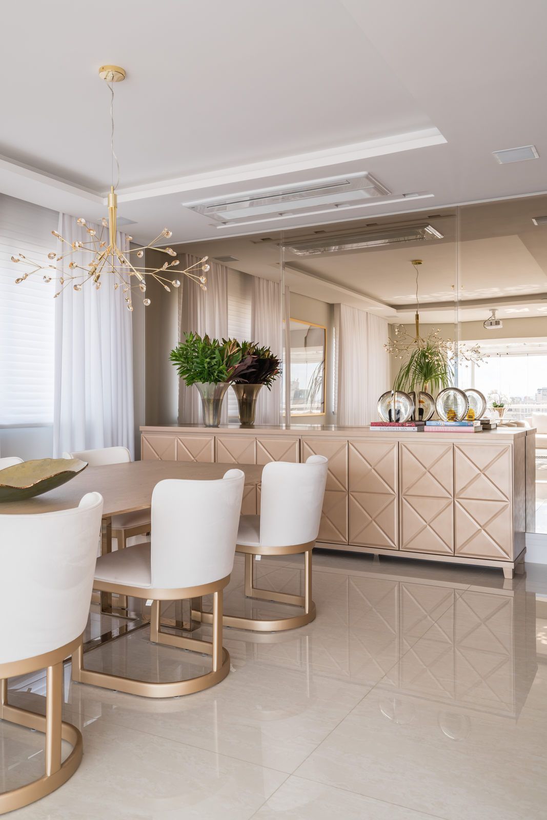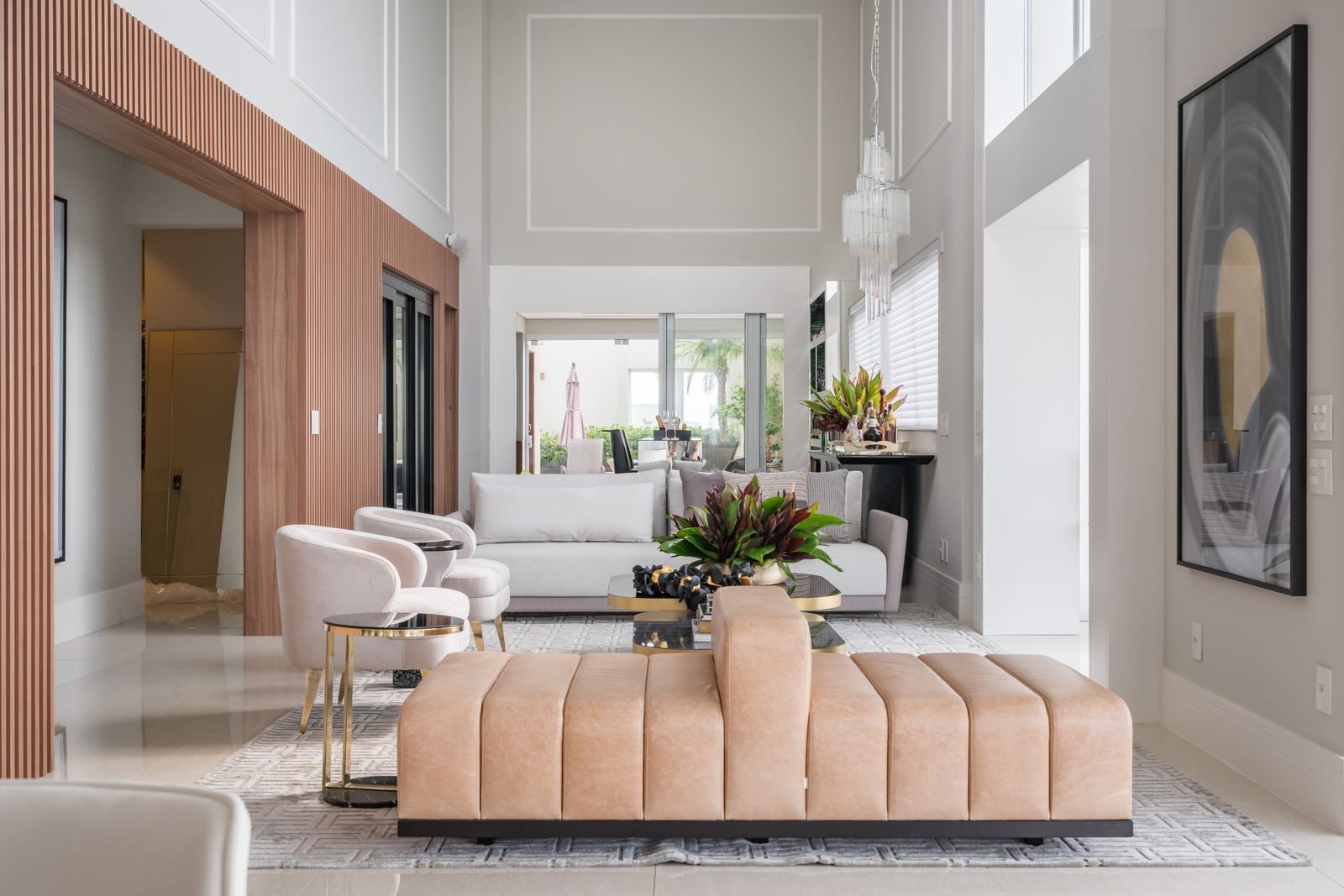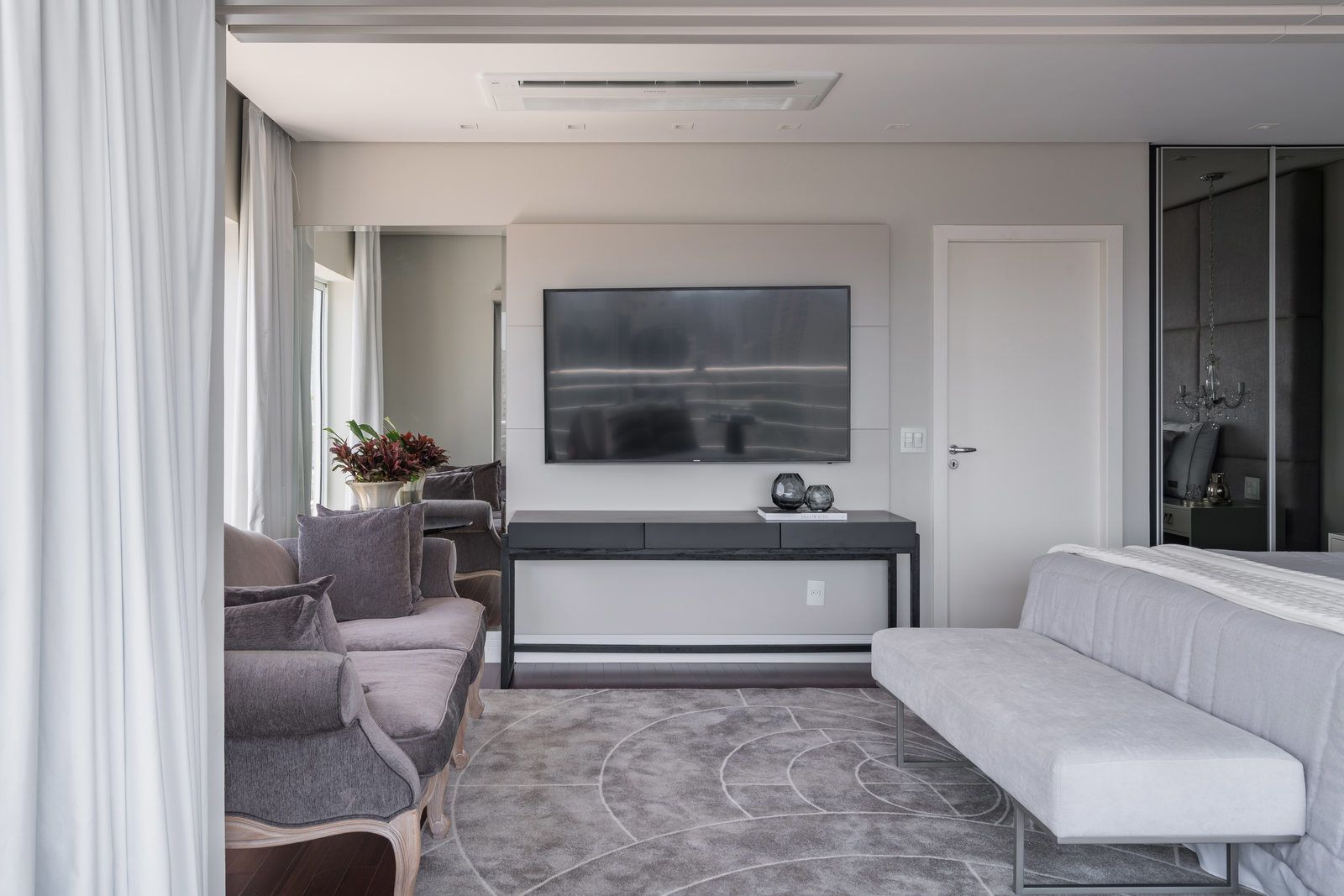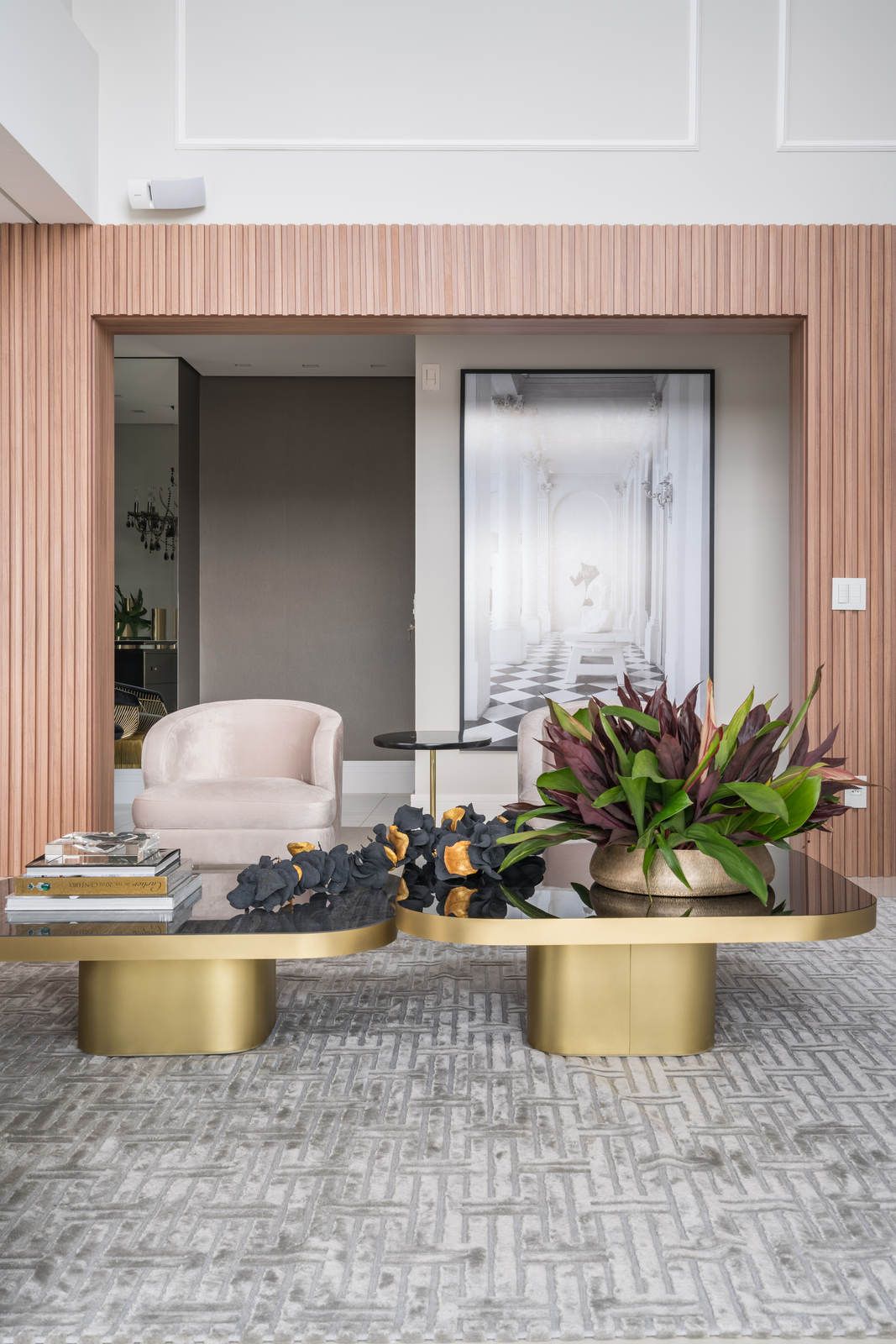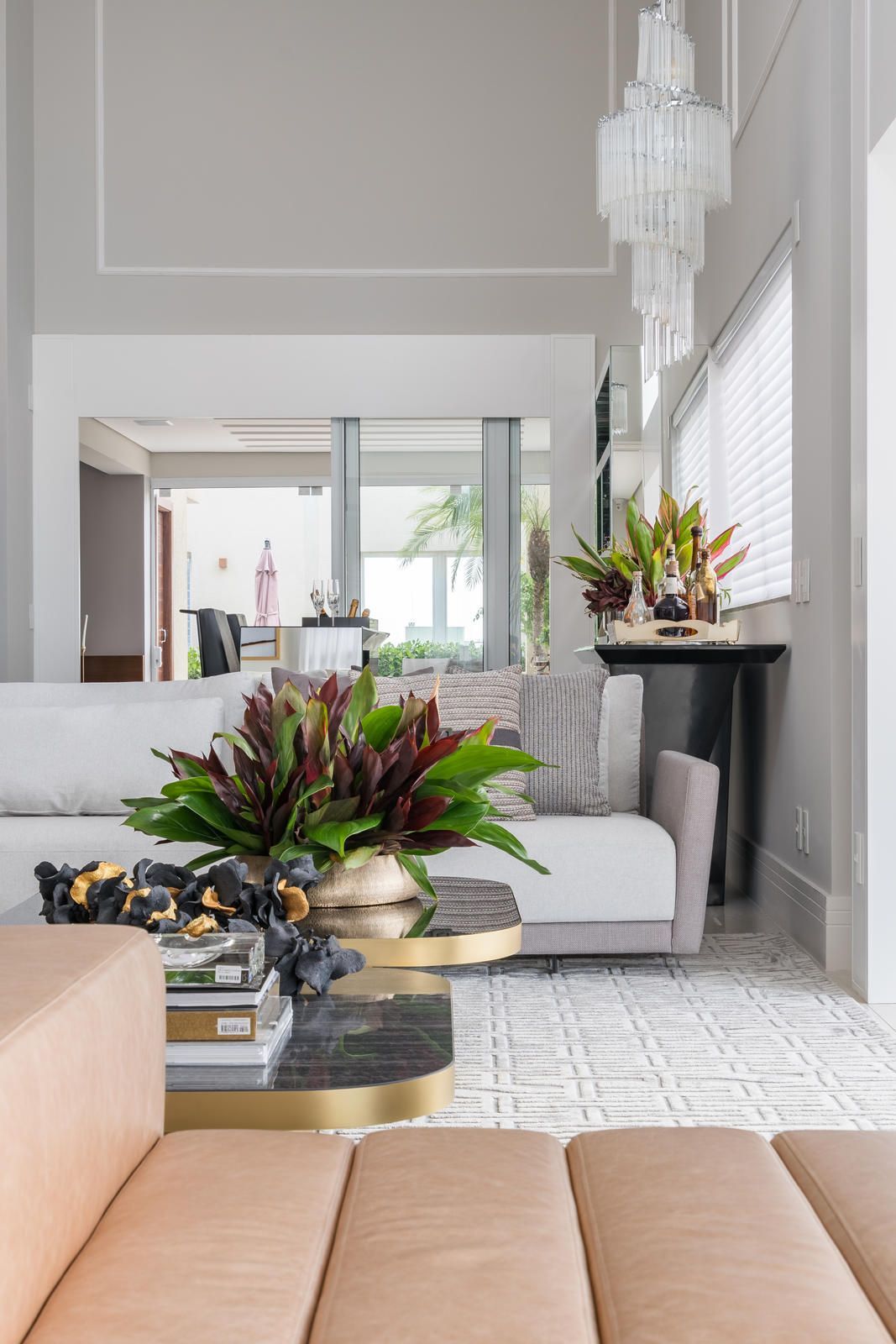 “Focada no retrofit, a decoração misturou peças existentes com outras novas, repensando o layout dos ambientes e resultando numa mescla de itens cheia de personalidade e charme que transformou área social, quarto e varandas. Também precisei realizar uma cuidadosa curadoria das peças já existentes no apartamento para criar composições mais harmônicas. No hall de entrada, por exemplo, antes só havia um imponente lustre. Mas apostei no uso do espelho numa das paredes para dar um ar de chapelaria. Destaque também para a cômoda de laca preta e para a linda poltrona da Dunelli. No ambiente anexo à sala, criei uma convidativa área de bar, toda executada em mármore pela Cappellazzo, com direito a champanheira. No alto, as boiseries criadas com peças de polietileno. A viga existente no quarto ficou oculta com a chegada do pórtico de laca (Mada Marcenaria), que envolve inclusive a mesa de cabeceira. O escritório também desenhou a estante, ao lado da cama, fazendo com que esse cantinho desse um clima de hotel ao ambiente. Com tanto carinho e amor envolvidos, o resultado é uma morada sofisticada e ao mesmo tempo acolhedora, customizada sob medida para atender os gostos e preferências da família.”