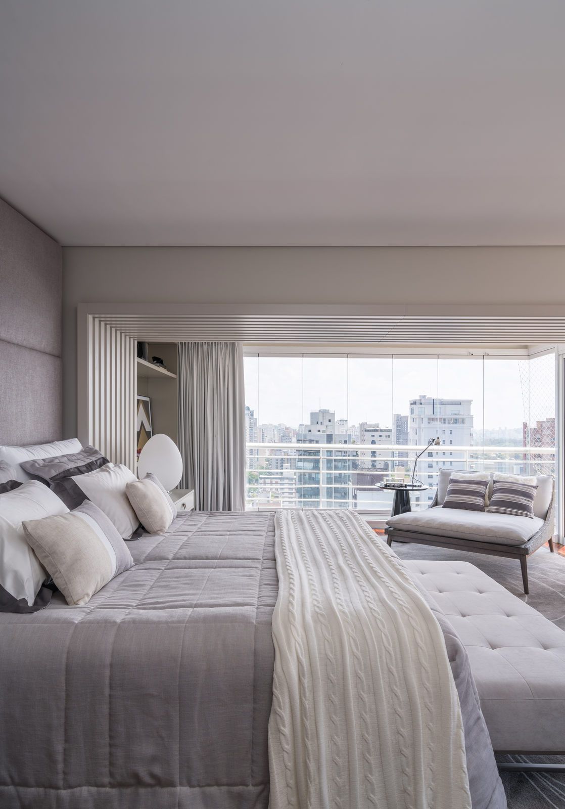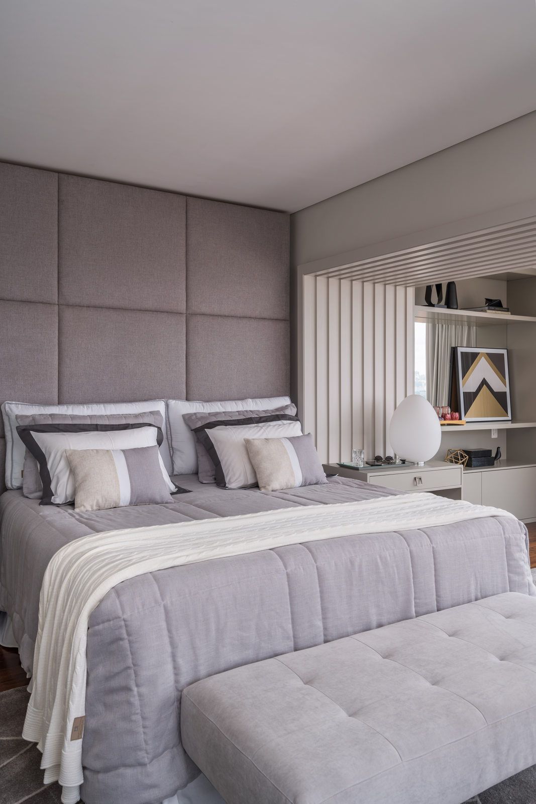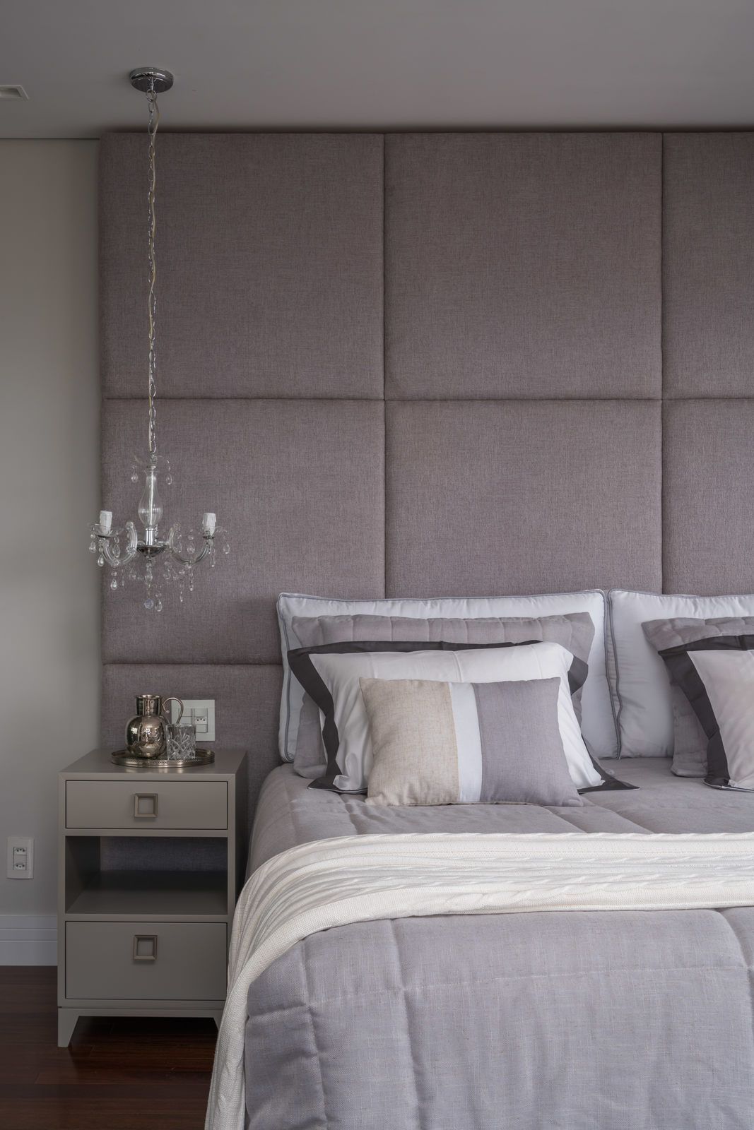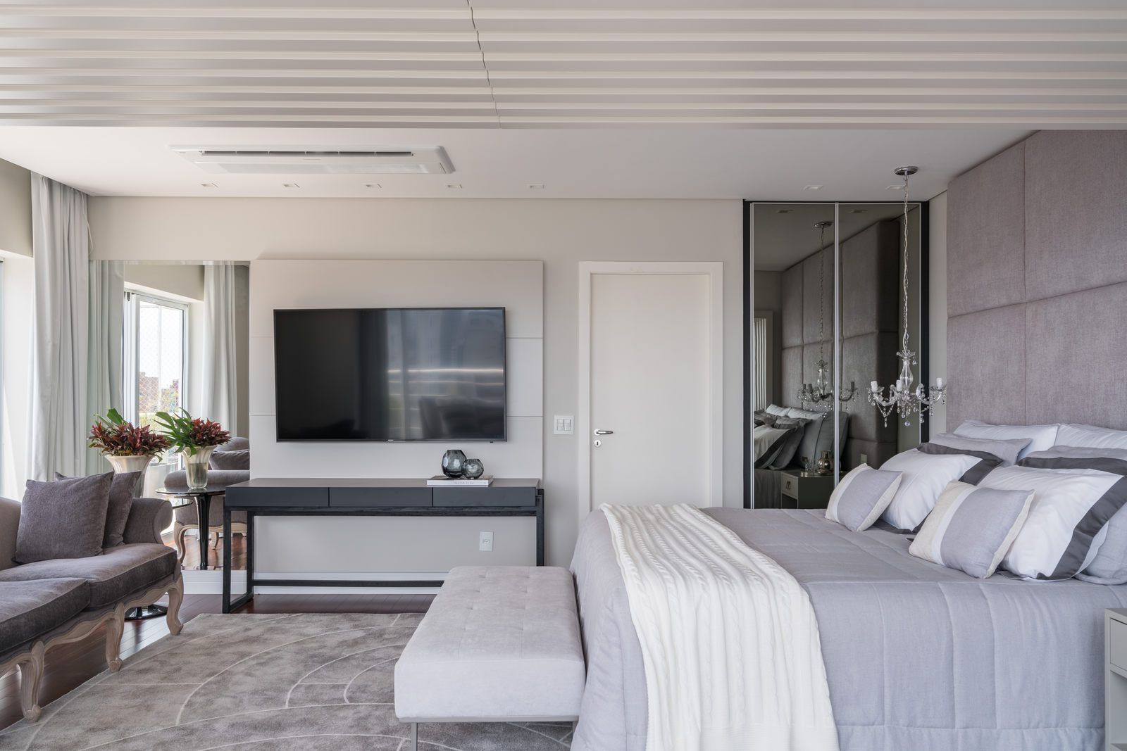 “Focada no retrofit, a decoração misturou peças existentes com outras novas, repensando o layout dos ambientes e resultando numa mescla de itens cheia de personalidade e charme que transformou área social, quarto e varandas. Também precisei realizar uma cuidadosa curadoria das peças já existentes no apartamento para criar composições mais harmônicas. No hall de entrada, por exemplo, antes só havia um imponente lustre. Mas apostei no uso do espelho numa das paredes para dar um ar de chapelaria. Destaque também para a cômoda de laca preta e para a linda poltrona da Dunelli. No ambiente anexo à sala, criei uma convidativa área de bar, toda executada em mármore pela Cappellazzo, com direito a champanheira. No alto, as boiseries criadas com peças de polietileno. A viga existente no quarto ficou oculta com a chegada do pórtico de laca (Mada Marcenaria), que envolve inclusive a mesa de cabeceira. O escritório também desenhou a estante, ao lado da cama, fazendo com que esse cantinho desse um clima de hotel ao ambiente. Com tanto carinho e amor envolvidos, o resultado é uma morada sofisticada e ao mesmo tempo acolhedora, customizada sob medida para atender os gostos e preferências da família.”