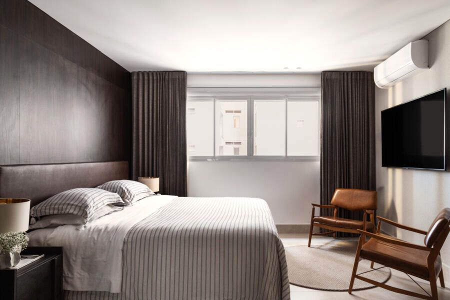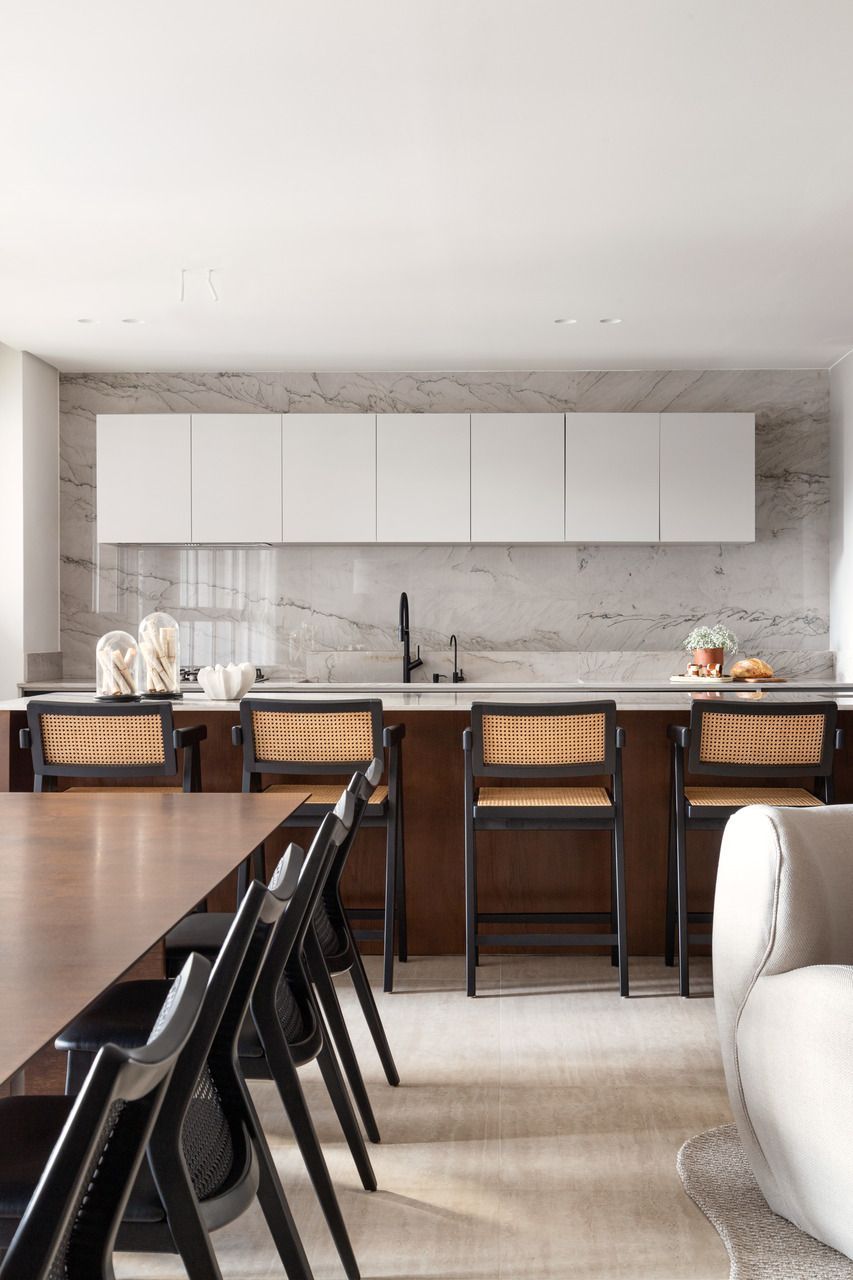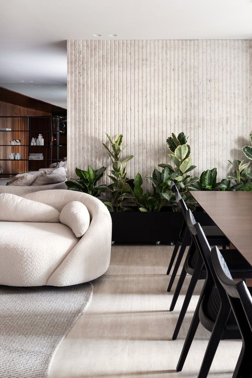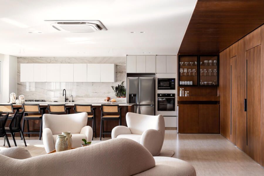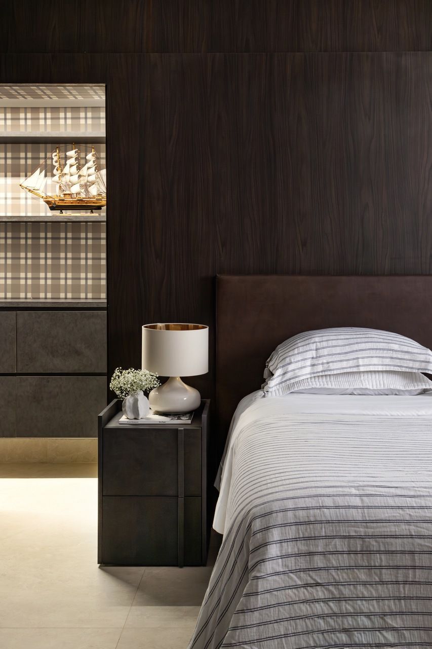 Neste apartamento assinado pela arquiteta Eugênia Cordeiro, bastaram trinta minutos de conversa com o proprietário, um advogado conhecido pela elegância discreta e pelo rigor com detalhes, para que ele aprovasse toda a proposta do projeto. A ideia era realizar o seu desejo de ter um lar que combinasse sofisticação, organização e aconchego para receber seus filhos. Dali em diante, Eugênia conduziu cada etapa como quem cuida de algo profundamente pessoal.