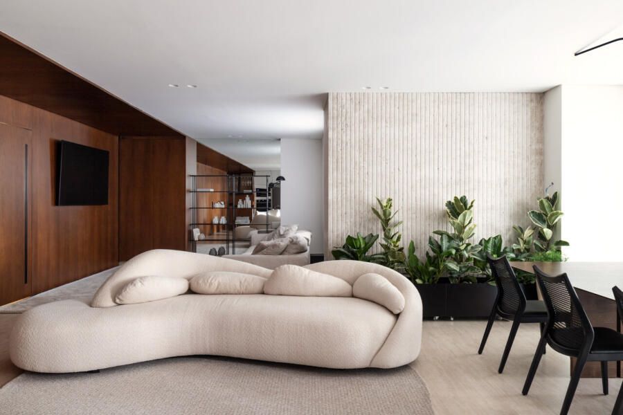 A sala em formato orgânico se tornou o eixo afetivo do lar, um espaço pensado tanto para conversas longas quanto para momentos de recolhimento. A paleta suave, as texturas ricas e a iluminação precisa foram escolhidas para transmitir calma, criando um ritmo de morar que desacelera o cotidiano sem abrir mão da elegância.