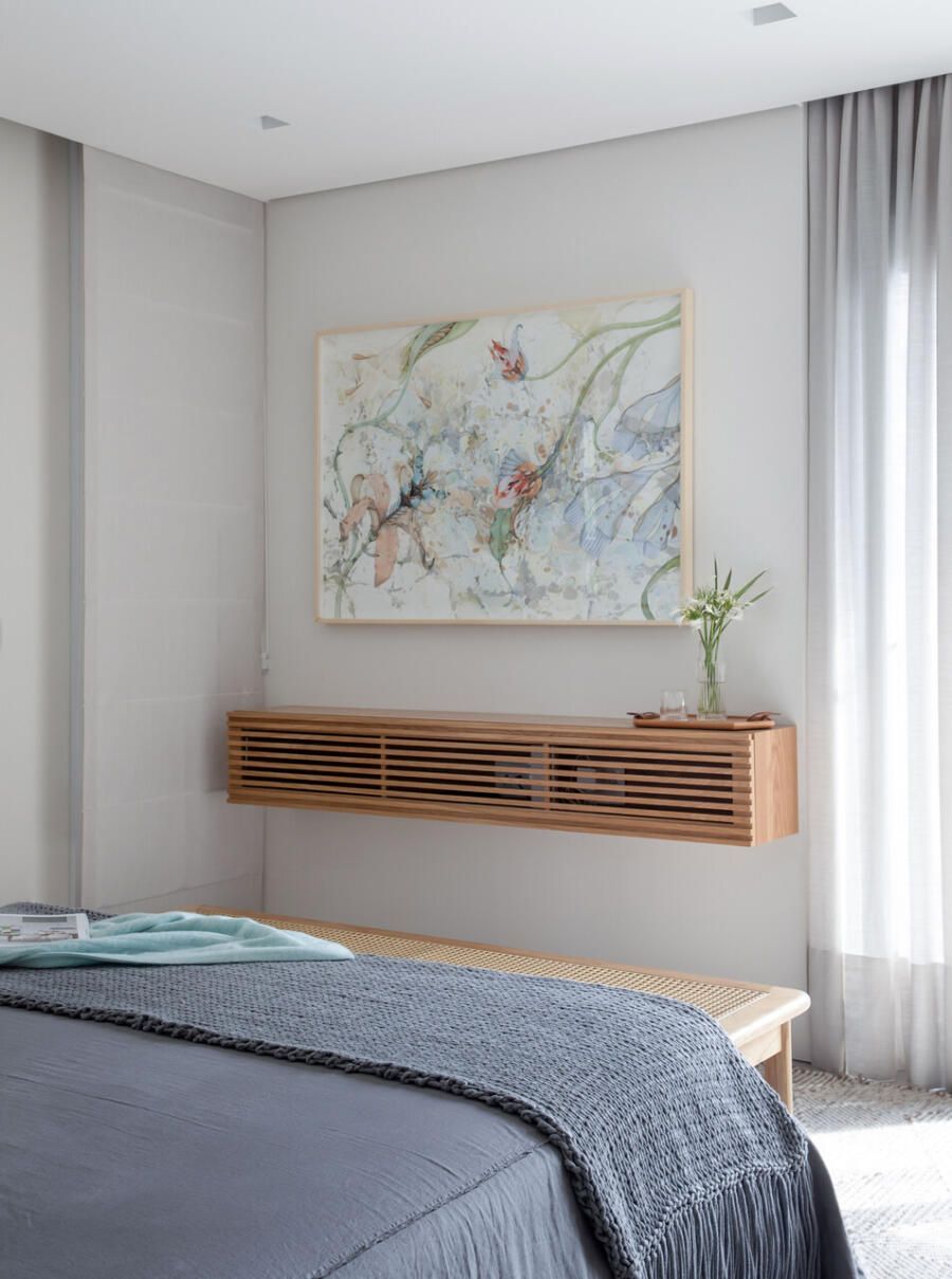 O novo layout organiza a casa em dois grandes eixos: o social, amplo e fluido, e o íntimo, mais reservado. Surgiram duas suítes após a reforma: a principal, ampliada e confortável, e a segunda, pensada como um espaço multifuncional, capaz de funcionar como escritório, quarto de hóspedes ou sala de TV, conforme a ocasião. A flexibilidade atende às necessidades de quem vive fora, mas quer um apartamento pronto para diferentes usos.