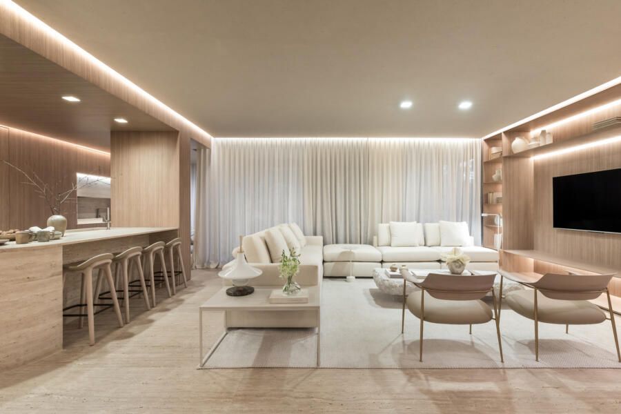 Um apartamento com estilo minimalista e contemporâneo. Este foi o projeto assinado pela arquiteta Fernanda Cassou, que teve como um dos destaques o Travertino, da NPK Mármores, que reveste todo o piso do espaço, o nicho da cozinha e ganha protagonismo na ilha central.