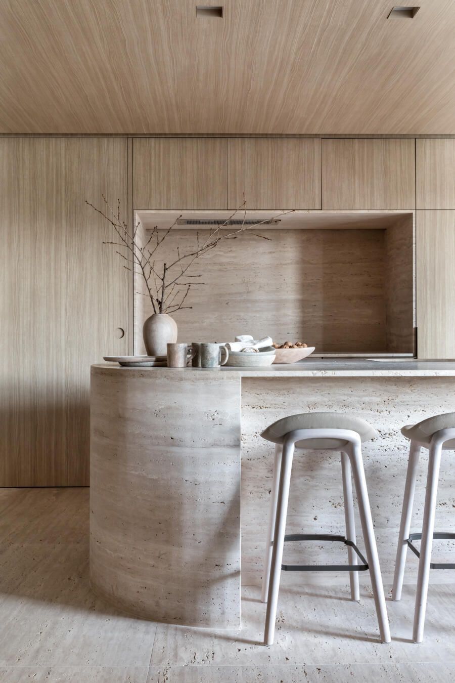 Ponto de integração entre a sala e a área gourmet, o Travertino também reflete o tom rústico do material sem deixar de lado a delicadeza do conceito geral.
