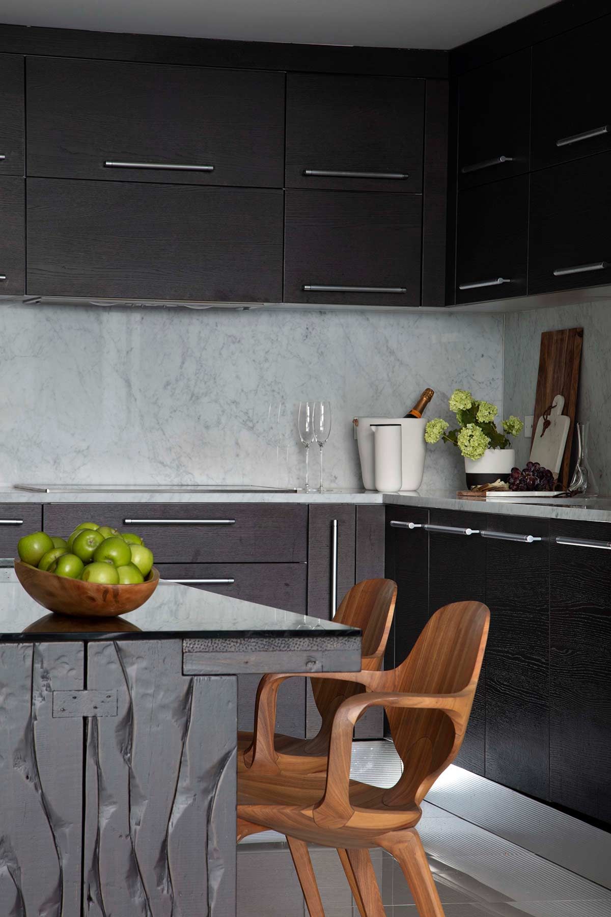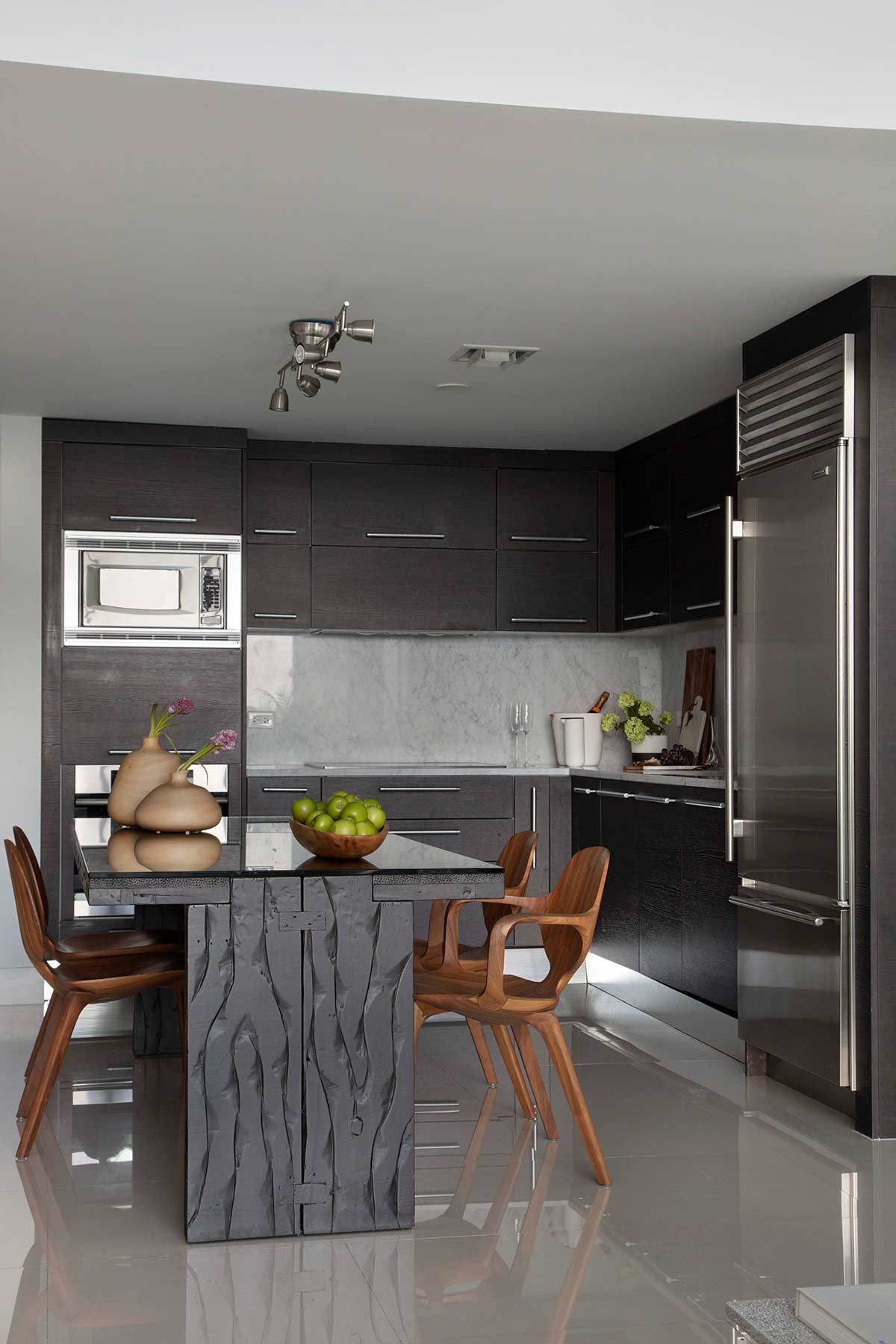 A integração da área social recebeu acabamentos como madeira em tom escuro, mármore Carrara e eletrodomésticos com design expressivo que, além de ampla, ficou bem iluminada pela luz natural e vista para o oceano – que pode ser apreciada de todos os cantos do apê.