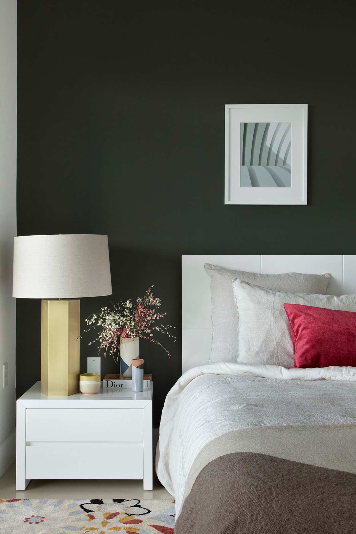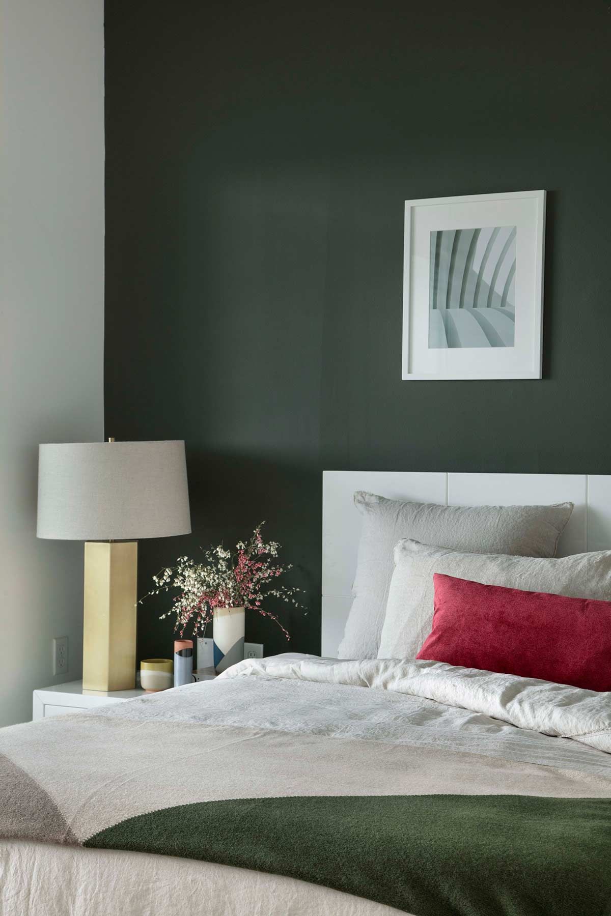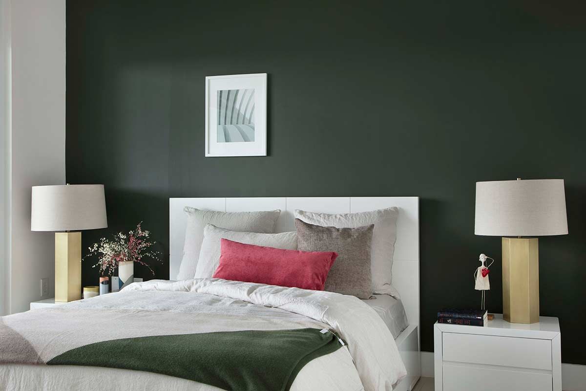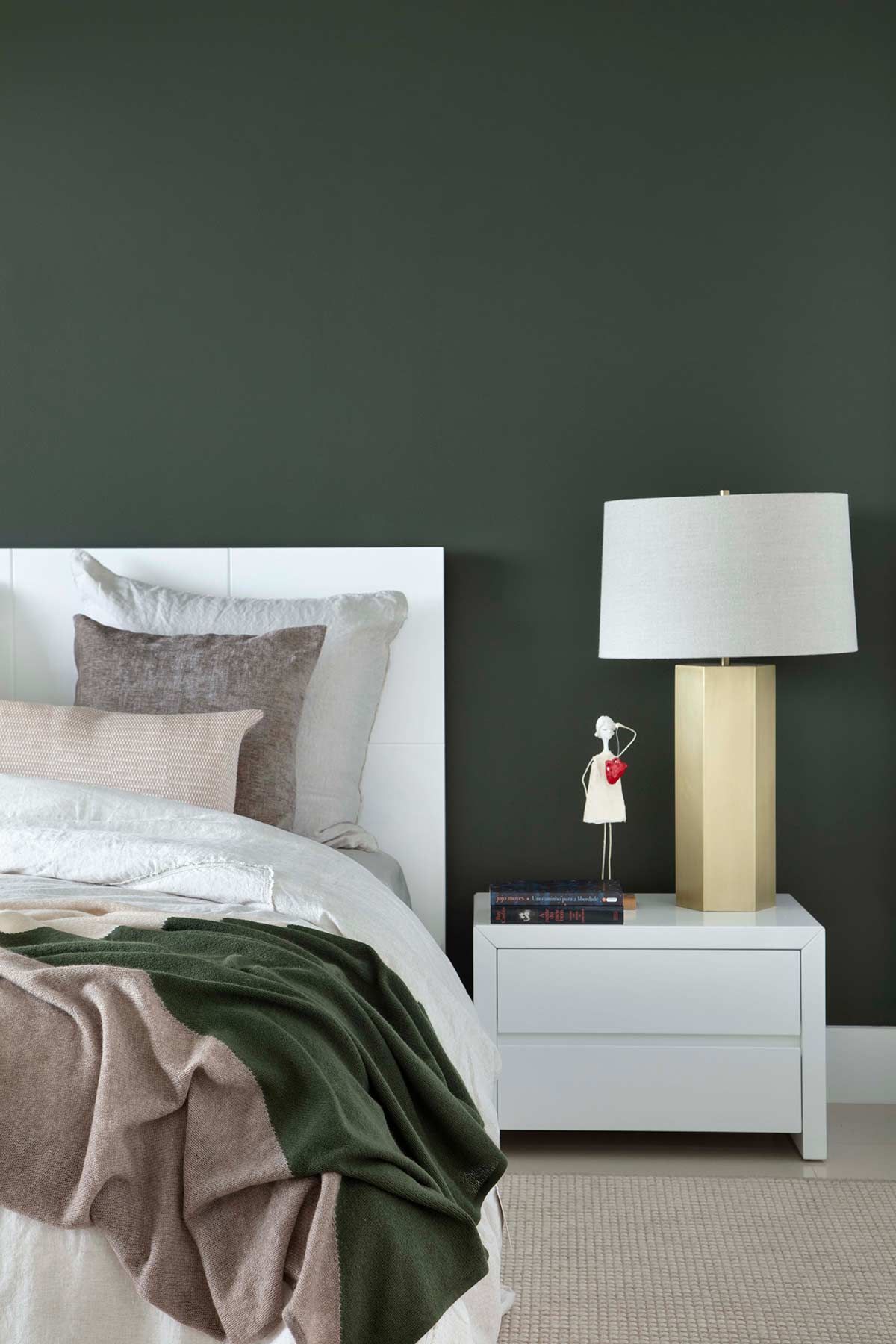 No quarto do casal, a arquiteta explorou os contrastes ao pintar uma parede de verde escura, em um cômodo com mobiliário e piso claros. A intenção dessa escolha e do linho na roupa de cama foi remeter ao bem-estar da natureza, ares que os clientes realmente desejavam para a casa de férias. Ao passo que a morada é contemporânea, o uso de cores em pontos estratégicos e a mistura de texturas, resultou em um apartamento com personalidade e aconchego.