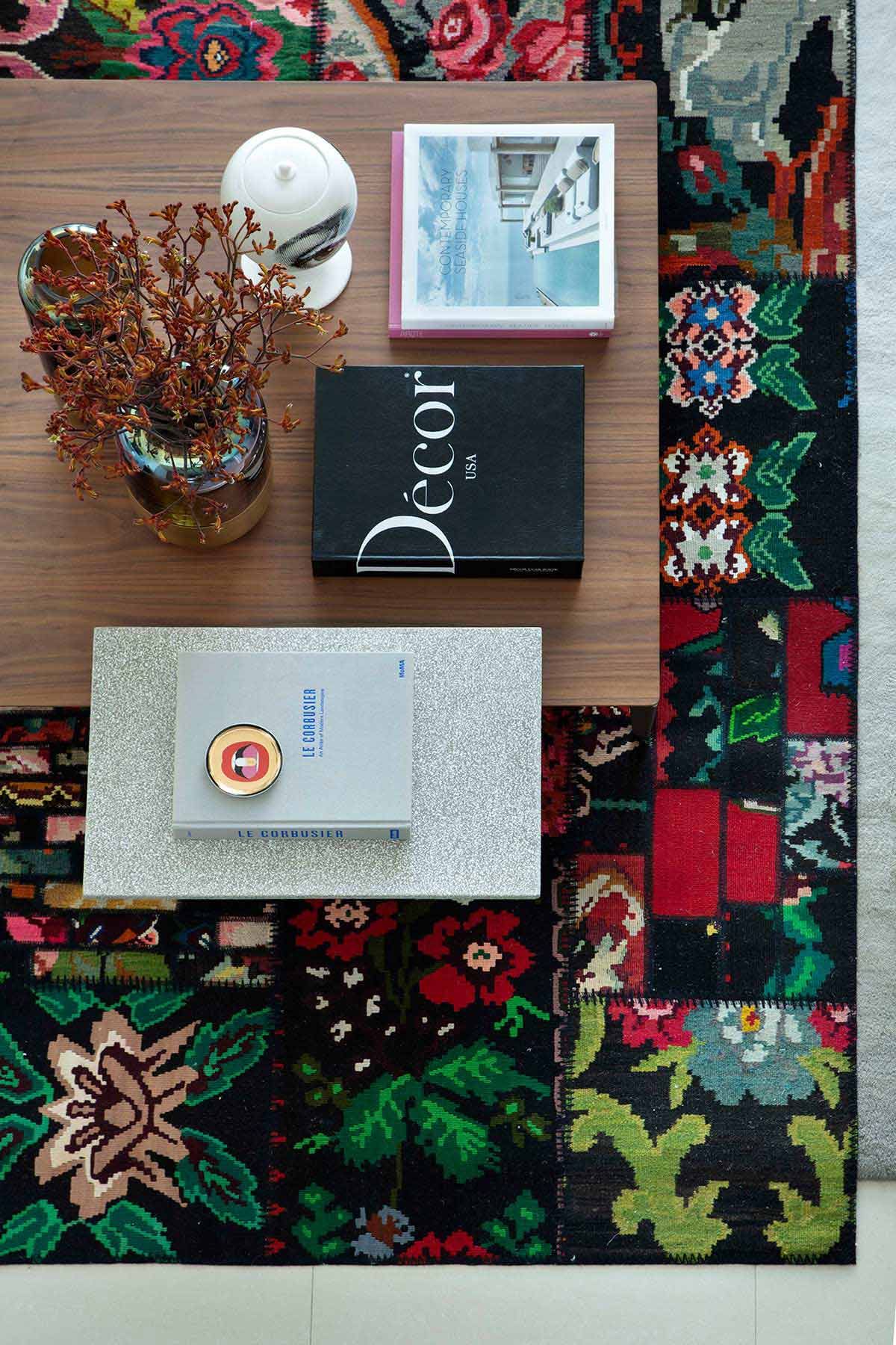 Os principais desejos dos moradores eram: inserir o sofá de couro branco, integrar a cozinha à sala, e instalar pisos mais claros em todo apartamento. A paleta de cores do estar foi pensada a partir do tapete estampado que sobrepõe um neutro, e seguimos com a mesma linguagem até a cozinha.