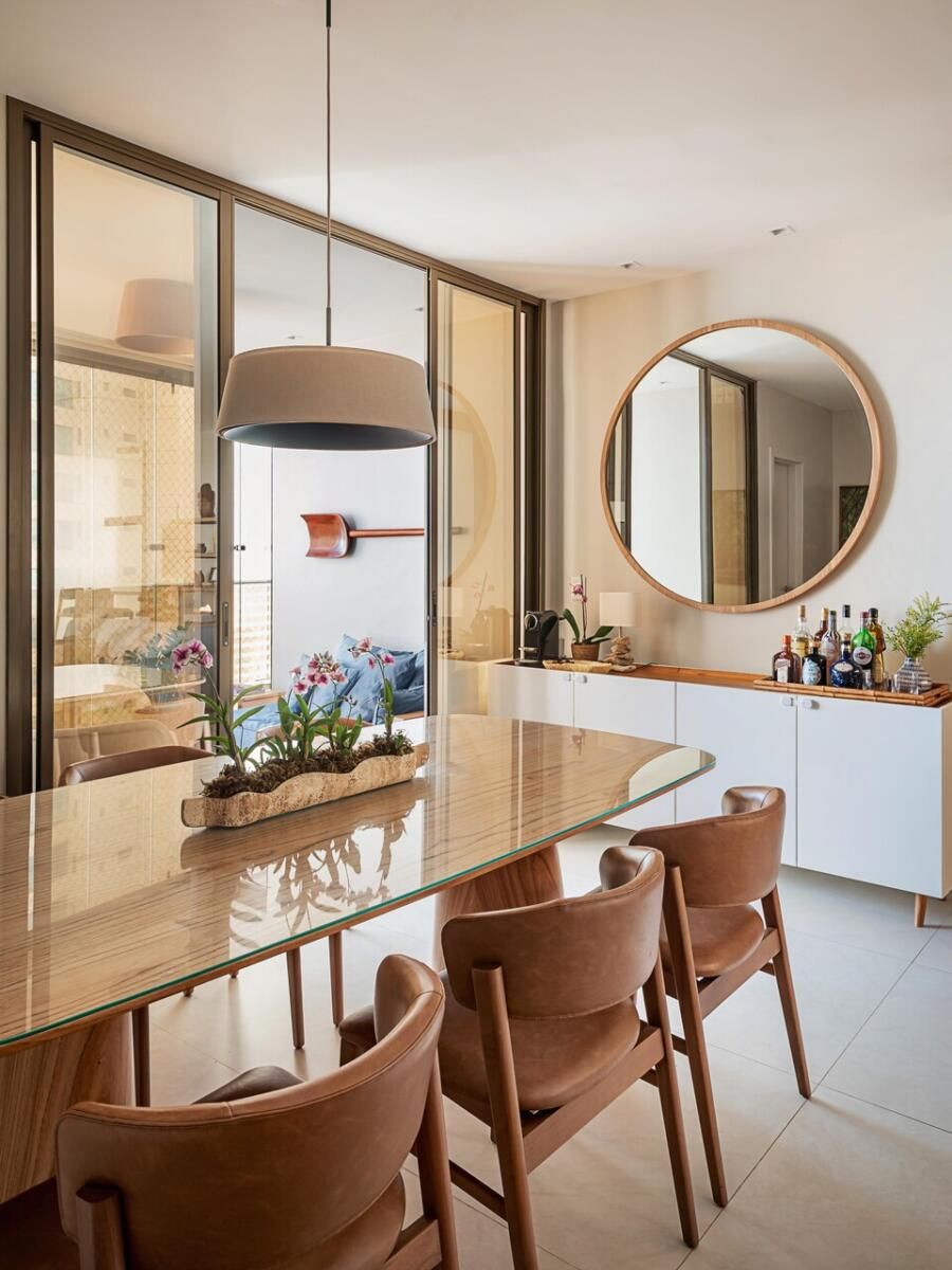 Móveis antigos também foram incorporados ao projeto, garantindo personalidade e funcionalidade. Novas peças se somaram a esse acervo familiar, como a mesa de jantar, as cadeiras e a luminária pendente da sala de jantar. Na sala de estar, a poltrona de couro em tom castanho conversa bem com os demais elementos, incluindo uma escultura branca com formas orgânicas do artista visual Mário Lopomo, posicionada ao lado da estante.