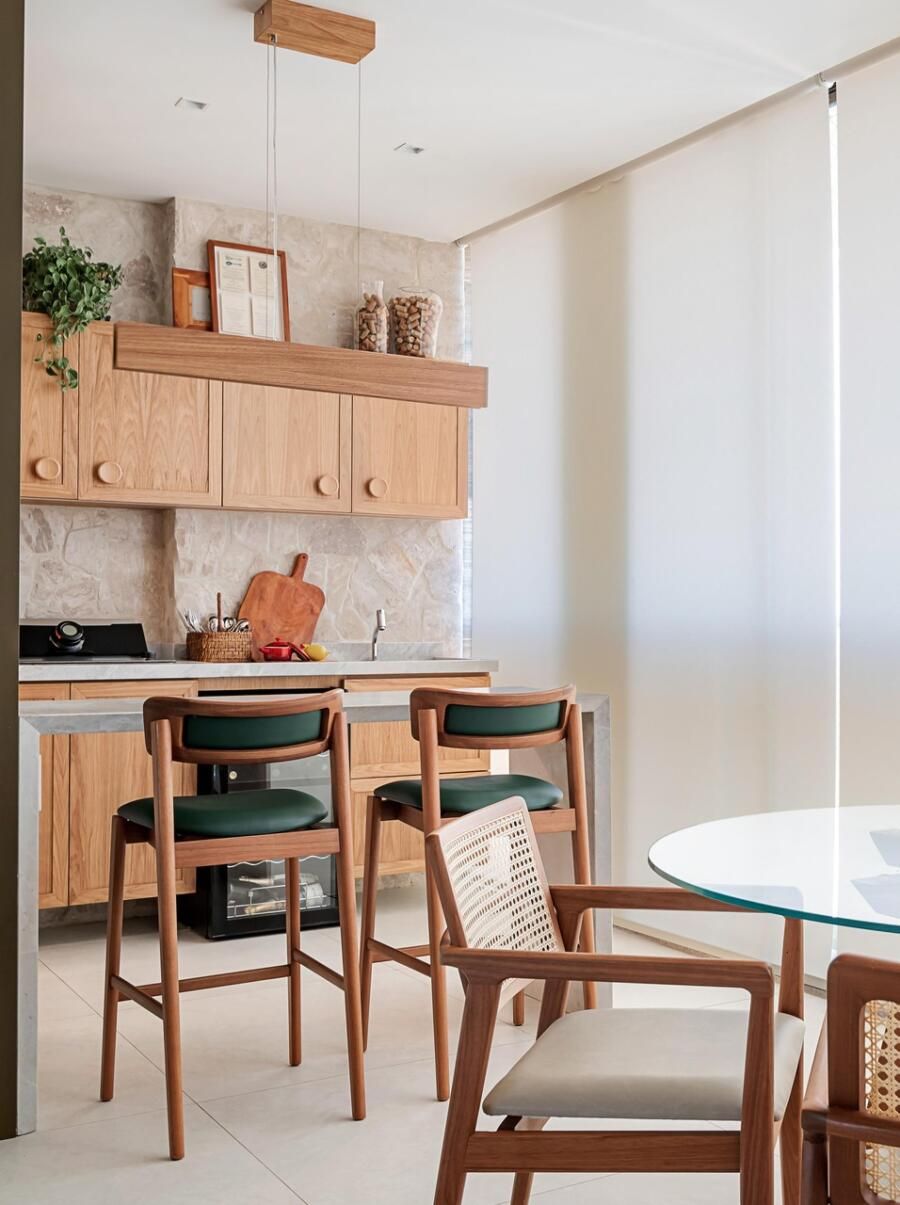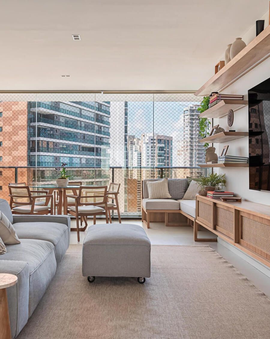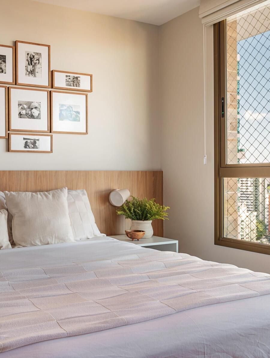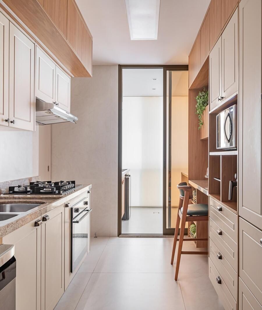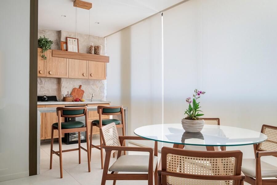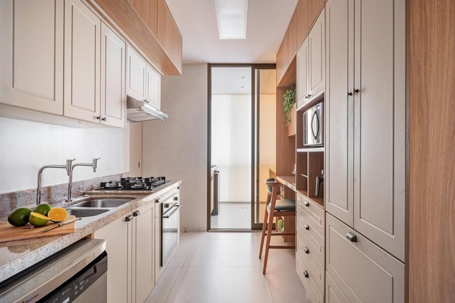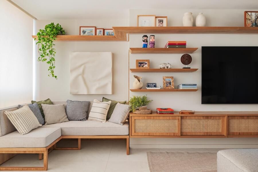 A paleta de cores segue uma linha neutra e clara, com predominância de tons como areia, branco e madeira natural. As marcenarias sob medida em freijó trazem aconchego, e o piso de porcelanato, já instalado pela construtora, foi mantido. Essa linguagem visual também está presente na cozinha, na varanda gourmet e no quarto do casal.