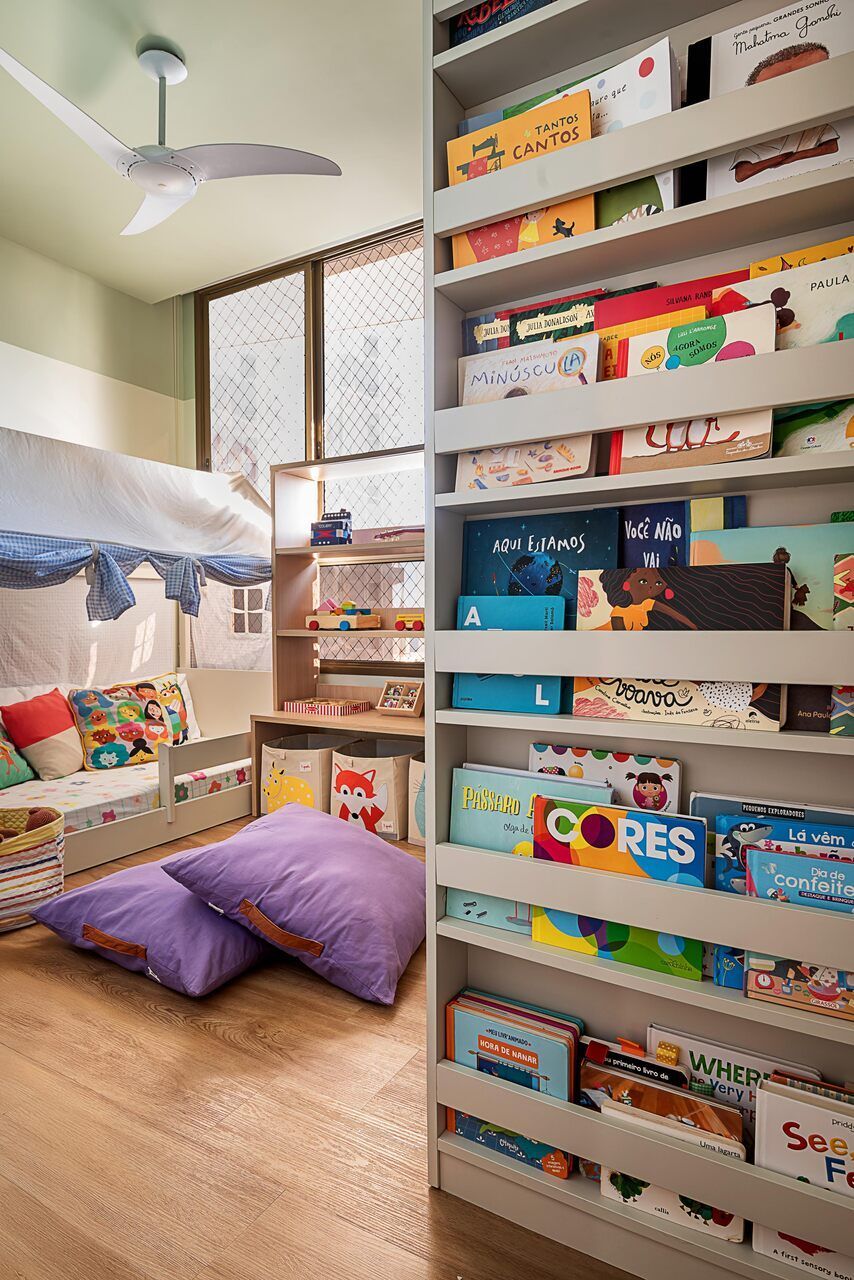 Nos espaços dedicados aos filhos, a arquiteta investiu em praticidade e alegria. O piso vinílico amadeirado oferece conforto térmico e é fácil de limpar. Marcenarias em carvalho e cores suaves completam a ambientação, tornando os cômodos infantis mais acolhedores.