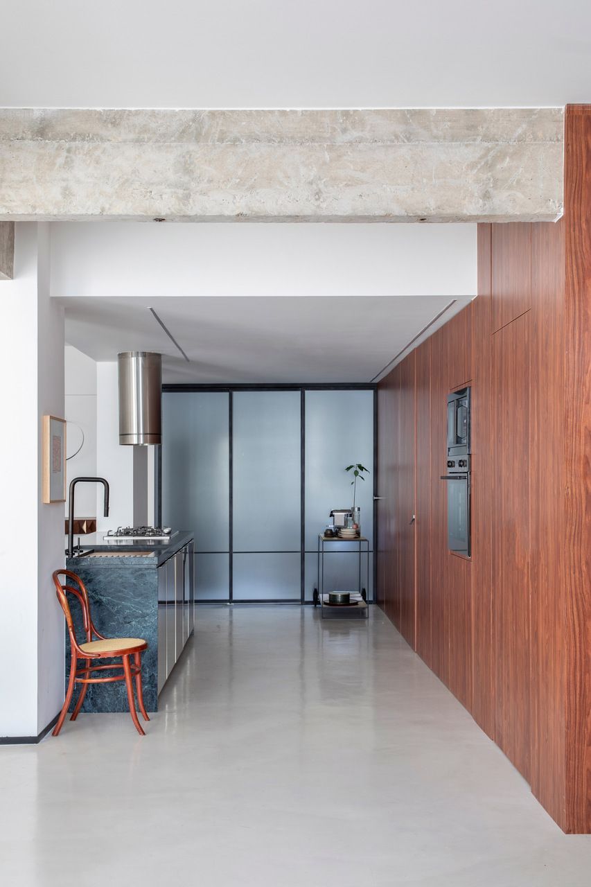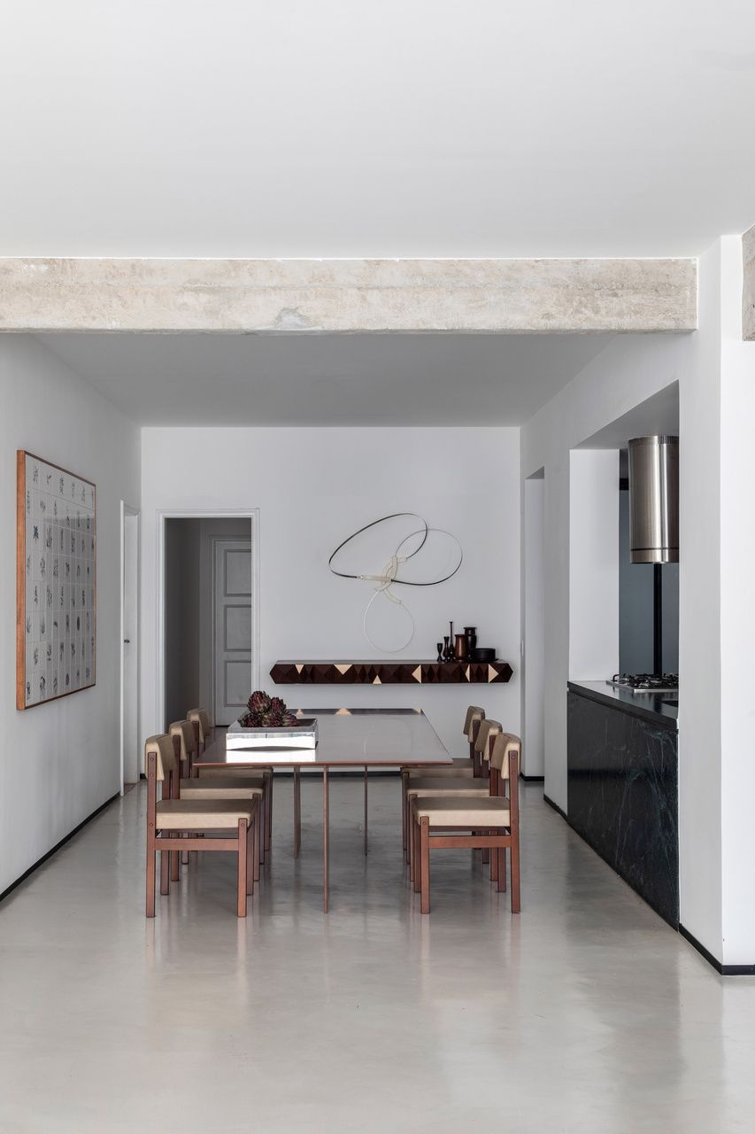Para reforçar a atmosfera de galeria, o arquiteto optou por um piso monolítico de microcimento cinza claro, que se estende por toda a sala, cozinha e lavanderia. Esse tom neutro ajuda a destacar os móveis de madeira escura e os detalhes em preto, como os rodapés invertidos e as vigas em concreto aparente.