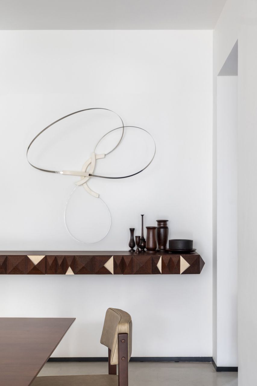 O principal desejo do casal era que o apartamento tivesse um ar de galeria de arte, onde pudessem expor suas peças favoritas. O projeto foi sendo desenvolvido aos poucos, observando cada detalhe do espaço. A escolha do mobiliário seguiu essa ideia, misturando clássicos do design brasileiro com criações contemporâneas.