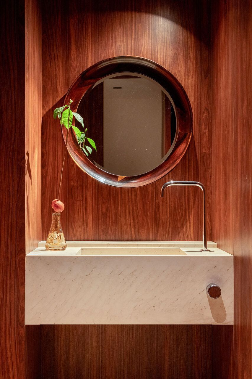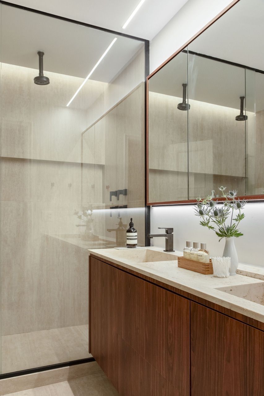 Nos banheiros, o arquiteto seguiu a mesma paleta elegante e atemporal, combinando armários de Pau-ferro com mármore Travertino Navona no piso, nas paredes e na bancada.