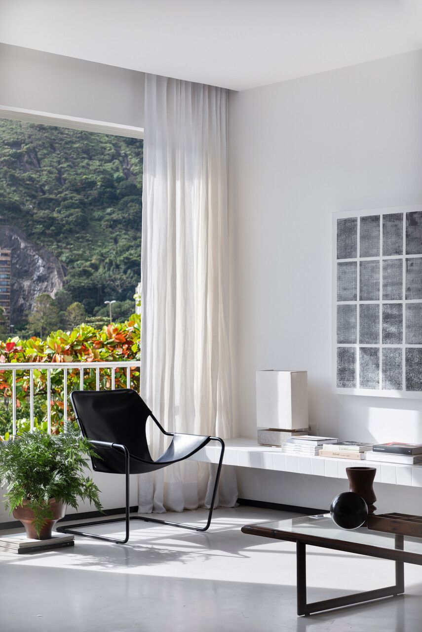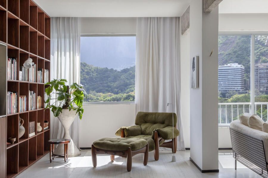 Na parede principal da sala, um painel de madeira Pau-ferro dá unidade ao ambiente, camuflando portas e armários. Um dos lados se transforma em estante-biblioteca, enquanto o outro esconde o espaço de armazenamento da cozinha. Para suavizar o visual e trazer um toque carioca, as janelas receberam cortinas de cambraia de linho branco.