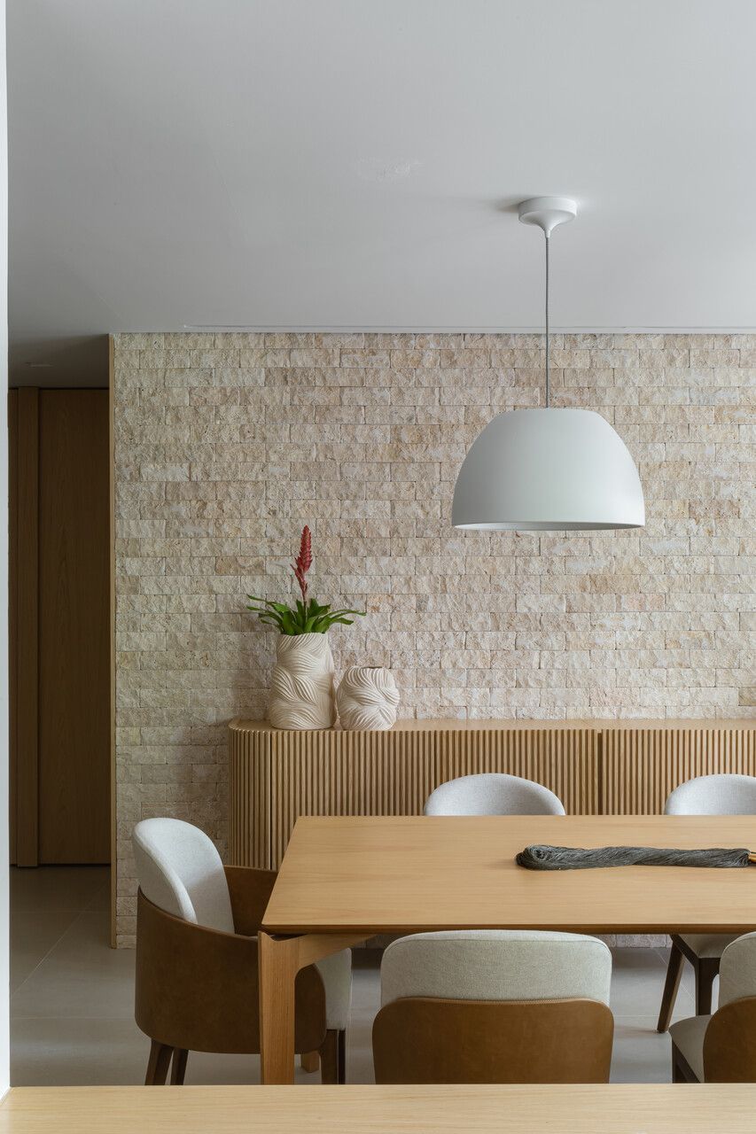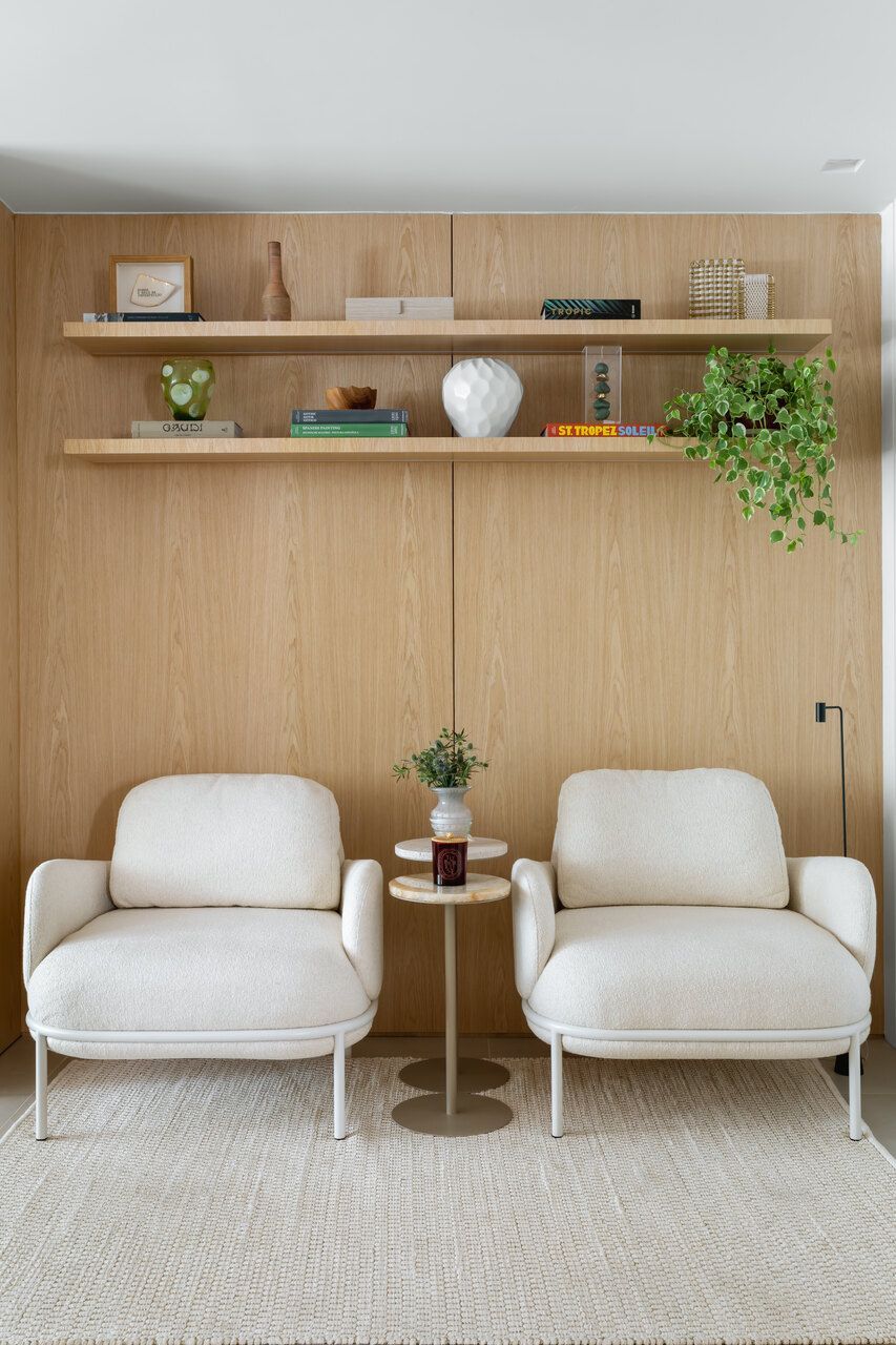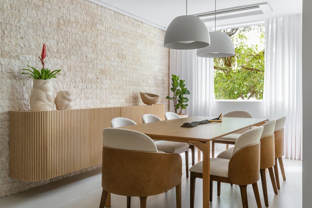 O mobiliário e a decoração foram cuidadosamente escolhidos para refletir uma elegância simples, utilizando materiais naturais que complementam o entorno.
