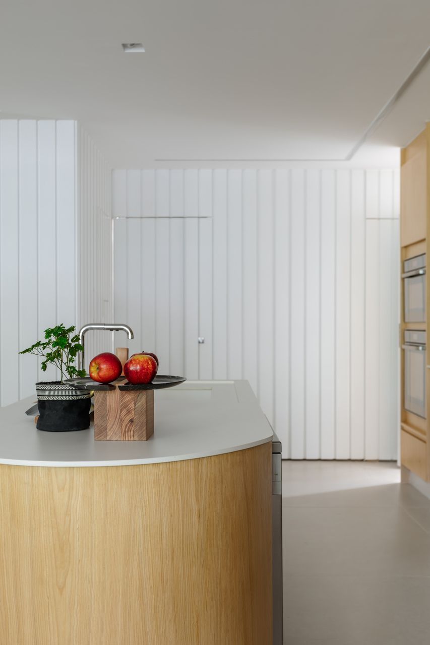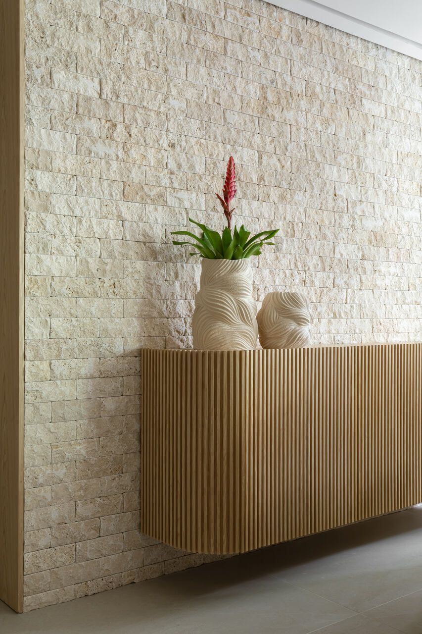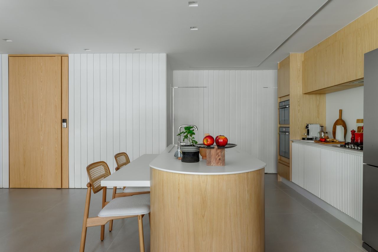 O mobiliário e a decoração foram cuidadosamente escolhidos para refletir uma elegância simples, utilizando materiais naturais que complementam o entorno.