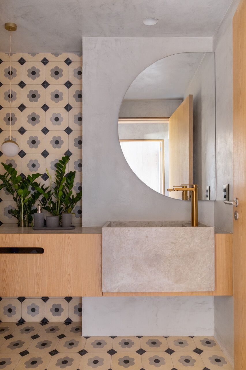 A cozinha, ampliada e integrada ao restante da área social, apresenta ladrilhos hidráulicos decorativos e uma ilha bordô que se destaca em meio à marcenaria neutra. As portas arqueadas em ferro e vidro jateado conectam a cozinha à área de serviço, garantindo privacidade e iluminação natural.