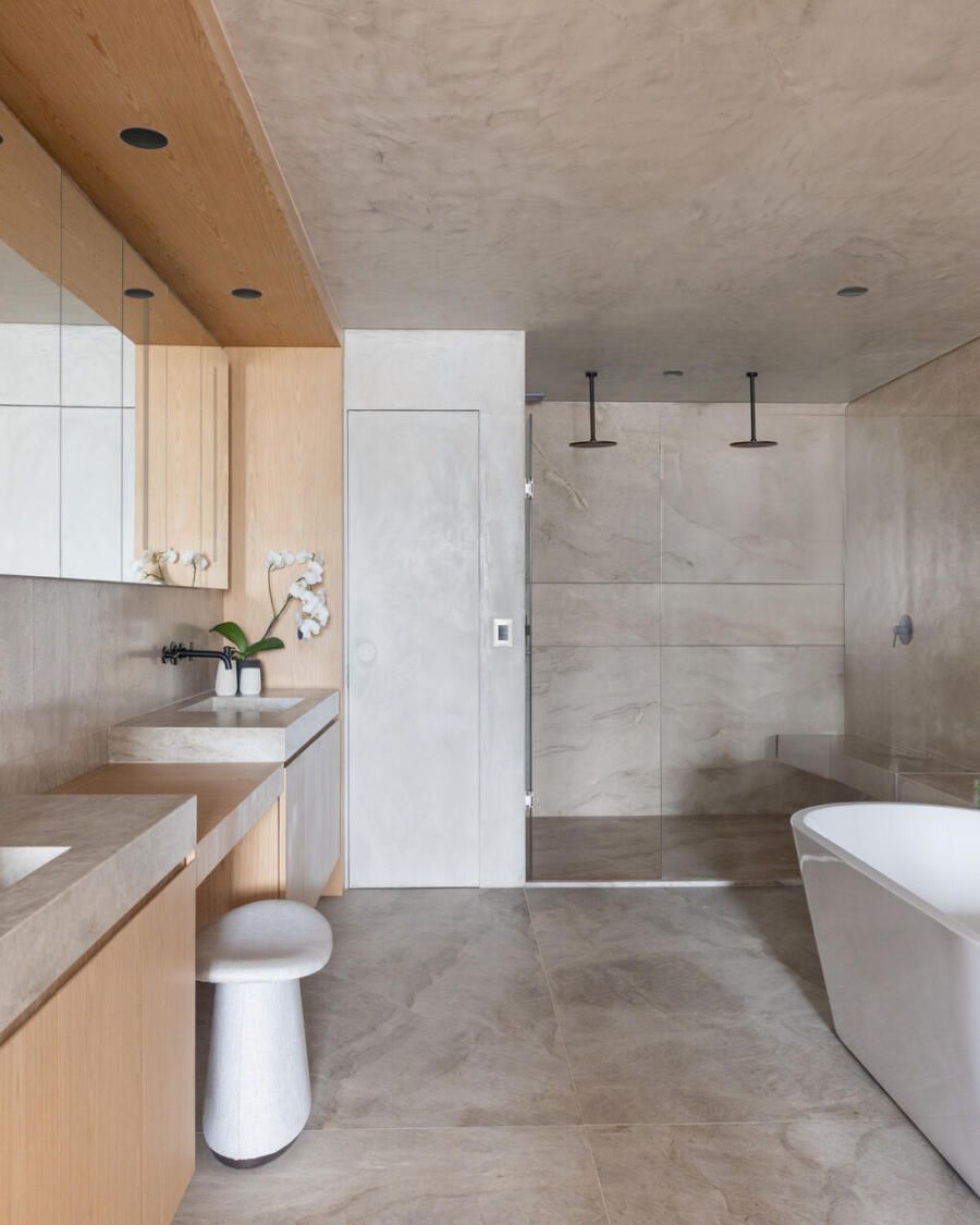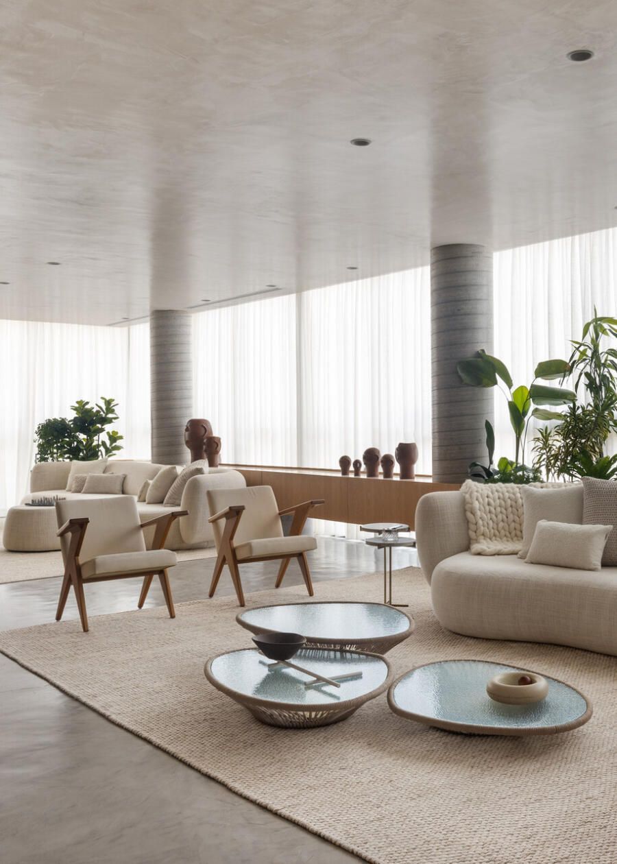 O projeto privilegiou materiais naturais, como madeira, pedra e microcimento, combinados a uma paleta neutra que realça cores marcantes, como bordô e verde. Elementos curvos e arcos evocam a elegância da arquitetura art nouveau, trazendo um toque lúdico e onírico ao espaço, em perfeita harmonia com o conceito inspirado em Gaudí.