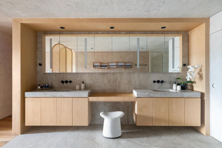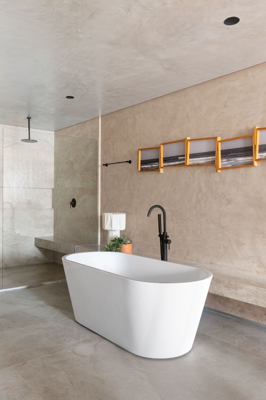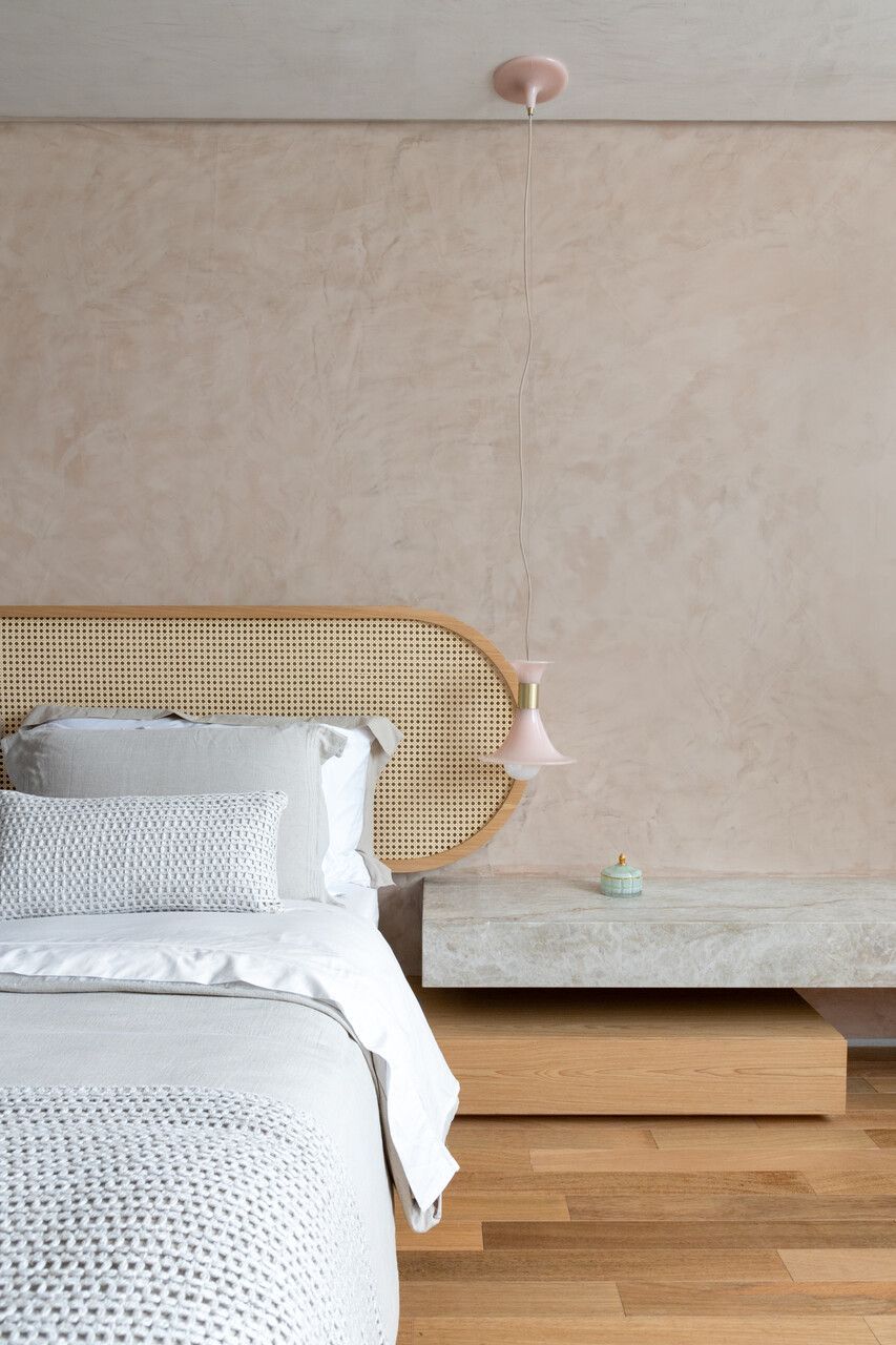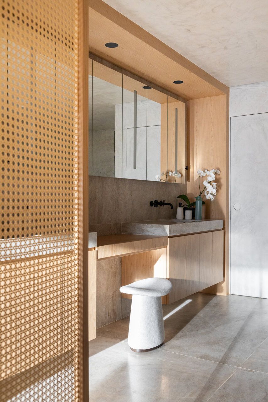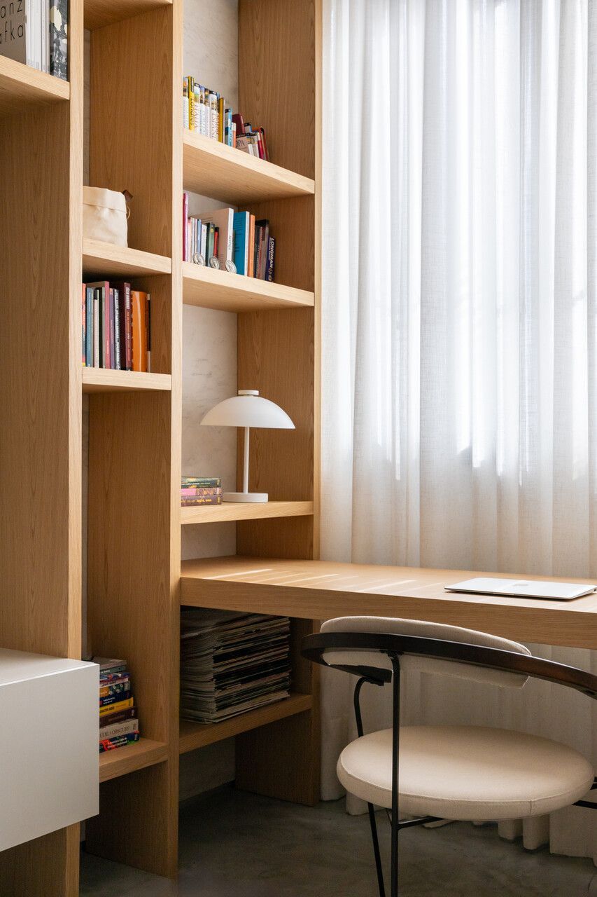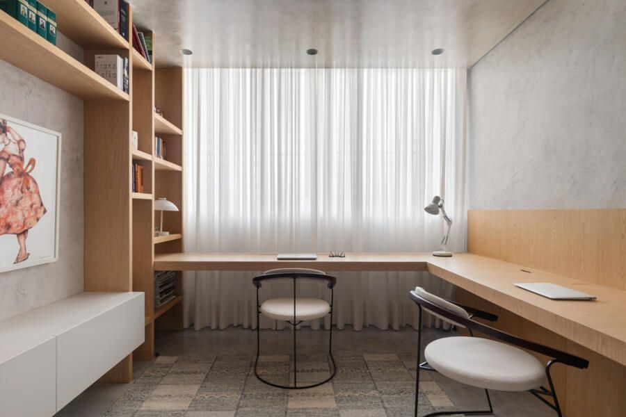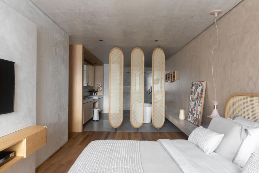O escritório, funcional e simples, substituiu uma das suítes originais, enquanto a suíte principal foi transformada em um refúgio relaxante com um amplo closet e integração entre dormitório e banheiro. A diferenciação de materiais, como madeira no quarto e quartzito no banheiro, separa sutilmente os espaços. Biombos móveis e elementos curvos, como cabeceira e painéis de palhinha, reforçam a atmosfera inspirada em spas.