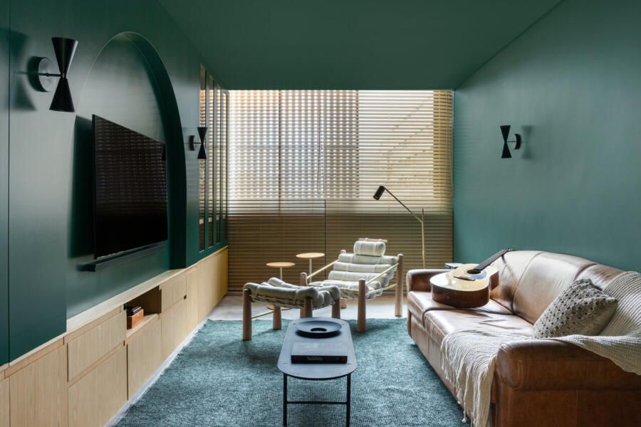 A sala de charuto, inspirada em bibliotecas clássicas, foi projetada para encontros íntimos. Tons de verde escuro, estantes elegantes e detalhes em arco criam um ambiente sóbrio e acolhedor. Já o lavabo, reposicionado no projeto, mantém a linguagem curva e minimalista do restante do apartamento.