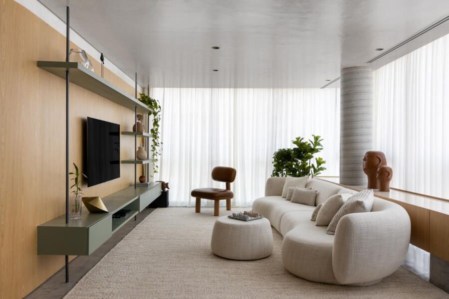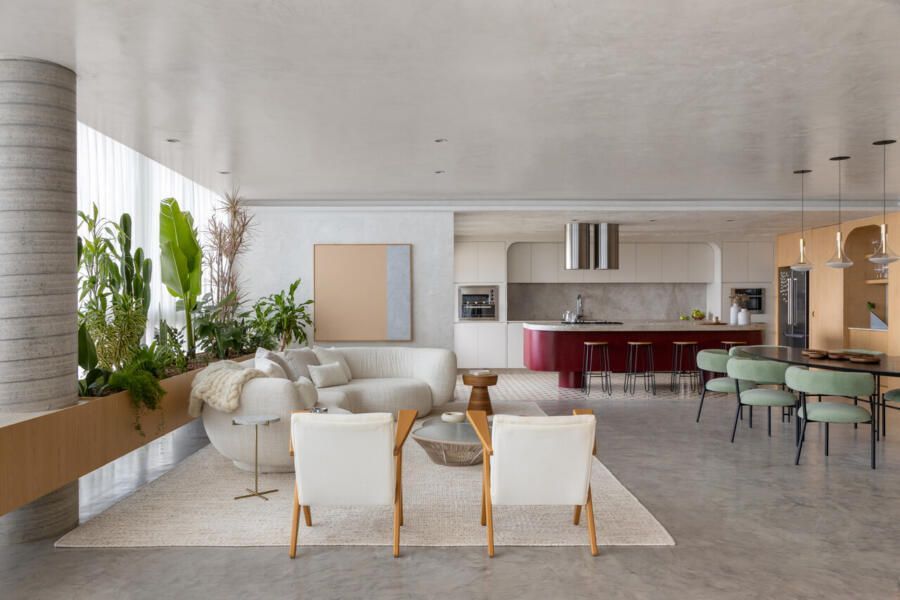 A área social recebeu atenção especial para acomodar encontros com amigos e familiares, com uma cozinha integrada. O conceito do projeto incluiu um painel amadeirado curvilíneo que percorre a sala de jantar, cozinha e sala de TV, promovendo fluidez e funcionalidade. Esse painel esconde acessos e abriga funções práticas, como despensa e cristaleira, enquanto equilibra com o microcimento aplicado no piso, paredes e teto.