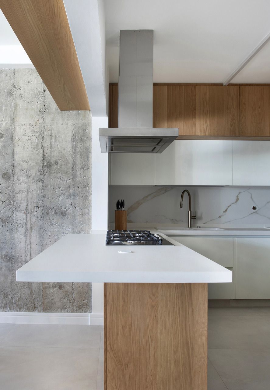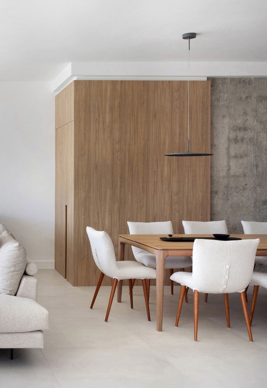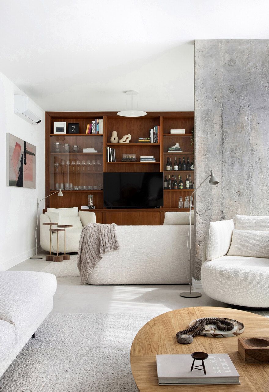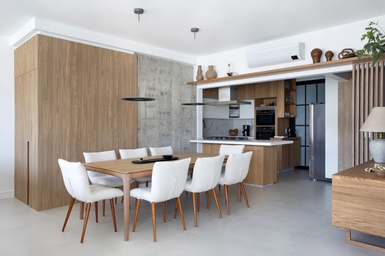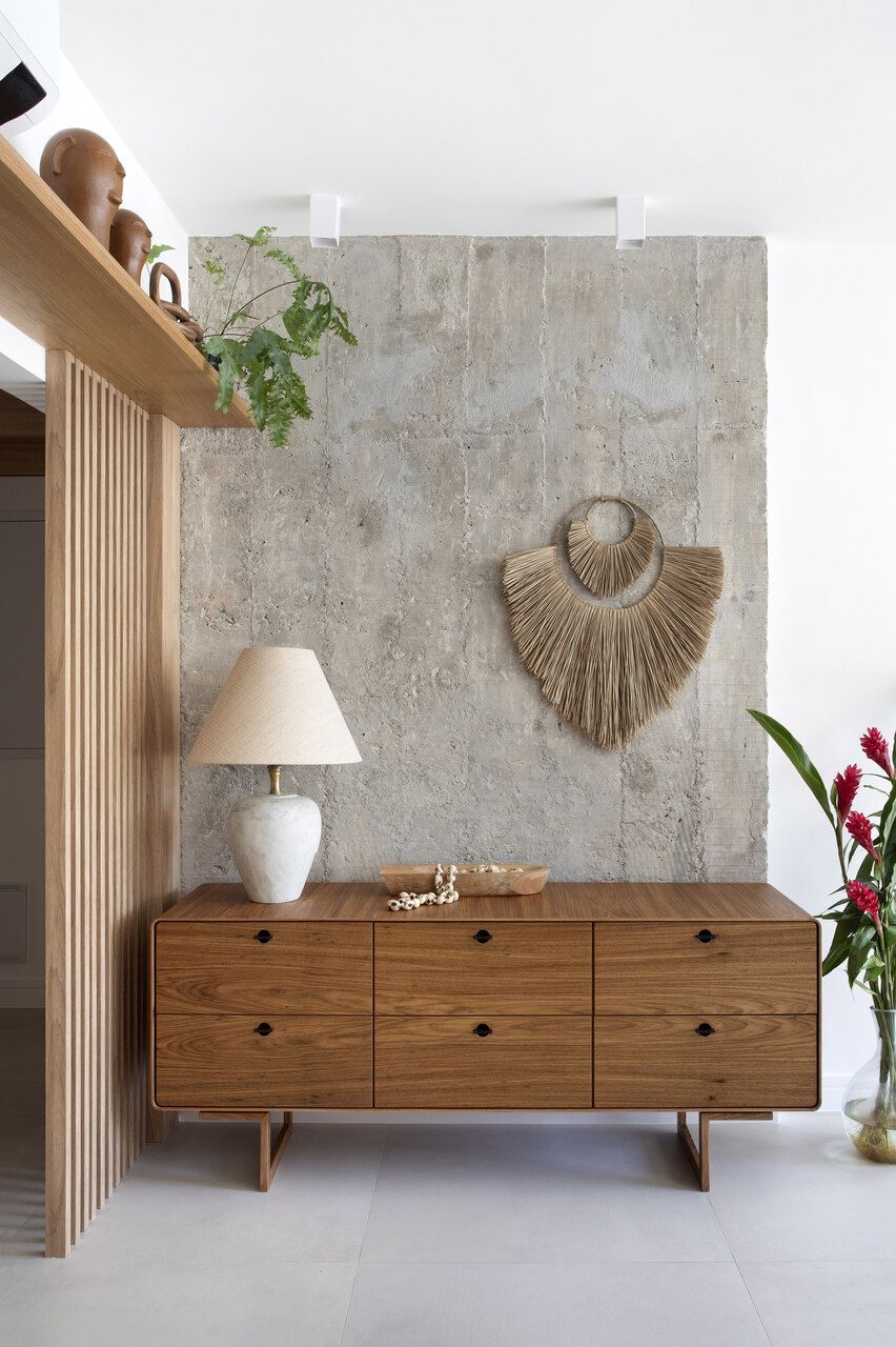Como havia grandes elementos estruturais na planta, removemos a argamassa de emboço dos pilares para contrapor o concreto bruto aparente aos painéis de madeira Tauari.