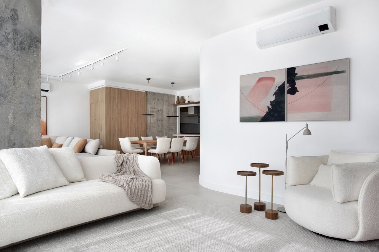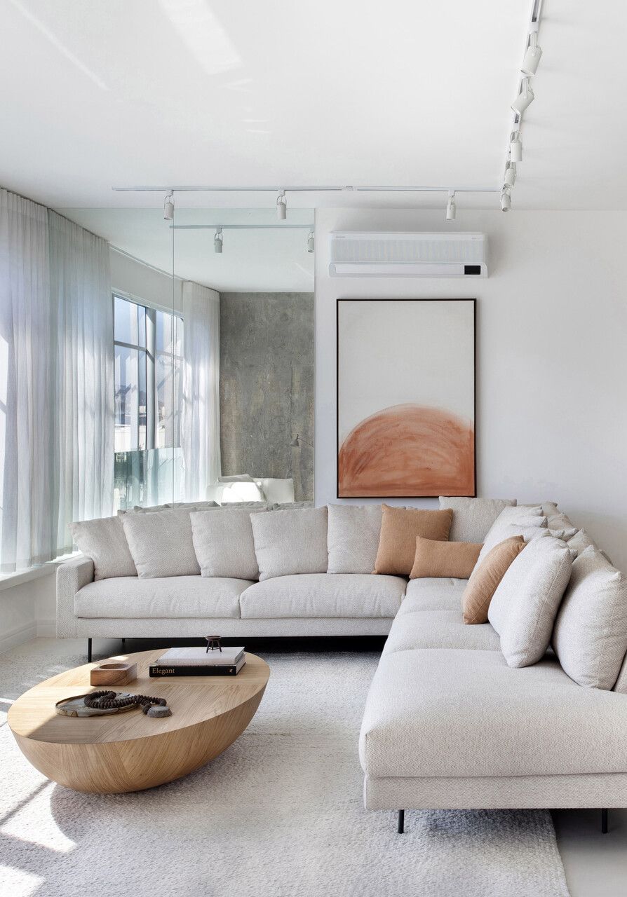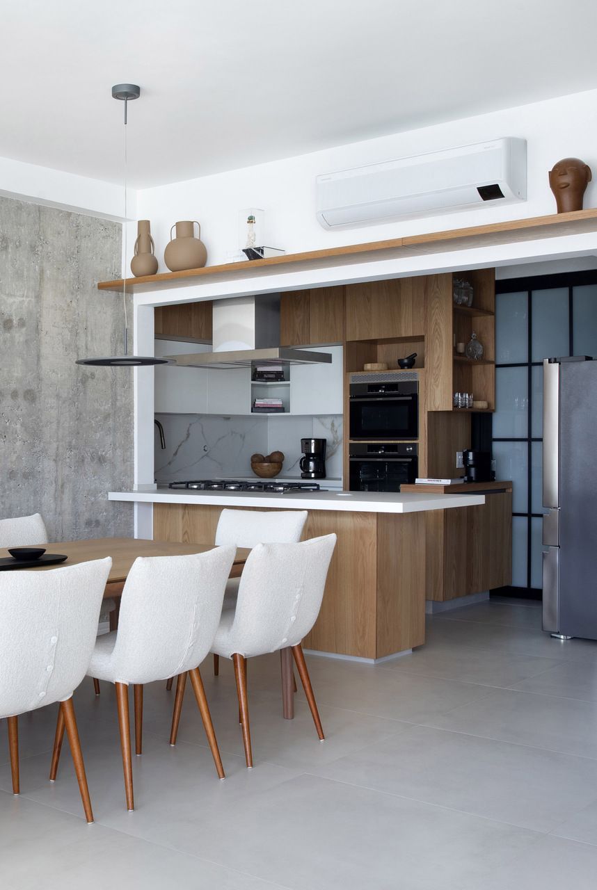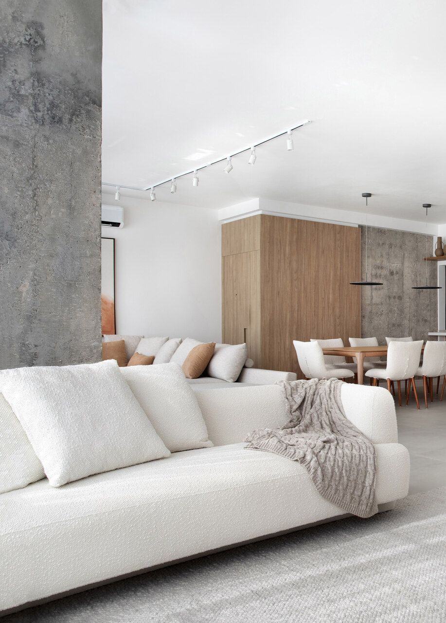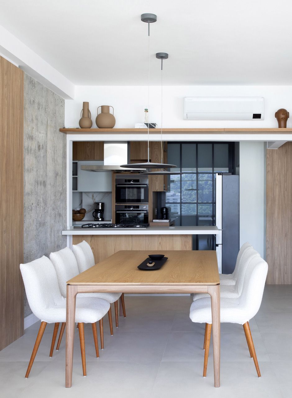 Com a intenção de criar identidade visual em todo apartamento e aumentar a sensação de amplitude dos espaços, o arquiteto adotou uma base neutra e clara, em tons de cinza, branco e madeira Tauari, com destaque para os pilares em concreto bruto aparente e o piso em porcelanato cinza, de grande formato .