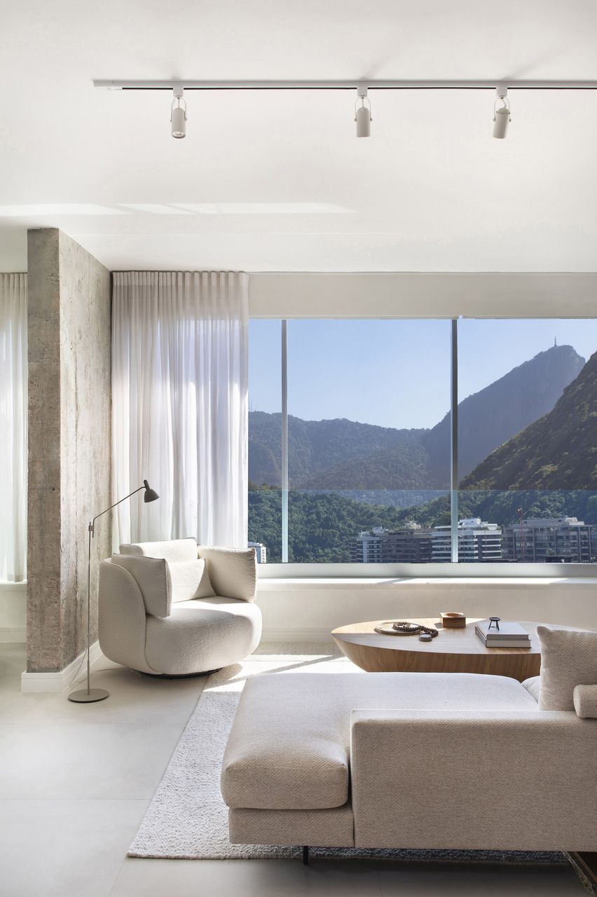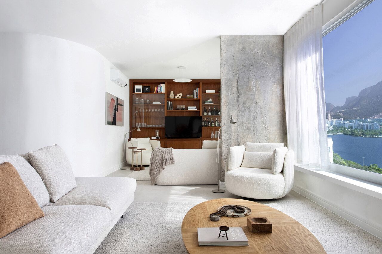 Segundo o arquiteto, o objetivo geral do projeto foi criar espaços amplos, integrados e fartos em luz natural, e manter o protagonismo da vista da lagoa e das montanhas. Para isso, além de demolir algumas paredes, ele também arredondou uma quina de parede da sala.