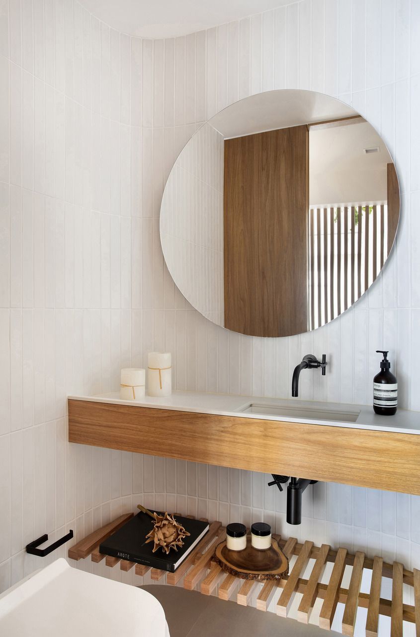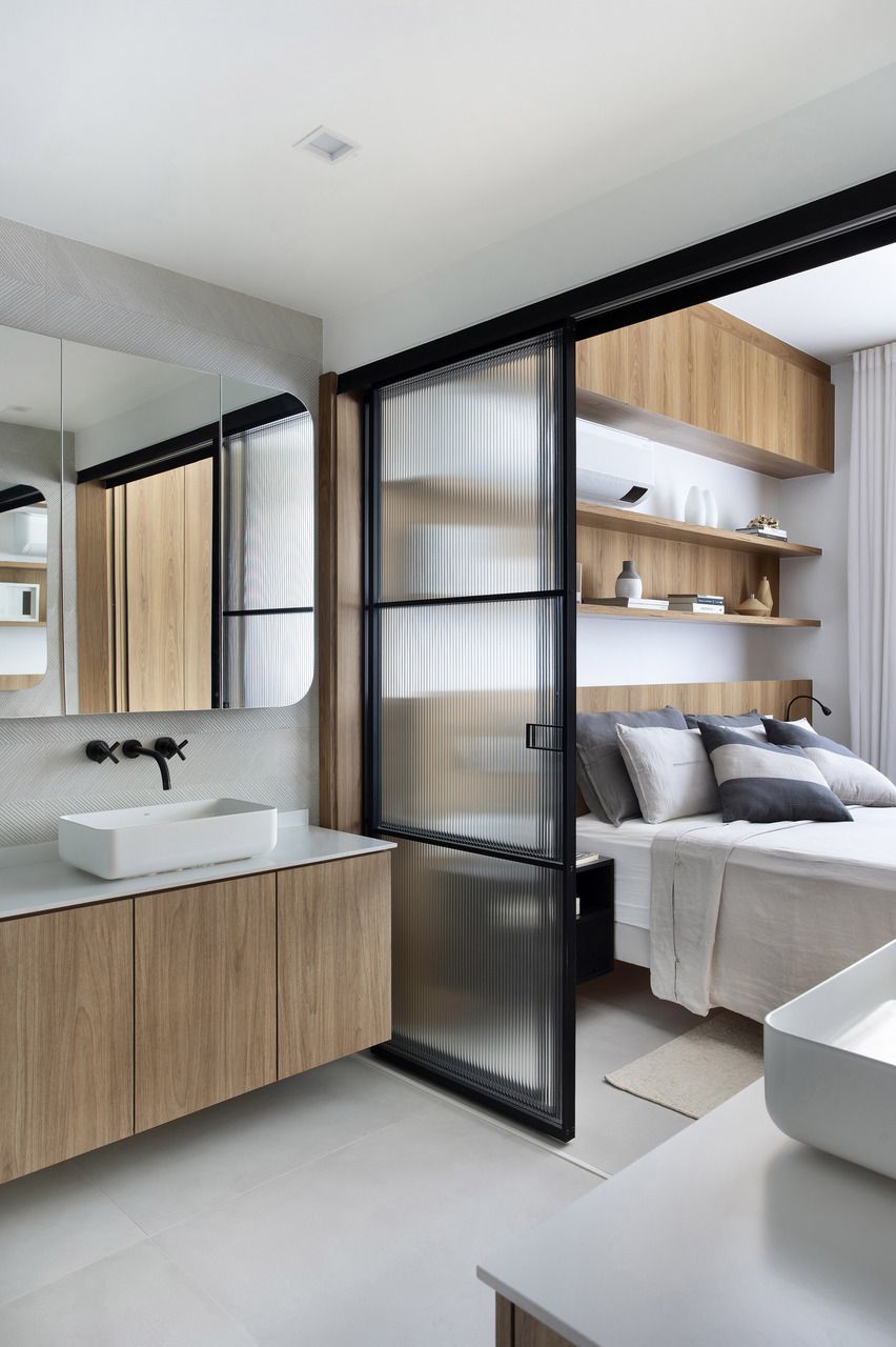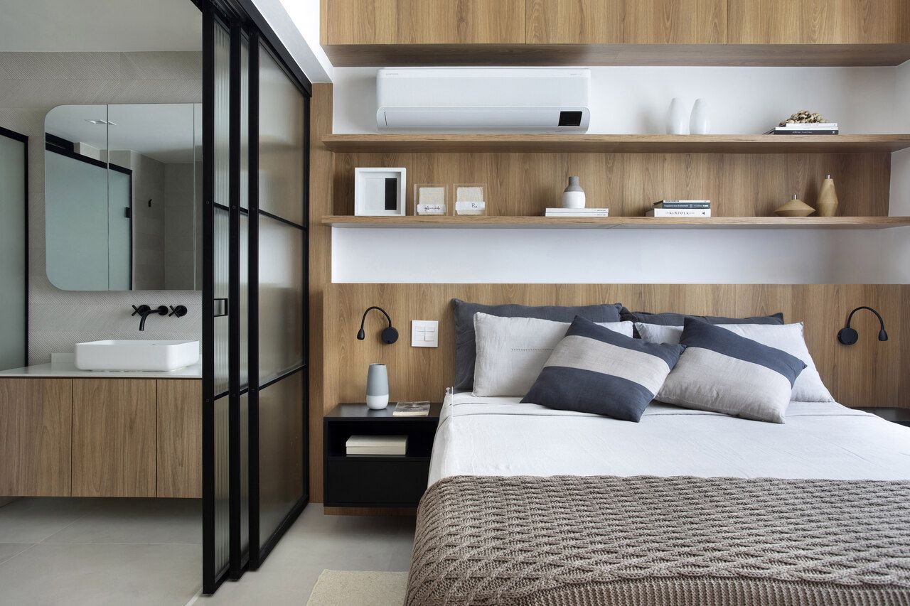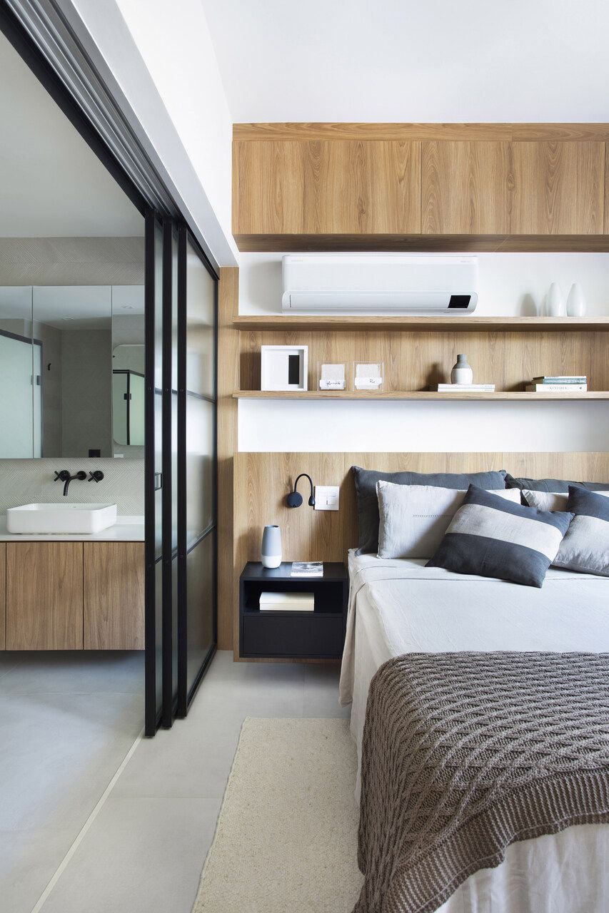 Com a reforma, não só a cozinha foi aberta para a sala, como também um quarto de hóspedes foi reduzido para ampliar a suíte do casal. Já o banheiro social foi dividido em dois para dar origem ao lavabo e um banheiro menor, que atende os dois quartos de hóspedes.