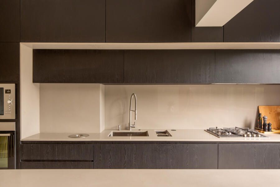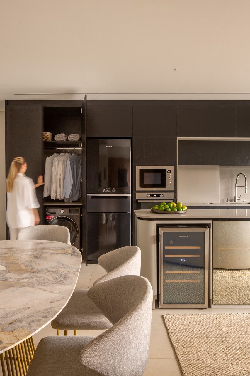 O projeto começou pela transformação total da cozinha, da varanda gourmet e da área de serviço. A cozinha, que antes ocupava um espaço secundário, passou a ser protagonista: foi reposicionada na área mais nobre do apartamento, de frente para a vista da cidade e para a Ponte Estaiada. Essa decisão, porém, exigiu um novo olhar para a área de serviço. A solução encontrada foi escondê-la em marcenaria integrada ao living, um recurso que une discrição, praticidade e estética.
