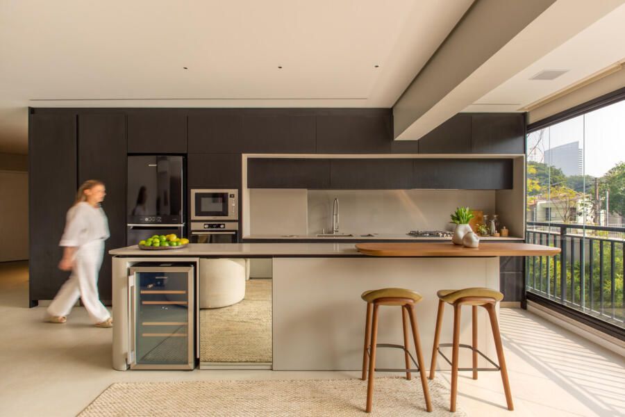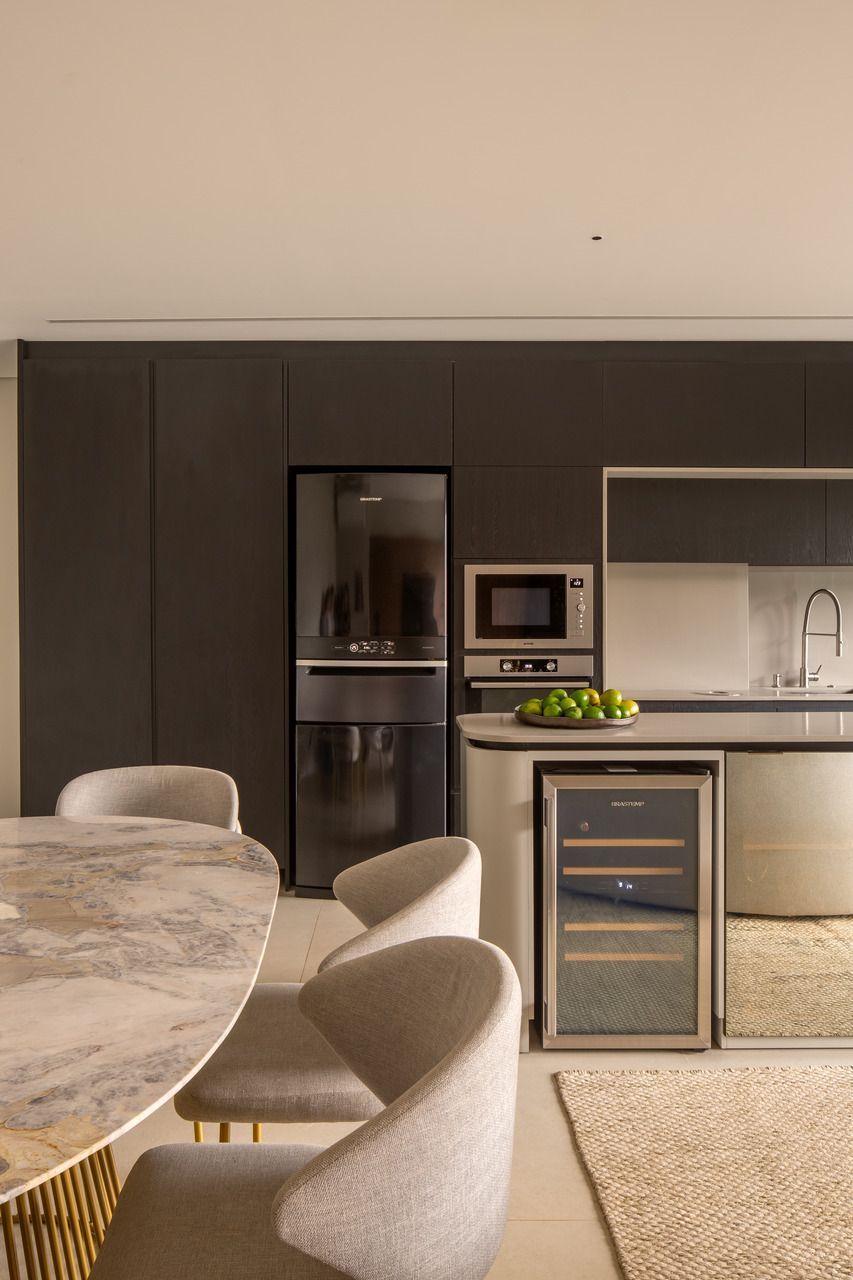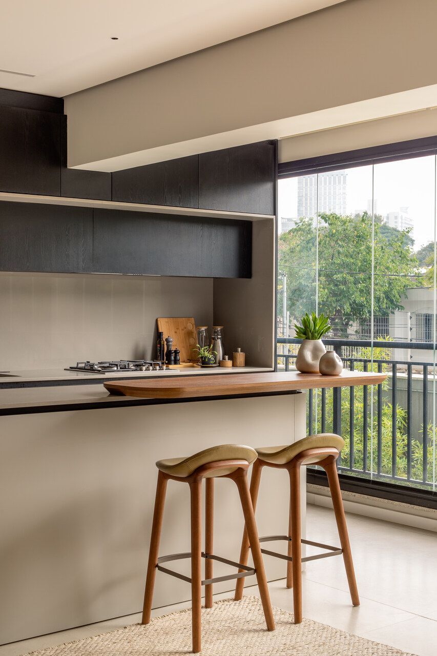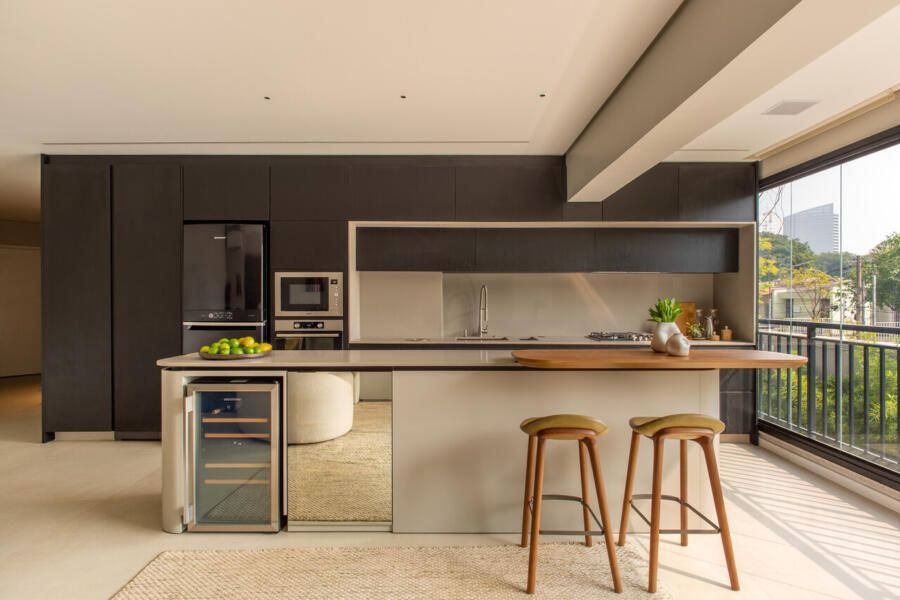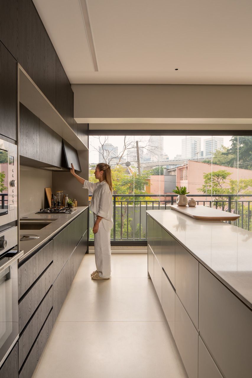 O projeto começou pela transformação total da cozinha, da varanda gourmet e da área de serviço. A cozinha, que antes ocupava um espaço secundário, passou a ser protagonista: foi reposicionada na área mais nobre do apartamento, de frente para a vista da cidade e para a Ponte Estaiada. Essa decisão, porém, exigiu um novo olhar para a área de serviço. A solução encontrada foi escondê-la em marcenaria integrada ao living, um recurso que une discrição, praticidade e estética.