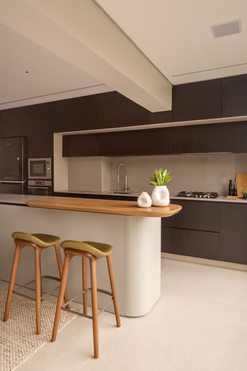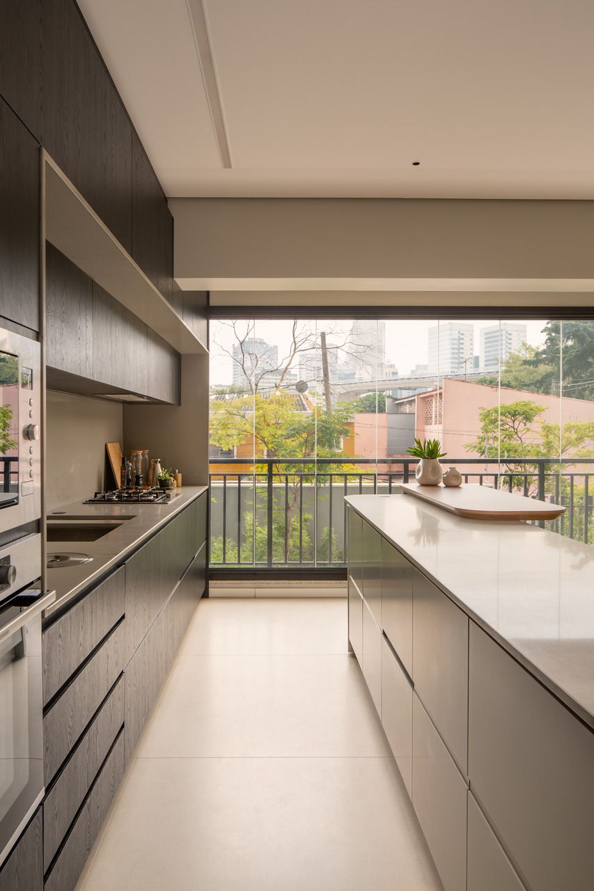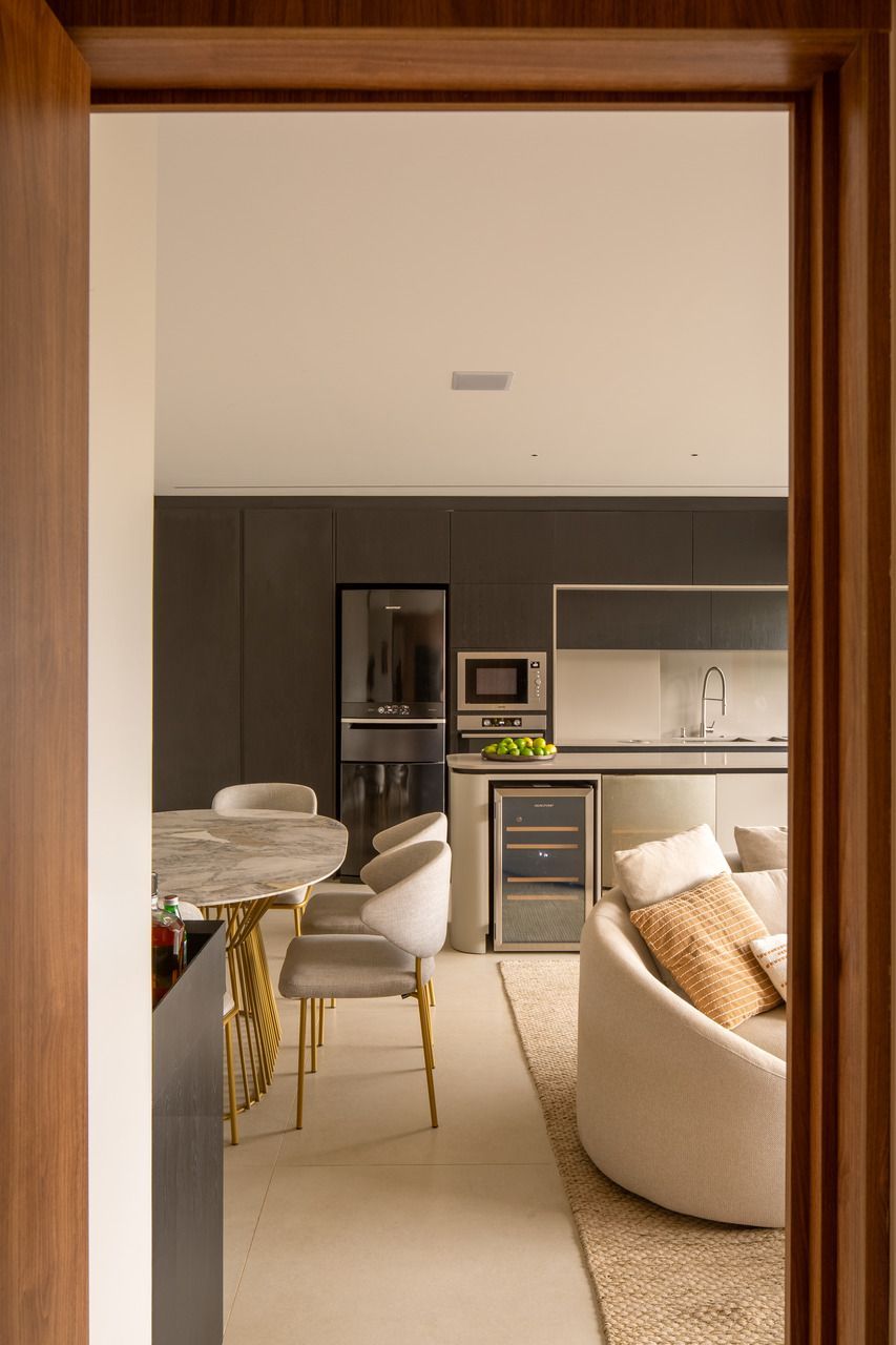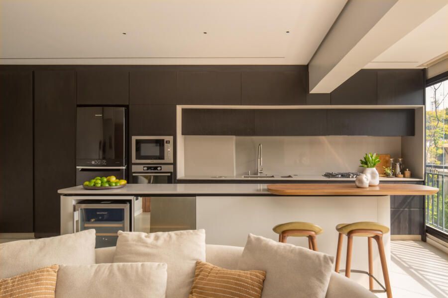 O projeto começou pela transformação total da cozinha, da varanda gourmet e da área de serviço. A cozinha, que antes ocupava um espaço secundário, passou a ser protagonista: foi reposicionada na área mais nobre do apartamento, de frente para a vista da cidade e para a Ponte Estaiada. Essa decisão, porém, exigiu um novo olhar para a área de serviço. A solução encontrada foi escondê-la em marcenaria integrada ao living, um recurso que une discrição, praticidade e estética.