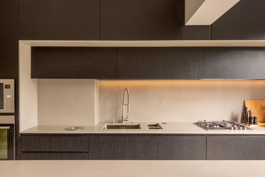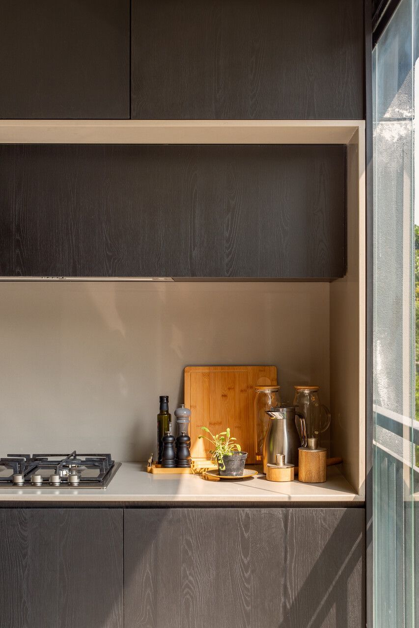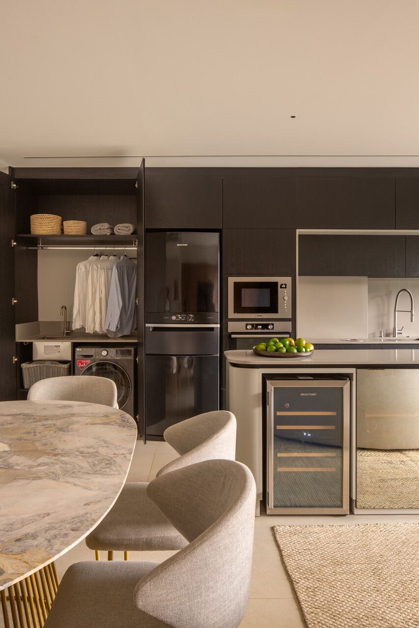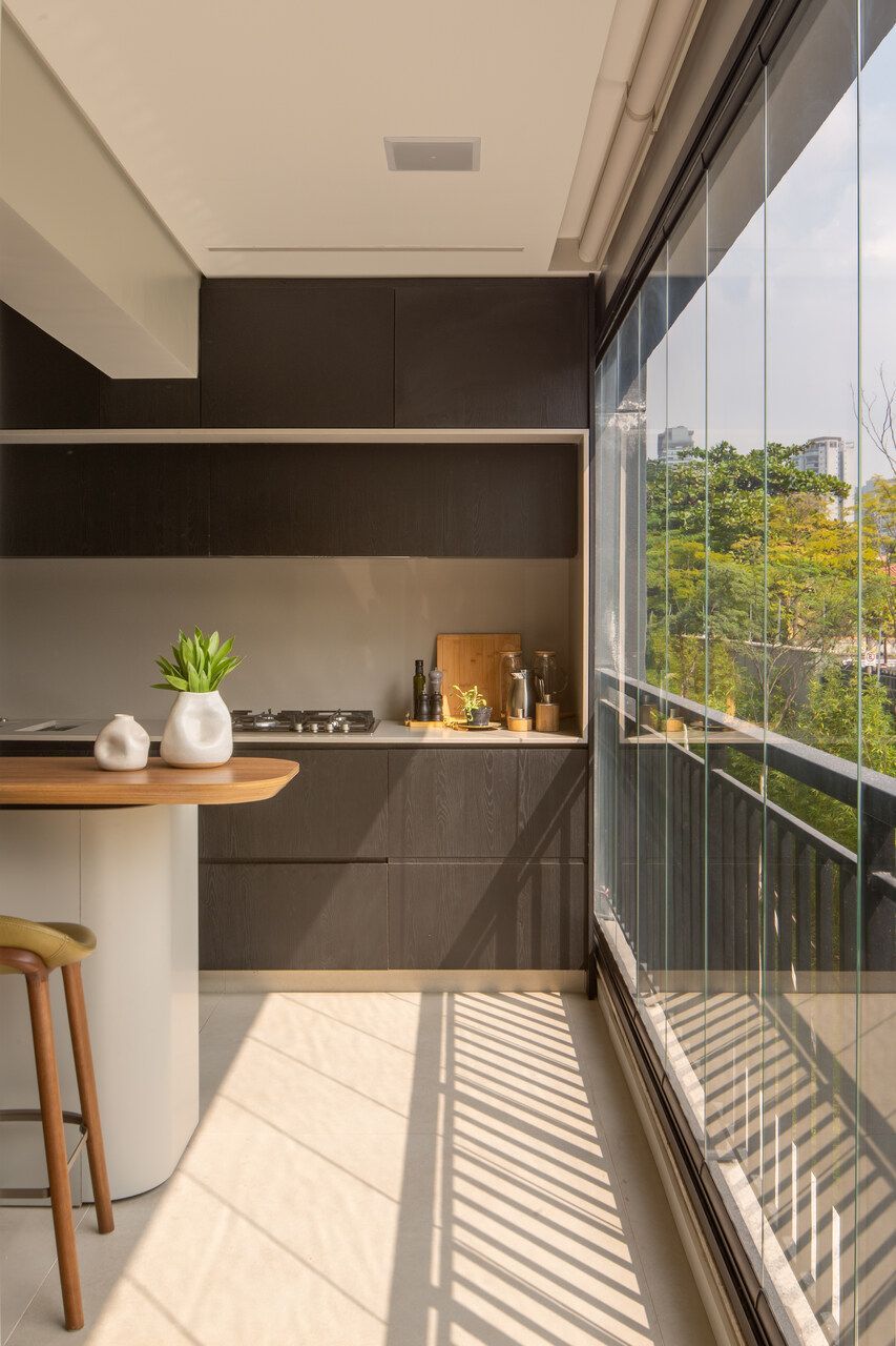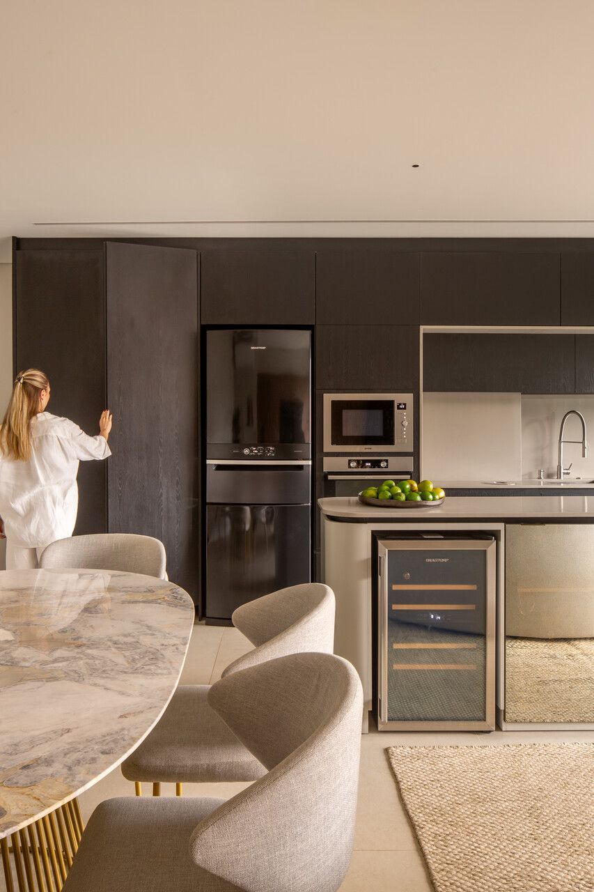 O projeto começou pela transformação total da cozinha, da varanda gourmet e da área de serviço. A cozinha, que antes ocupava um espaço secundário, passou a ser protagonista: foi reposicionada na área mais nobre do apartamento, de frente para a vista da cidade e para a Ponte Estaiada. Essa decisão, porém, exigiu um novo olhar para a área de serviço. A solução encontrada foi escondê-la em marcenaria integrada ao living, um recurso que une discrição, praticidade e estética.