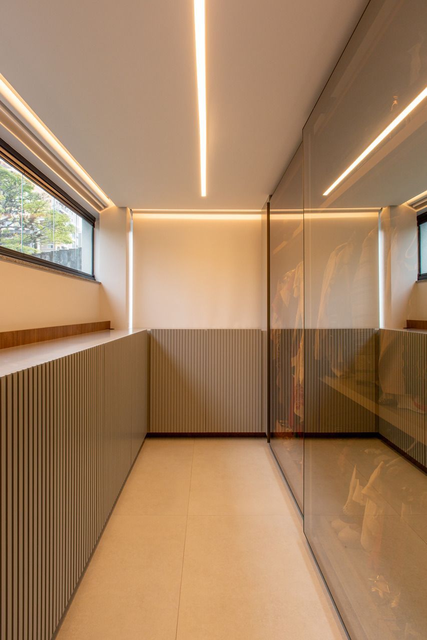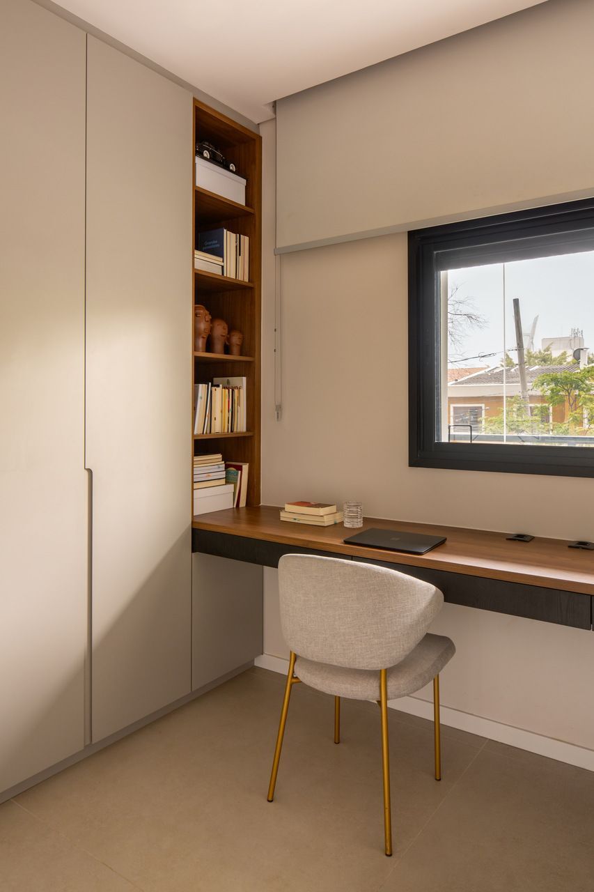Outro pedido essencial do casal era a criação de um closet, inexistente na planta original. Para atender a essa demanda, a arquiteta integrou e fechou a segunda varanda, antes marcada como “garden”, de um quarto de hóspedes, transformando-o em uma suíte master confortável e personalizada.