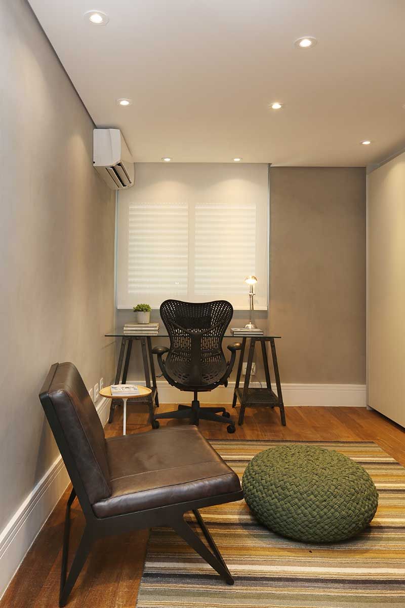 O cliente do escritório In and Out Decor queria um apartamento jovem, masculino, atemporal e aconchegante. O maior desafio para os profissionais foi deixa-lo o mais integrado possível, aproveitando a arquitetura do edifício que é antigo, com as vigas aparentes. E com cores neutras e toques de cores fortes em pontos chaves.