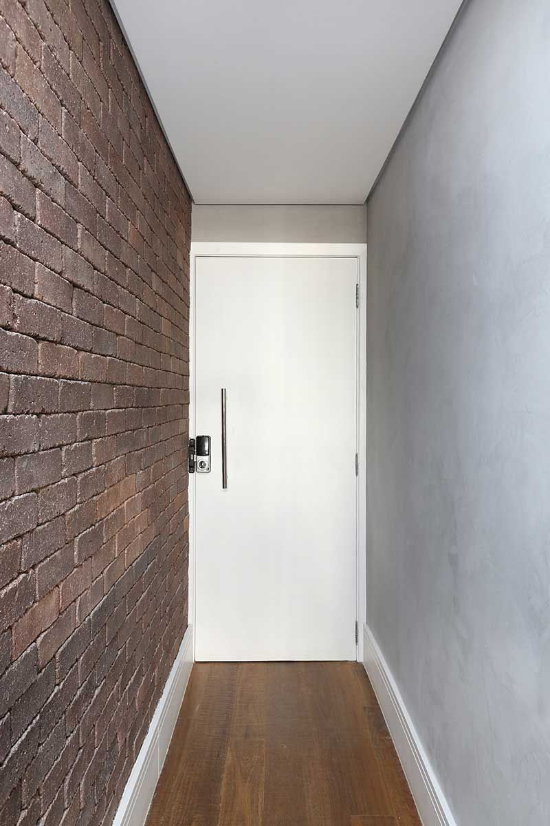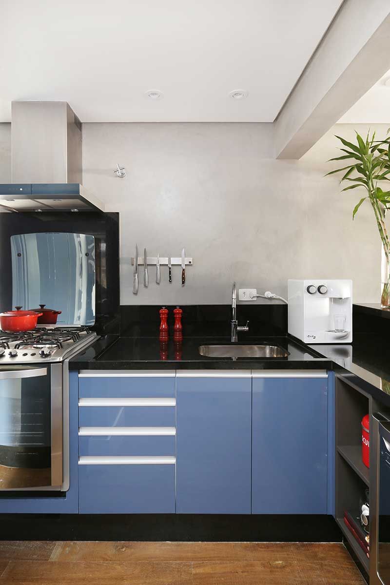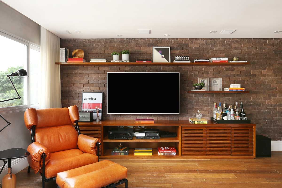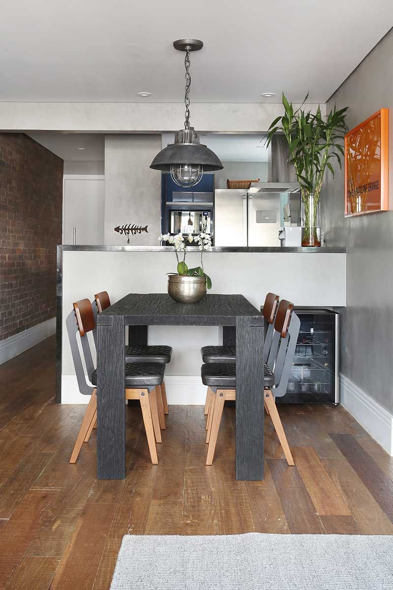 E outra foi misturar materiais frios e mais rústicos como o cimento queimado e o tijolinho aparente, que lembram mais um loft de NY, com a madeira no piso e na marcenaria para trazer mais aconchego.