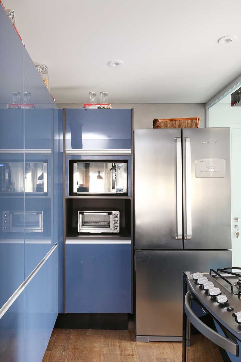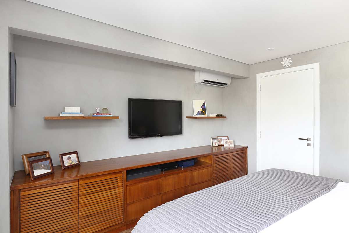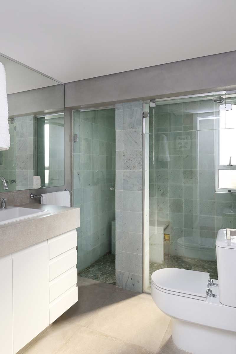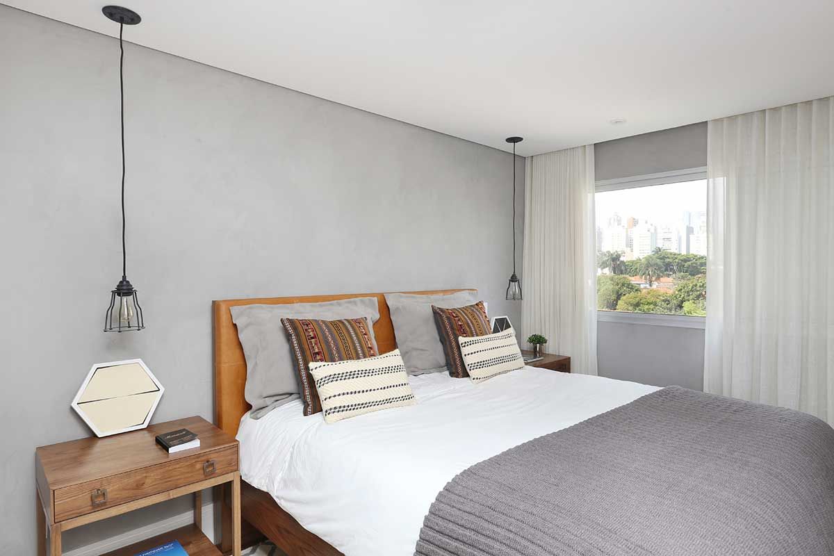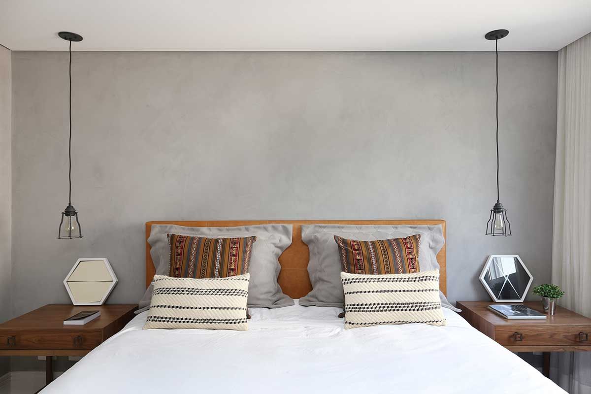 E outra foi misturar materiais frios e mais rústicos como o cimento queimado e o tijolinho aparente, que lembram mais um loft de NY, com a madeira no piso e na marcenaria para trazer mais aconchego.