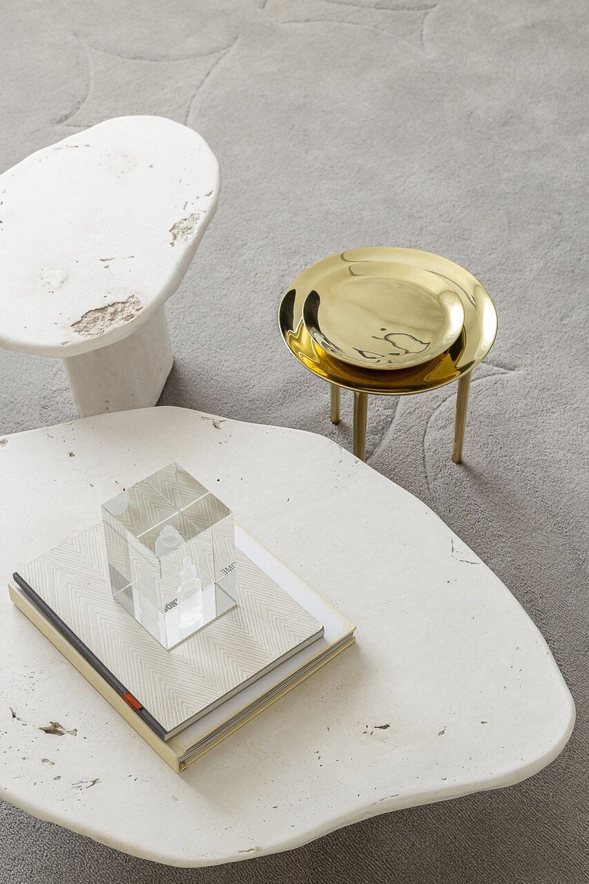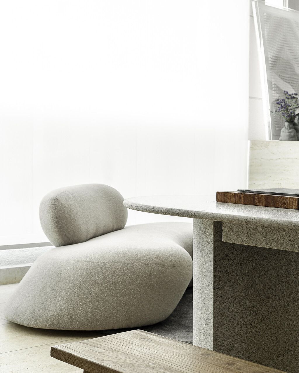 Os móveis foram pensados e escolhidos para serem utilizados em futuras residências. A mesa de jantar e os móveis da varanda, foram desenhados especificamente para atender às dimensões e estéticas desejadas pelo casal. A marcenaria não foi utilizada neste projeto, móveis com design autoral e linhas orgânicas são protagonistas no apartamento.