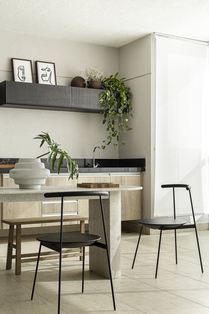 Os móveis foram pensados e escolhidos para serem utilizados em futuras residências. A mesa de jantar e os móveis da varanda, foram desenhados especificamente para atender às dimensões e estéticas desejadas pelo casal. A marcenaria não foi utilizada neste projeto, móveis com design autoral e linhas orgânicas são protagonistas no apartamento.